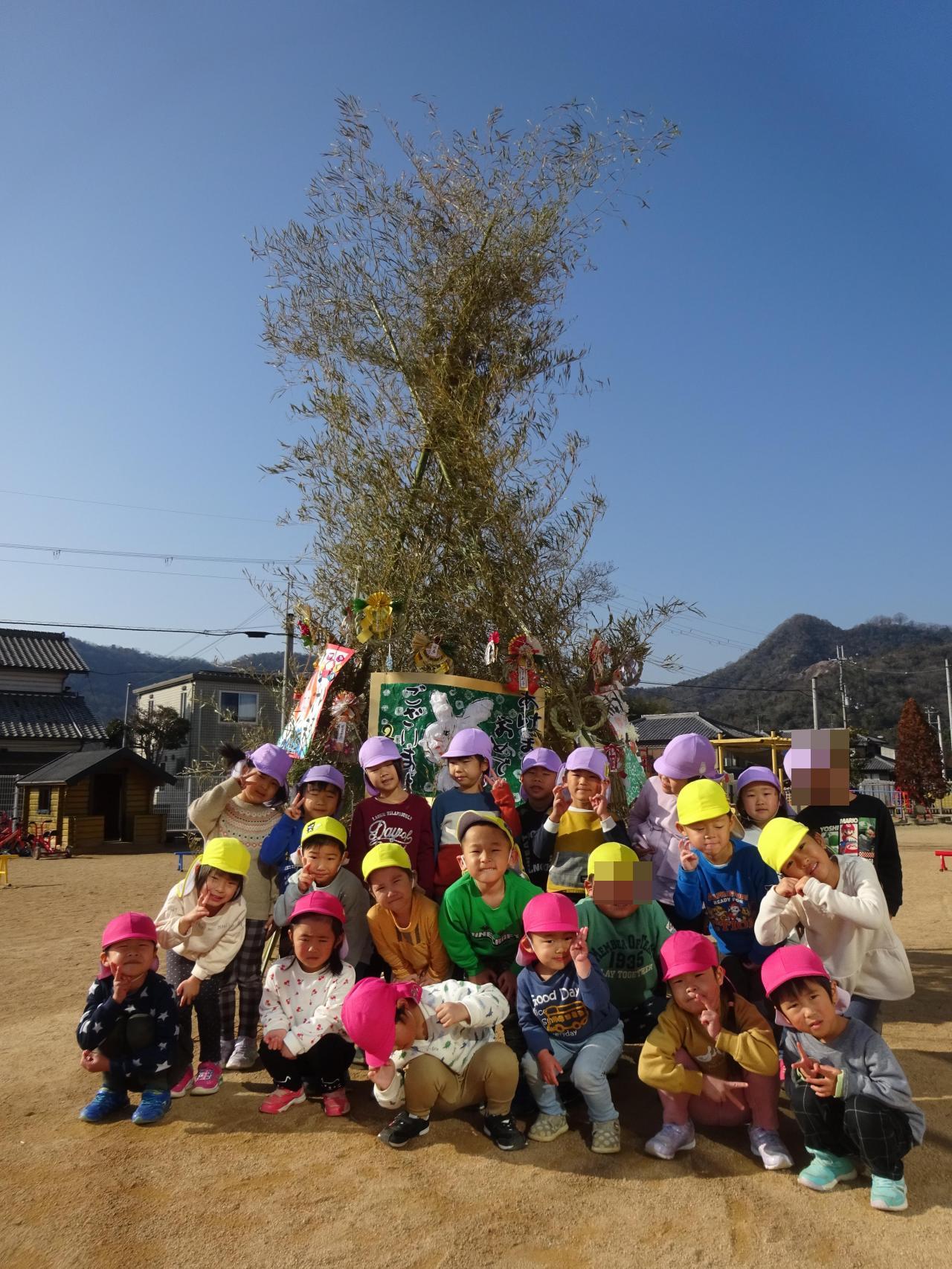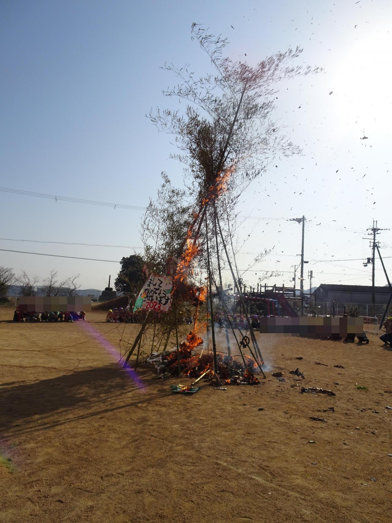 しっかりお話をきいて、とんどの前で記念撮影📷