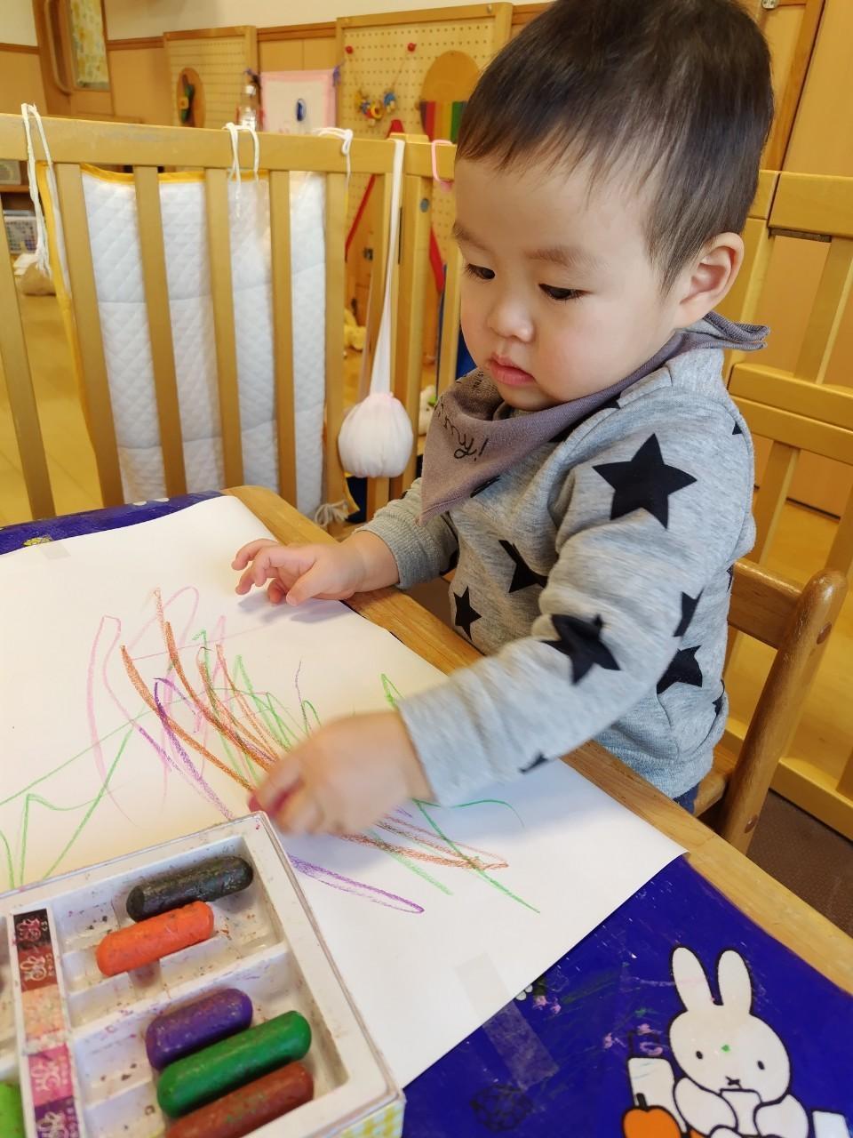 力強く描く子もいれば、繊細に丁寧に描く子もいたり月齢の高い子はぐるぐる丸を描いたりする子もいます😄
