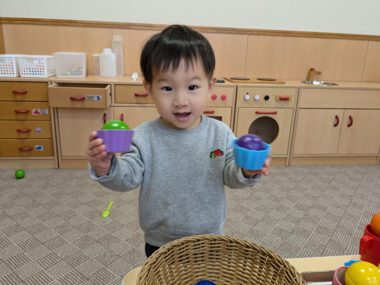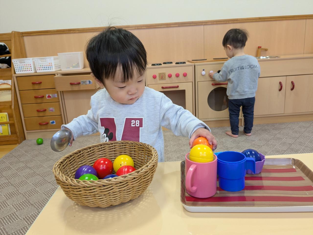 スプーンなどにも興味をもっている子どもたちは、おままごとの食具に触れて、スプーンで玩具をすくったり手でコップに入れてみたりしてたんぽぽ組さんならではの遊びをしています!
