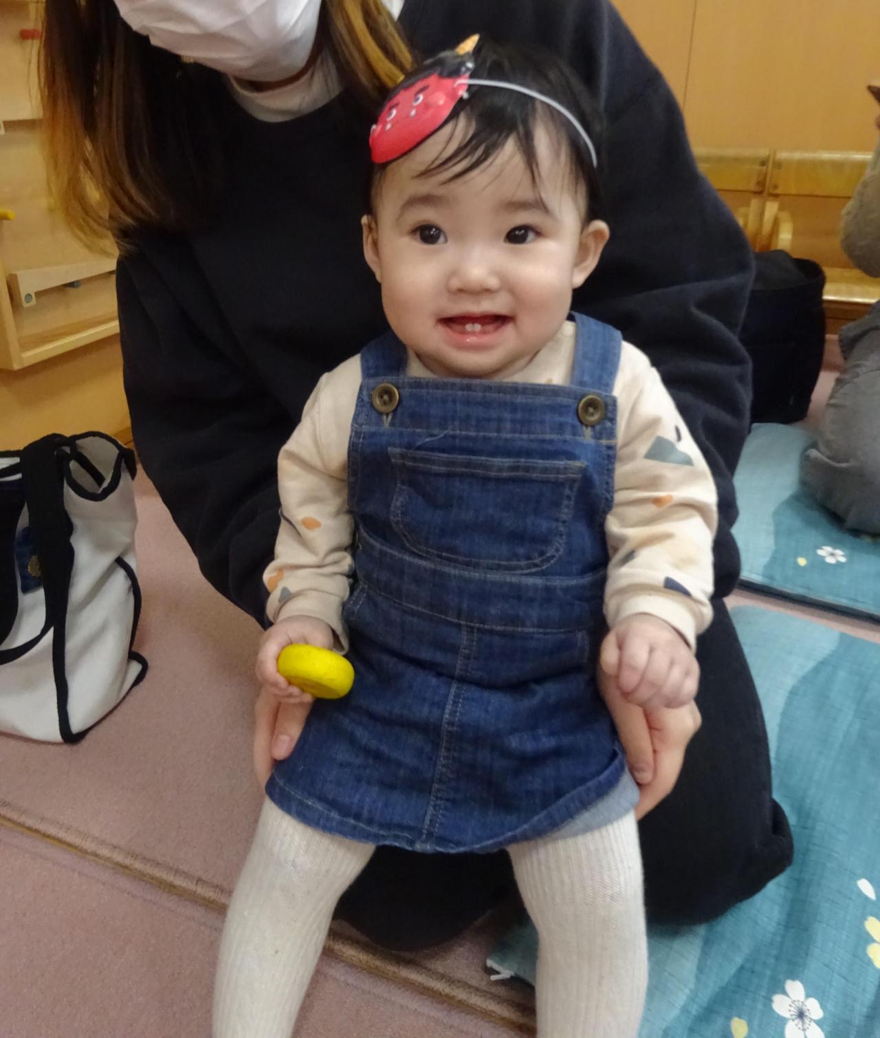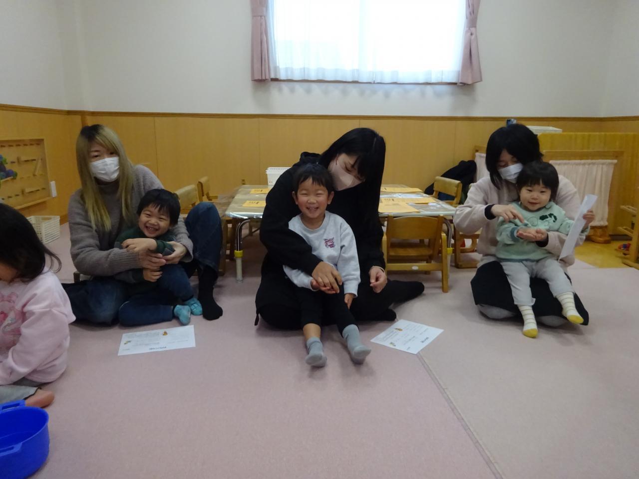 絵本の前に、わらべうたを楽しんでもらっています♪ママの膝に座ったり、くすぐってもらったり…大好きなママとのふれ合い遊びはこどもたちも嬉しそうです💕