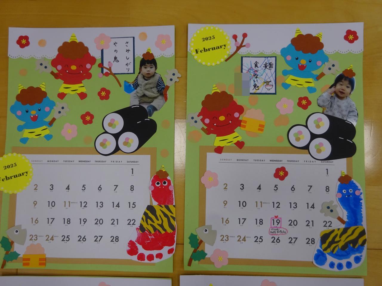 カレンダーづくりでは、毎回足型アートも貼ってもらっています👣今回の足型アートは「鬼さん」でした🥰他にも豆や恵方巻も貼って、節分の雰囲気満載のカレンダーとなりました🤩