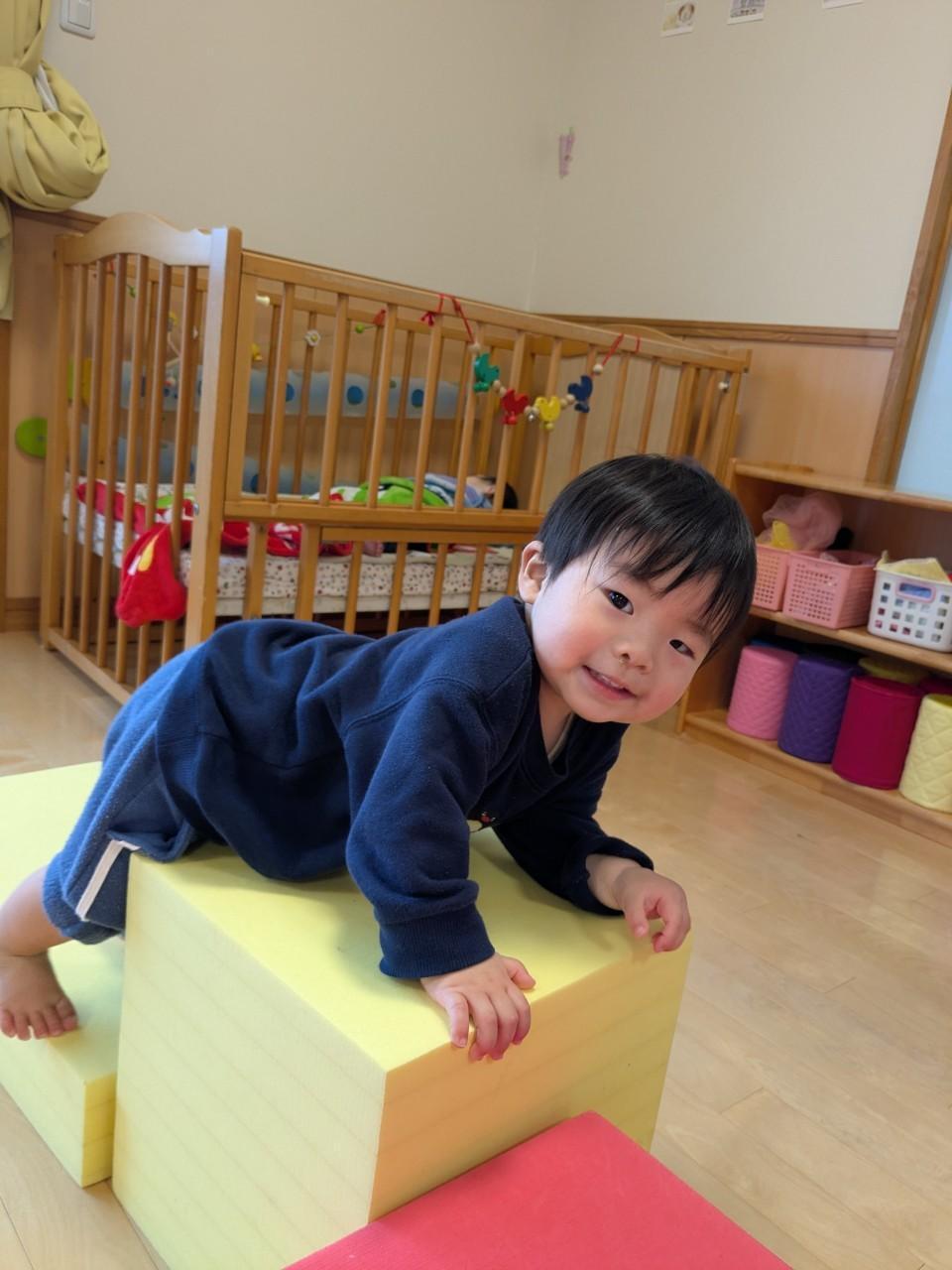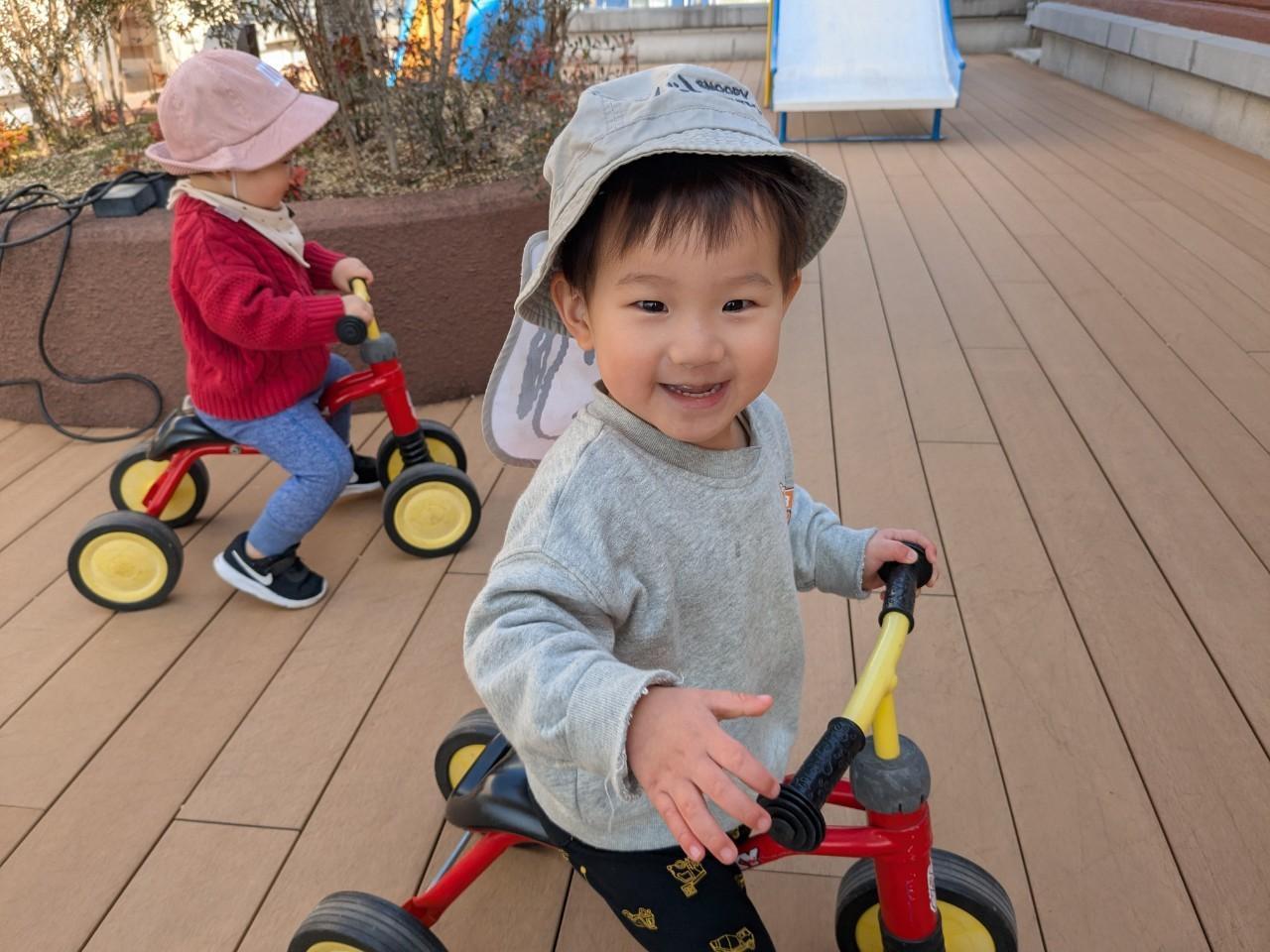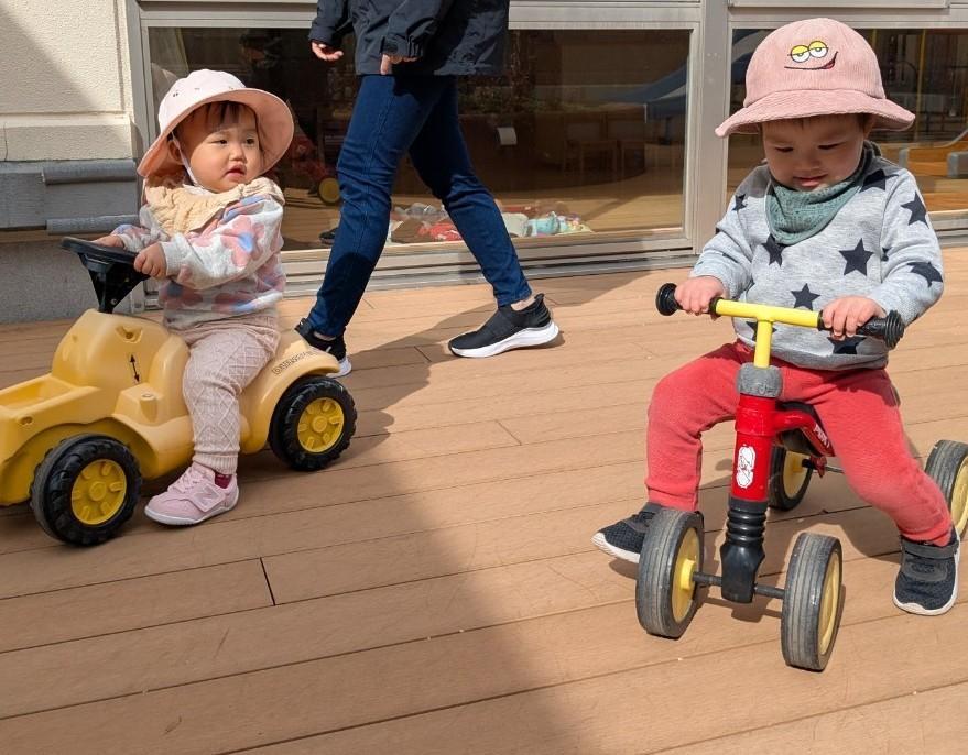 晴れた日は、テラスでも元気に遊んでいます。初めは、乗用玩具🚗に乗っても自然と後ろに進んでいた子ども達も、足の力がつき、しっかり前に進めるようになりました。