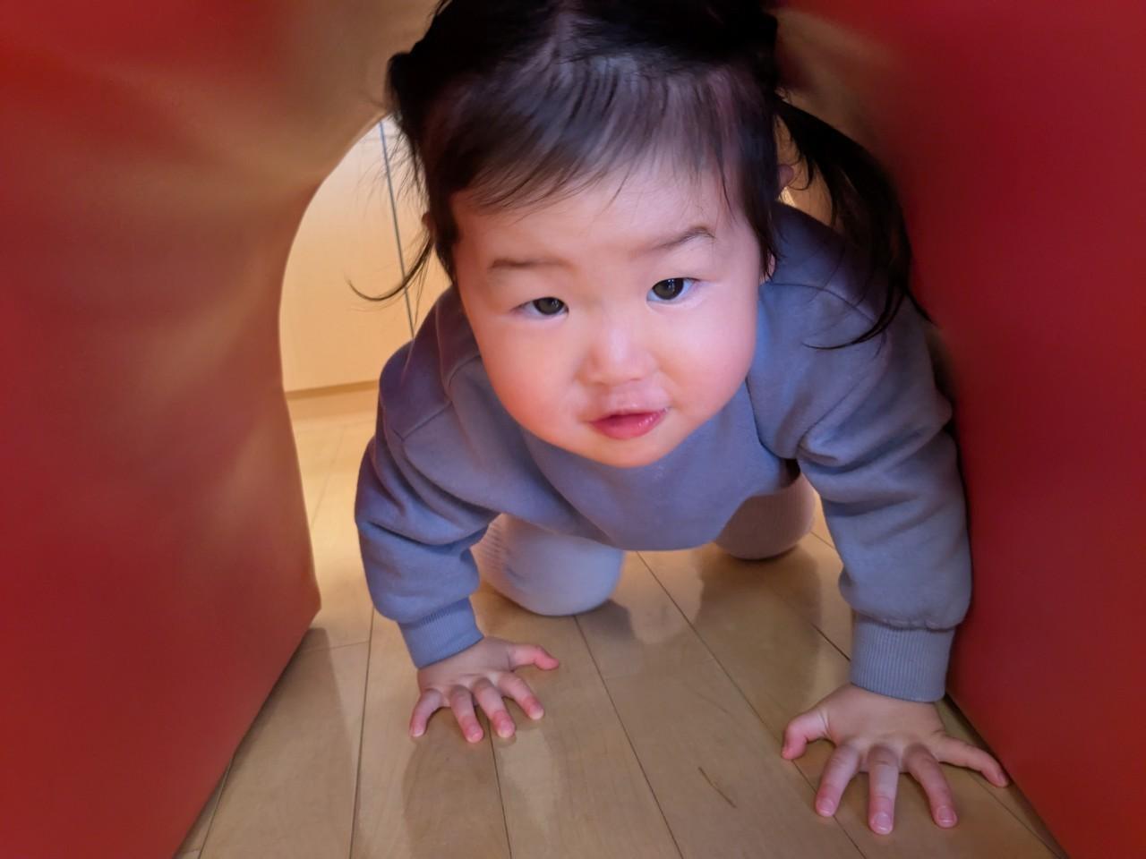 しっかり歩けるようになった後も、ハイハイは背筋や全身を使うちょうどいい遊びになるので、いろいろな方法で楽しんでいますよ🐤