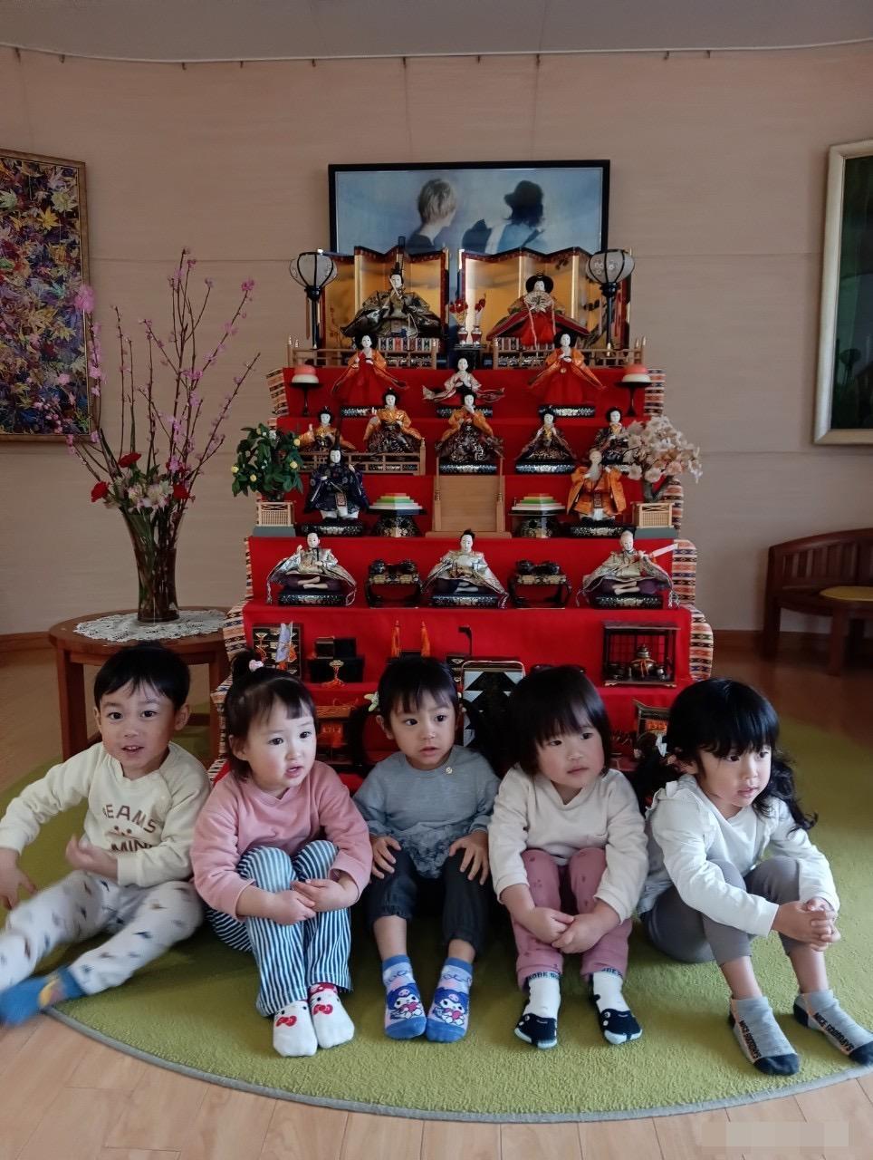 玄関ホールには、とても立派なお雛様が飾られていました。子ども達は雛道具や菱餅、丸餅に興味津々な様子でしたよ!