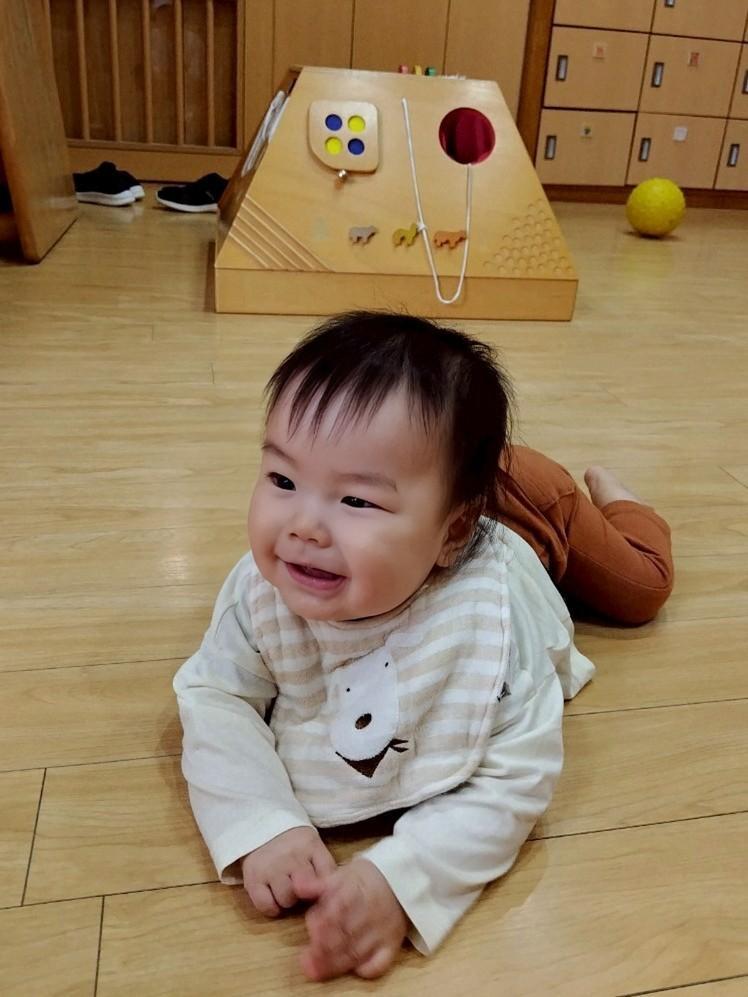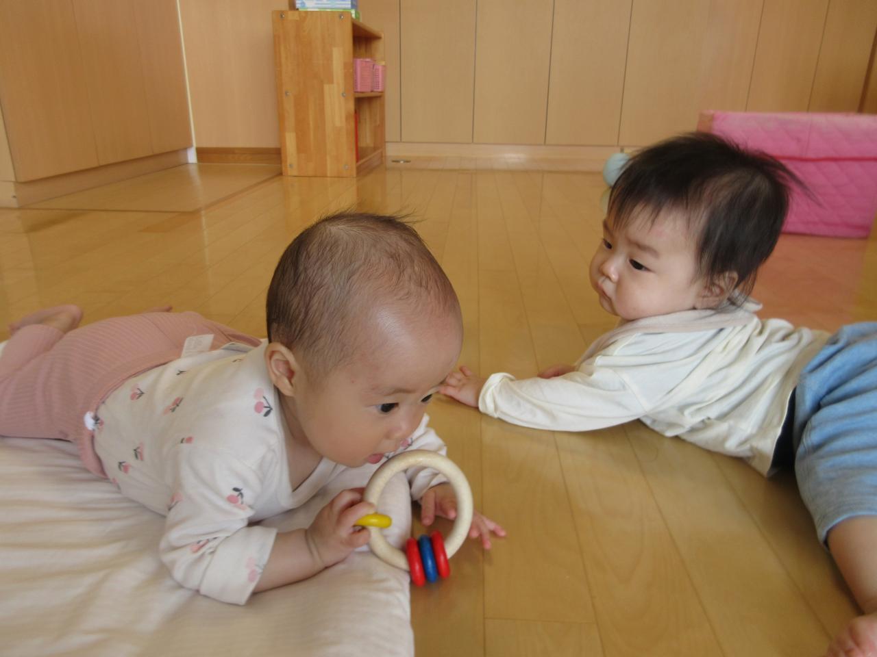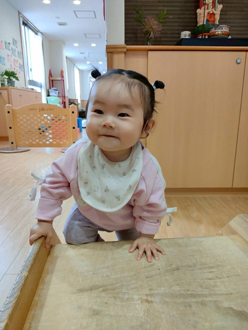 子ども達は、4月当初よりずり這いが速くなったり、つかまり立ちから手を離して、立って見せてくれたりするようになりました😀新しいことができるとパチパチ👏と手をたたいてうれしさを表してくれますよ💕そんな気持ちを大切にしながら、廊下や室内でゆったりと遊べるようにしていきたいと思っています。