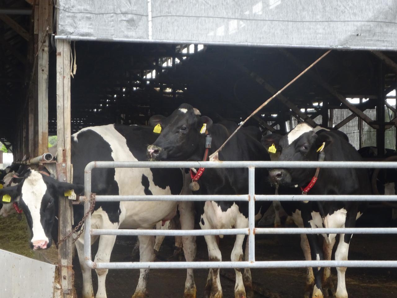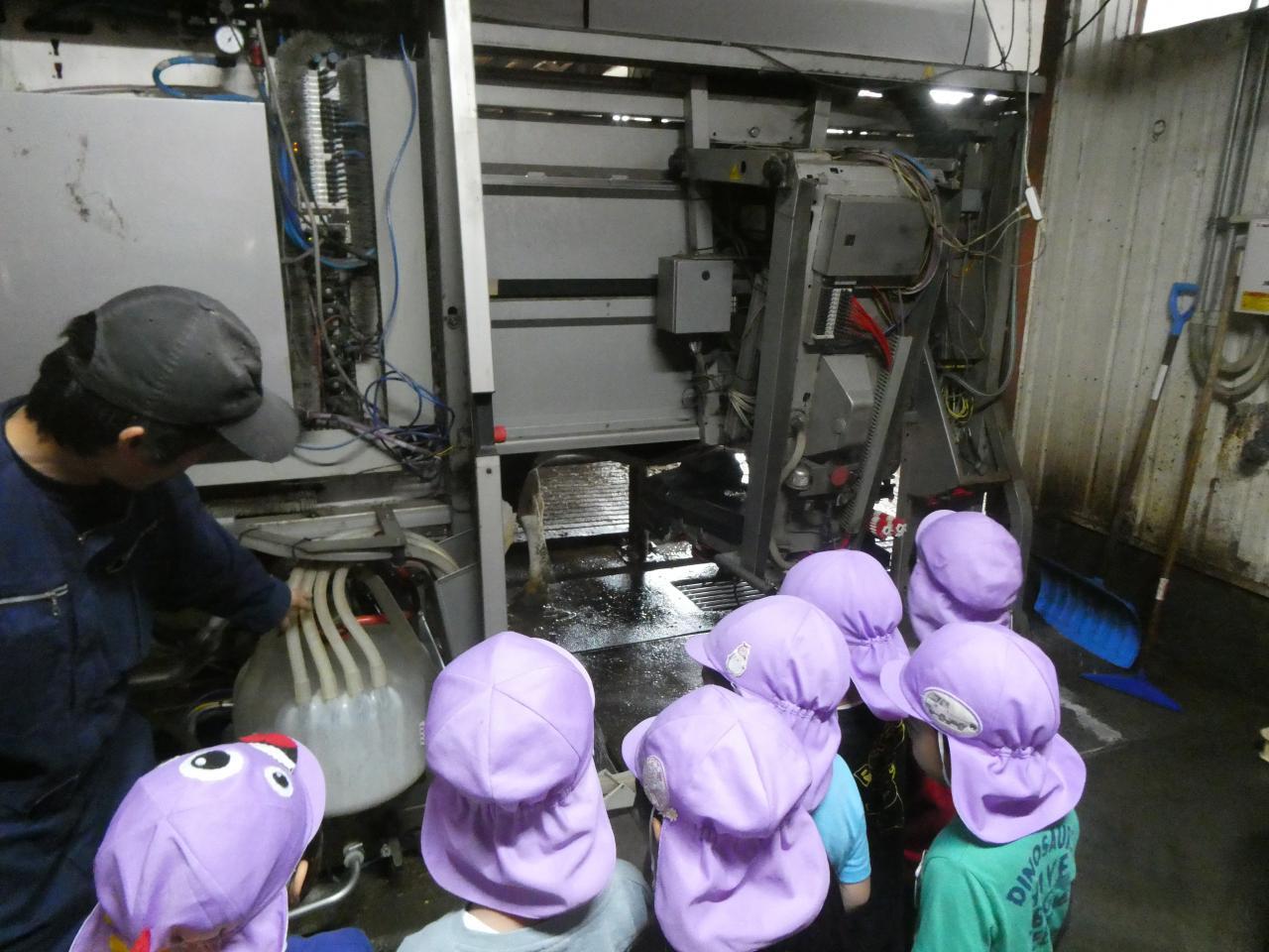 機械で絞られた牛乳がタンクに入っていく様子、また時折牛さんがみんなのことを見てくれるので、