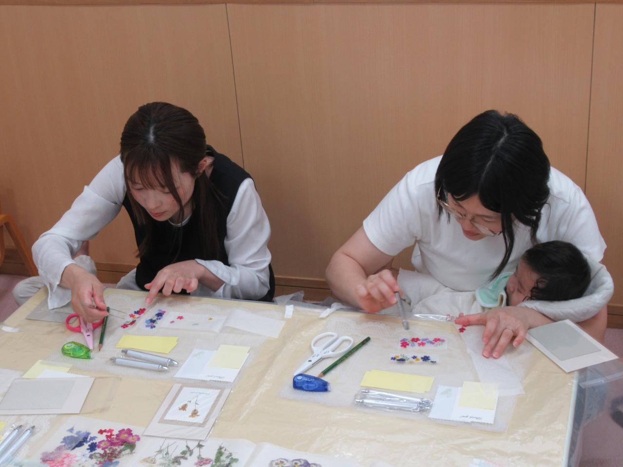 母の日にむけて、押し花のシャープペンシルづくりをしました🌷2本作ったので、1本はお母さんに、もう1本は自分用に💕と言われるママたちがほとんどでした🥰お花の色合いや配置にこだわりながら、真剣な表情で楽しまれていました✨