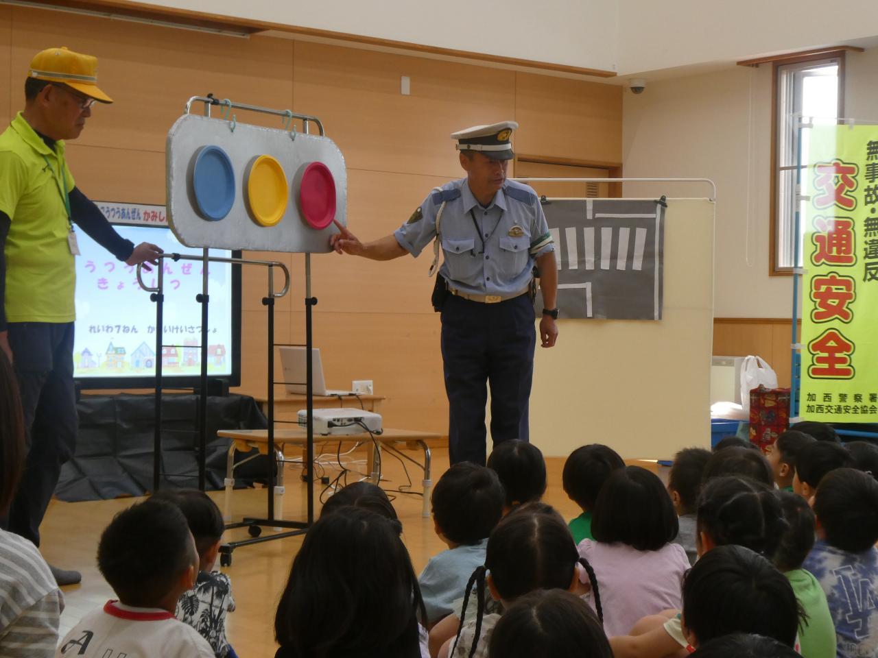 警察署と交通安全協会の方にお越しいただき、1部は幼児クラス全員を対象に信号機のお話を聞いたり、横断歩道の渡り方を、お話や紙芝居で教えていただきました🙂