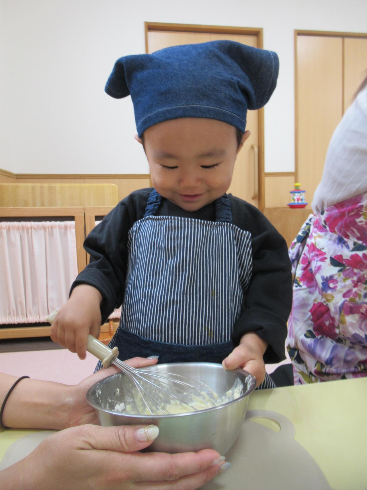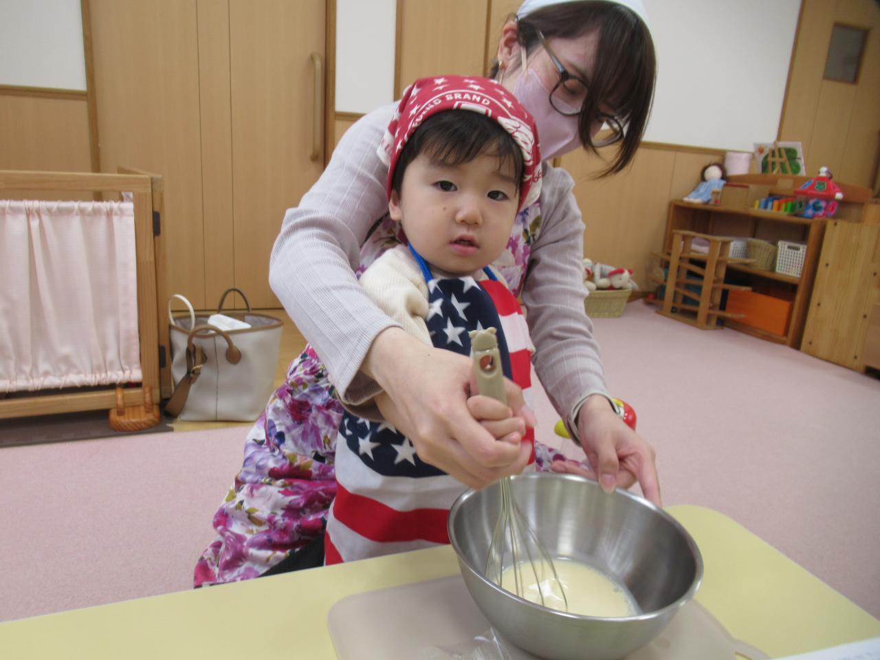 今回作ったのはワッフル💕材料をボウルに入れたり、泡立て器で混ぜたり…みんなママと一緒に頑張りました✨ふんわり焼きあがったワッフルに、ホイップクリームやいちごでトッピングもしました😄