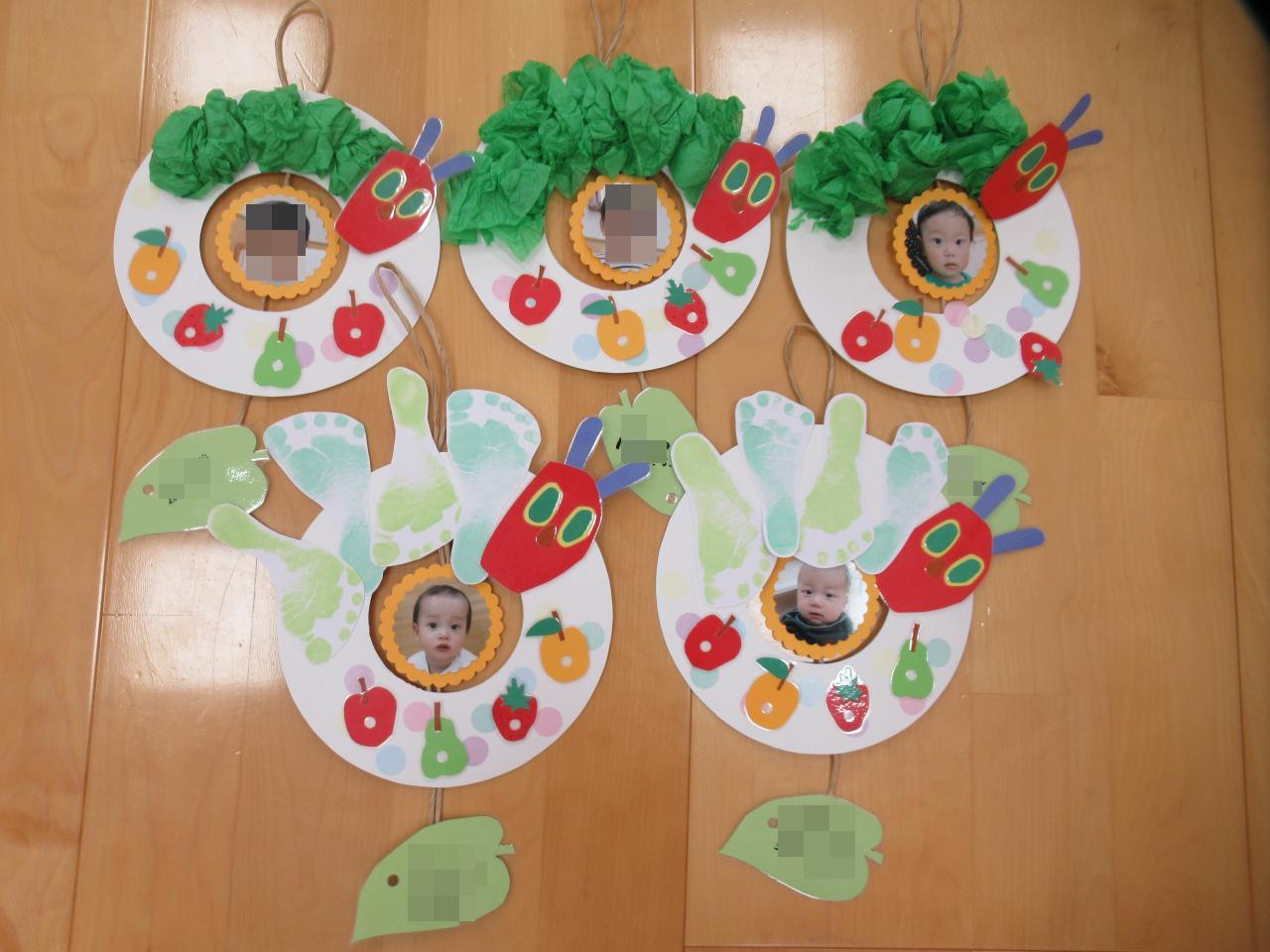 今回ははらぺこあおむしのリースを作りました🙌1、2歳児さんはお花紙を丸めたり、シールを貼ったり…0歳児さんは足型をとってあおむしを表現しました😄