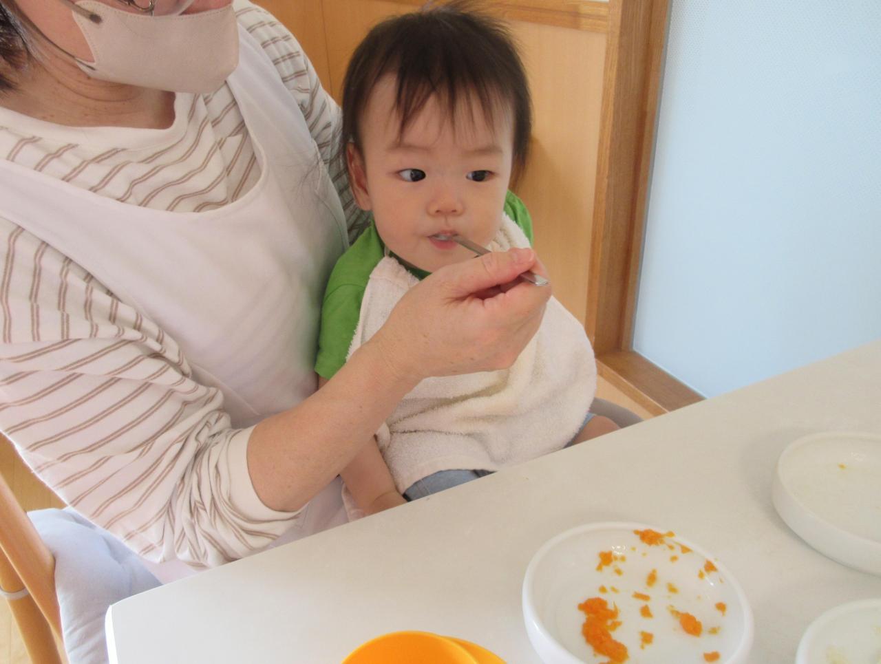 ミルクを飲んでいた子ども達も離乳食が始まり、おいしそうに食べていますよ🍚。食事の時間が楽しみになるように、ゆったりとした雰囲気で進めていきたいと思っています。