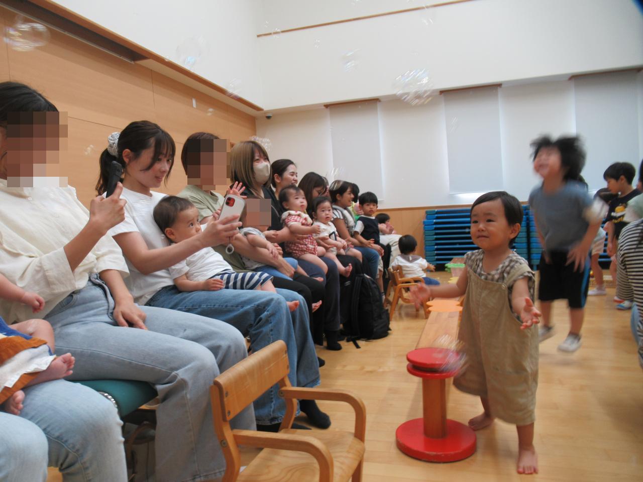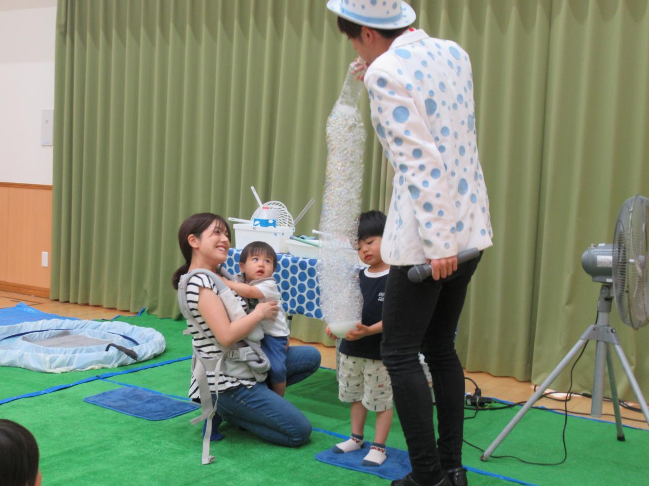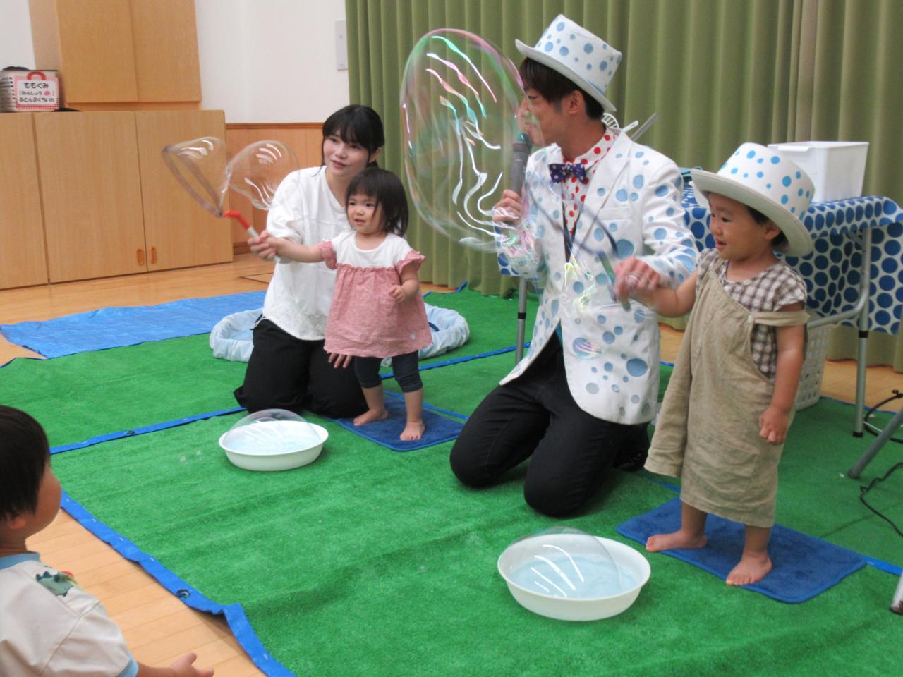 パフォーマーのバブリン先生によるシャボン玉ショーがありました😆はじめはドキドキしていた子どもたちでしたが、たくさんのシャボン玉が目の前にとんでくるとすぐに笑顔に😆
