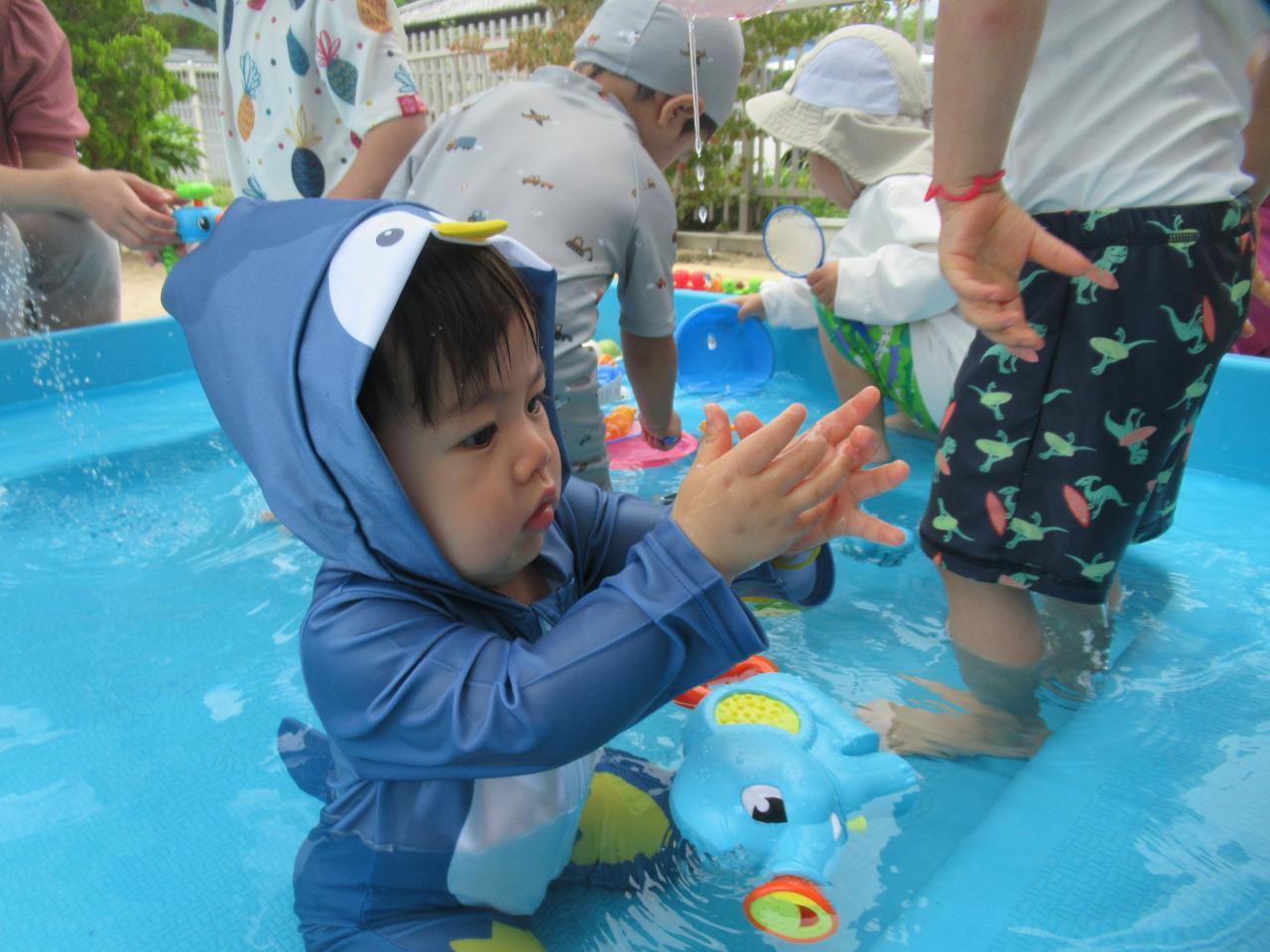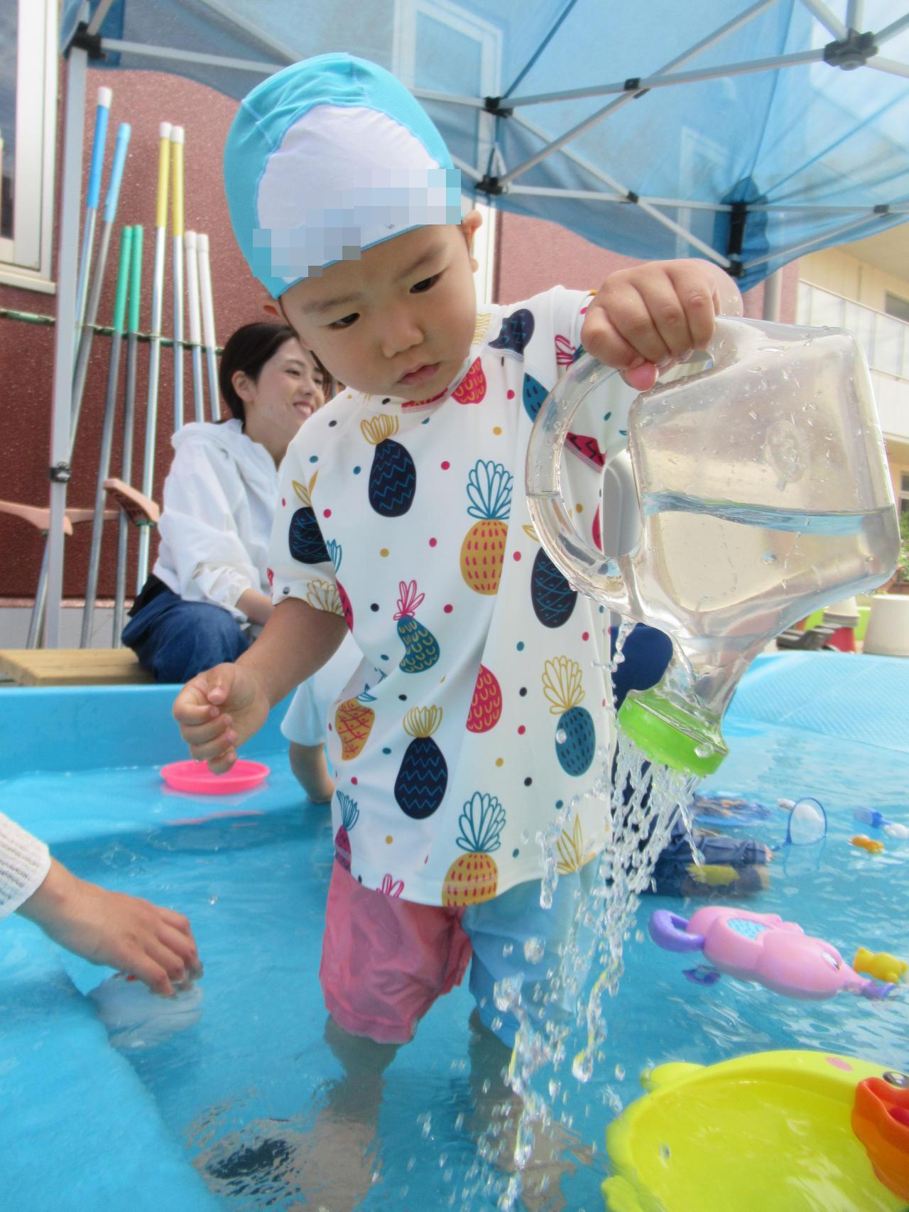 いちごくらぶでもプール遊びが始まりました🙌かわいい水着に着替えてウキウキしながら園庭へ🥰冷たい水にびっくりするかな…と思っていましたが、そんな心配をよそに好きな遊びをみつけて黙々と遊ぶこどもたちでした😆