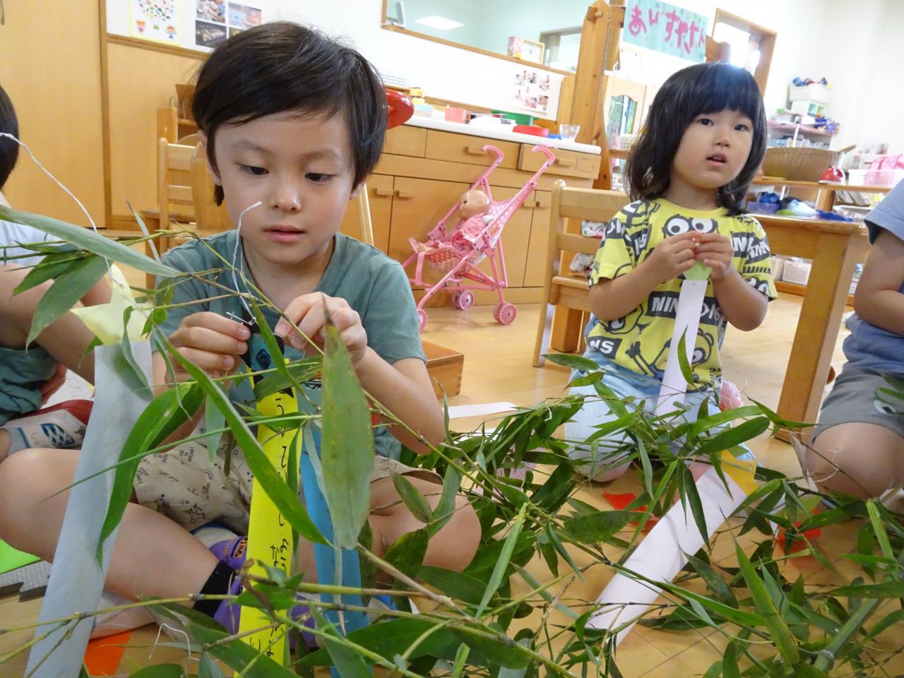 いつの間にか梅雨も明け、晴れた夏の日が続くようになりましたね💦子ども園では明日の七夕に向けて笹にお家で書いた短冊や笹飾りをつけました🌟「プールにたくさん入れますように」「雲梯上手になれますように」などの可愛い願い事が書かれています💕