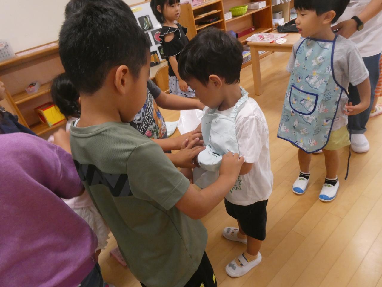 慣れないエプロンに大苦戦💦年長さんに助けてもらいエプロンをつけることが出来ました🥰