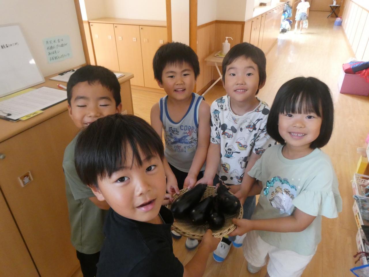 年長さんが育てている夏野菜《なす》がたくさん実をつけ収穫することが出来ました🍆