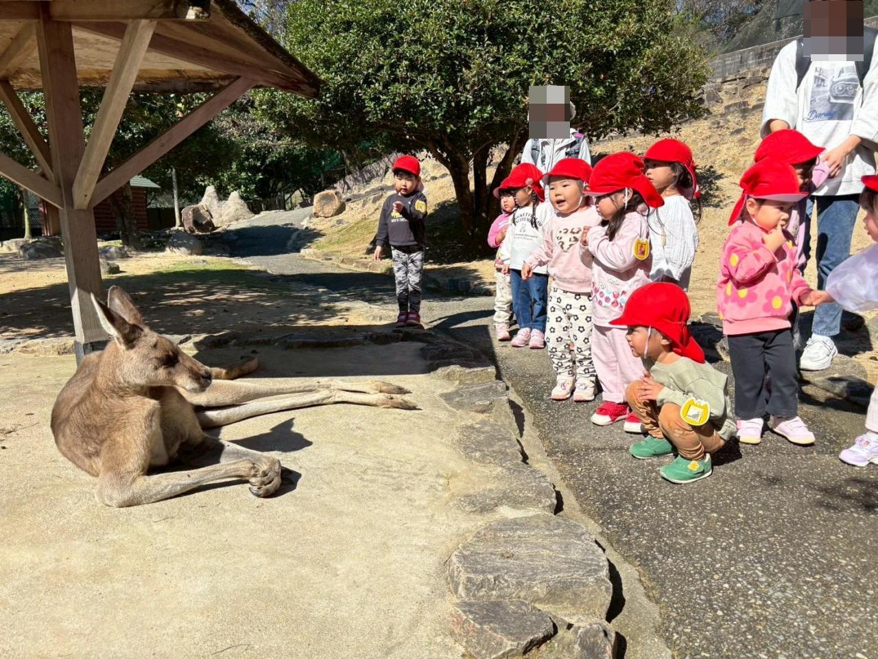 カンガルーはすごく近くで見れました。とっても大きかったので最初は少し怖がっている子もいましたが大人しいカンガルーさんでお互いじーっと見つめ合っていました😂