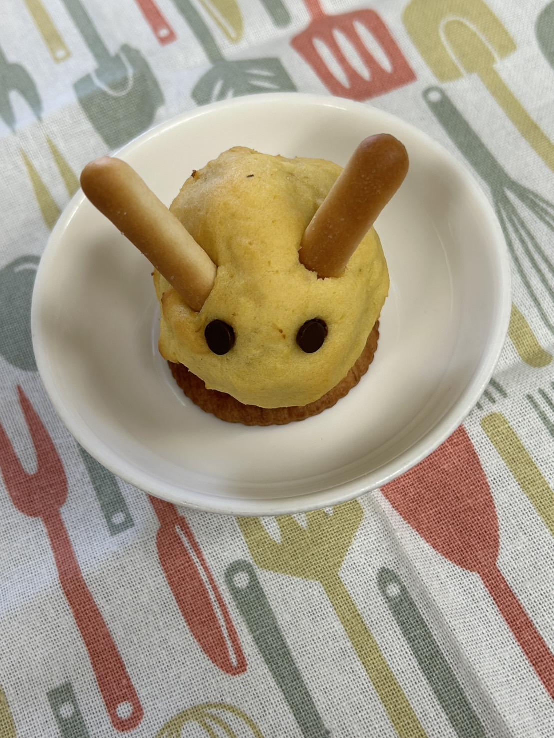 スイートポテトに、チョコの目とビスケットの耳をつけています。うさぎさんに見えますか😳?