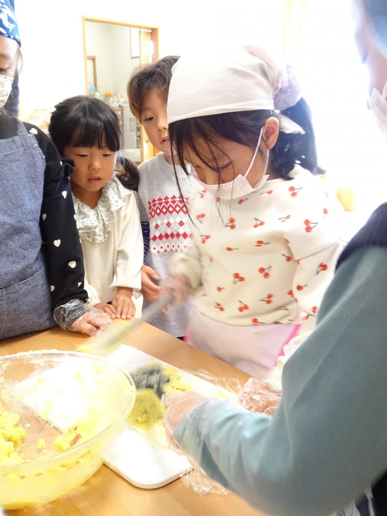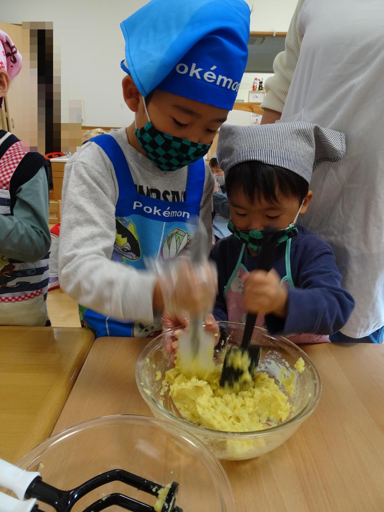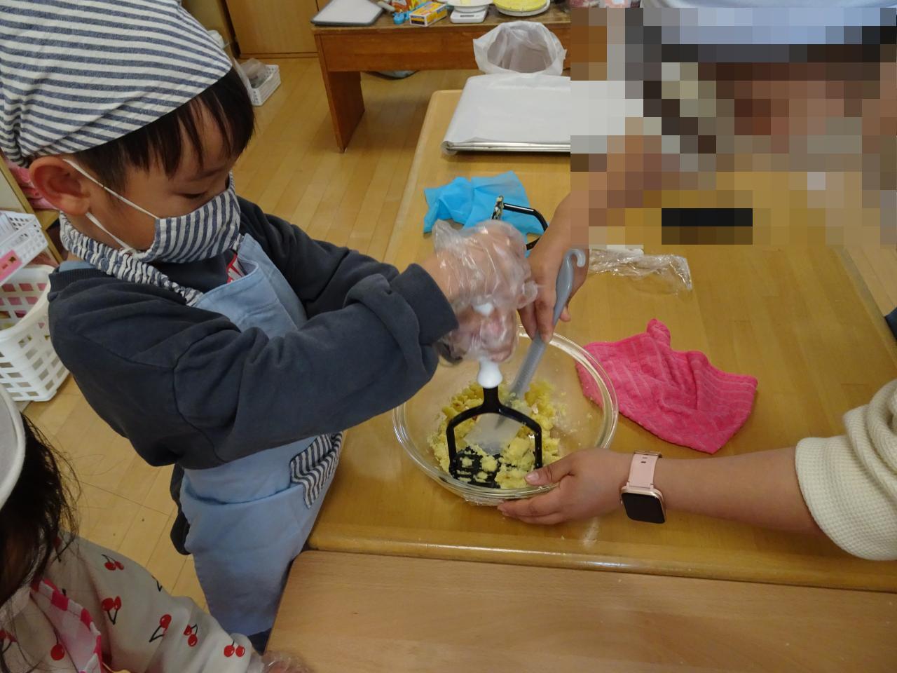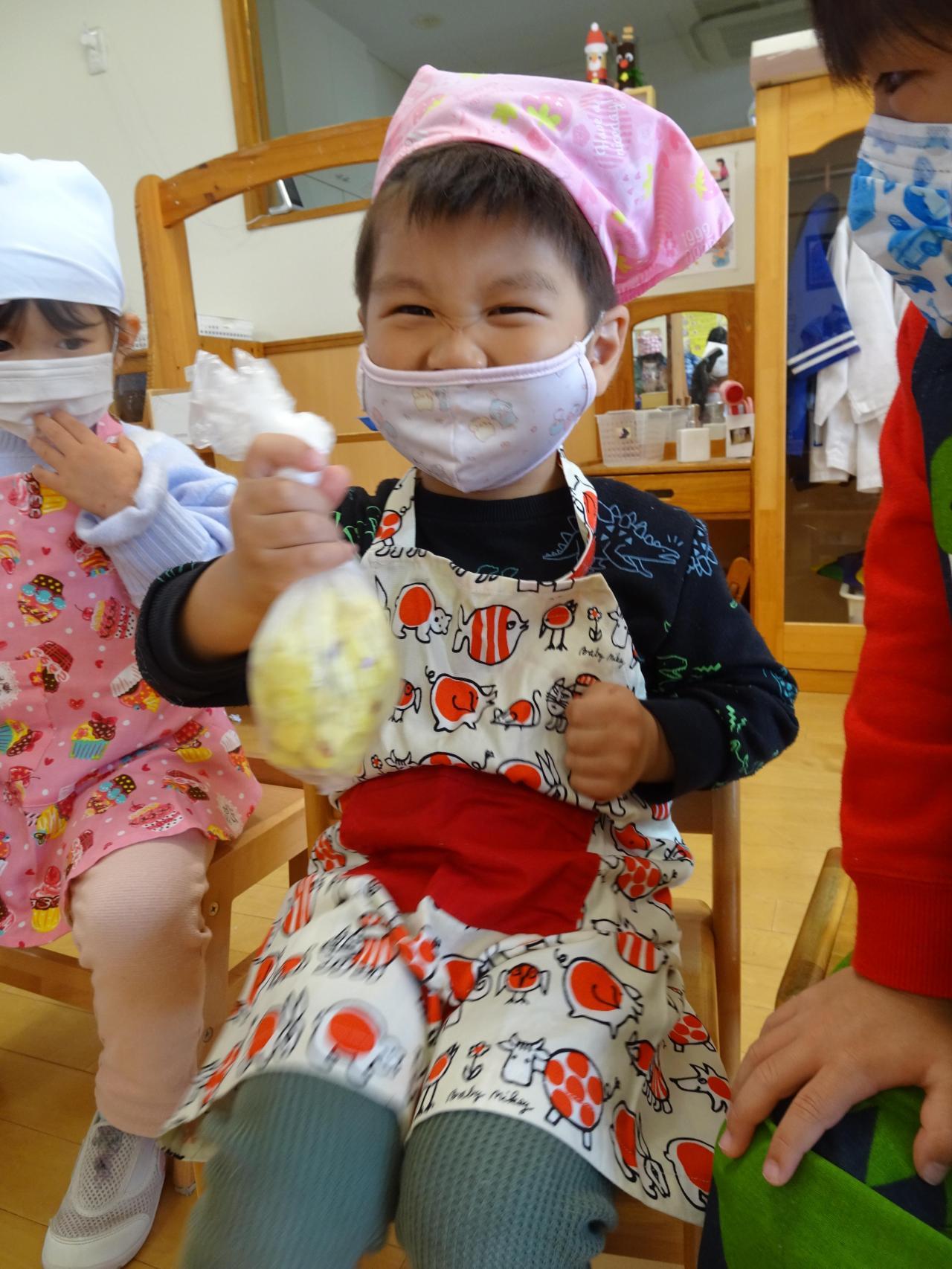 袋に温かいさつまいもをいれてピンク帽子さんは手で<もみもみ>つぶしていきます!黄色・紫帽子さんはマッシャーを使いつぶしていきます!こぼさないように慎重につぶしていました😌