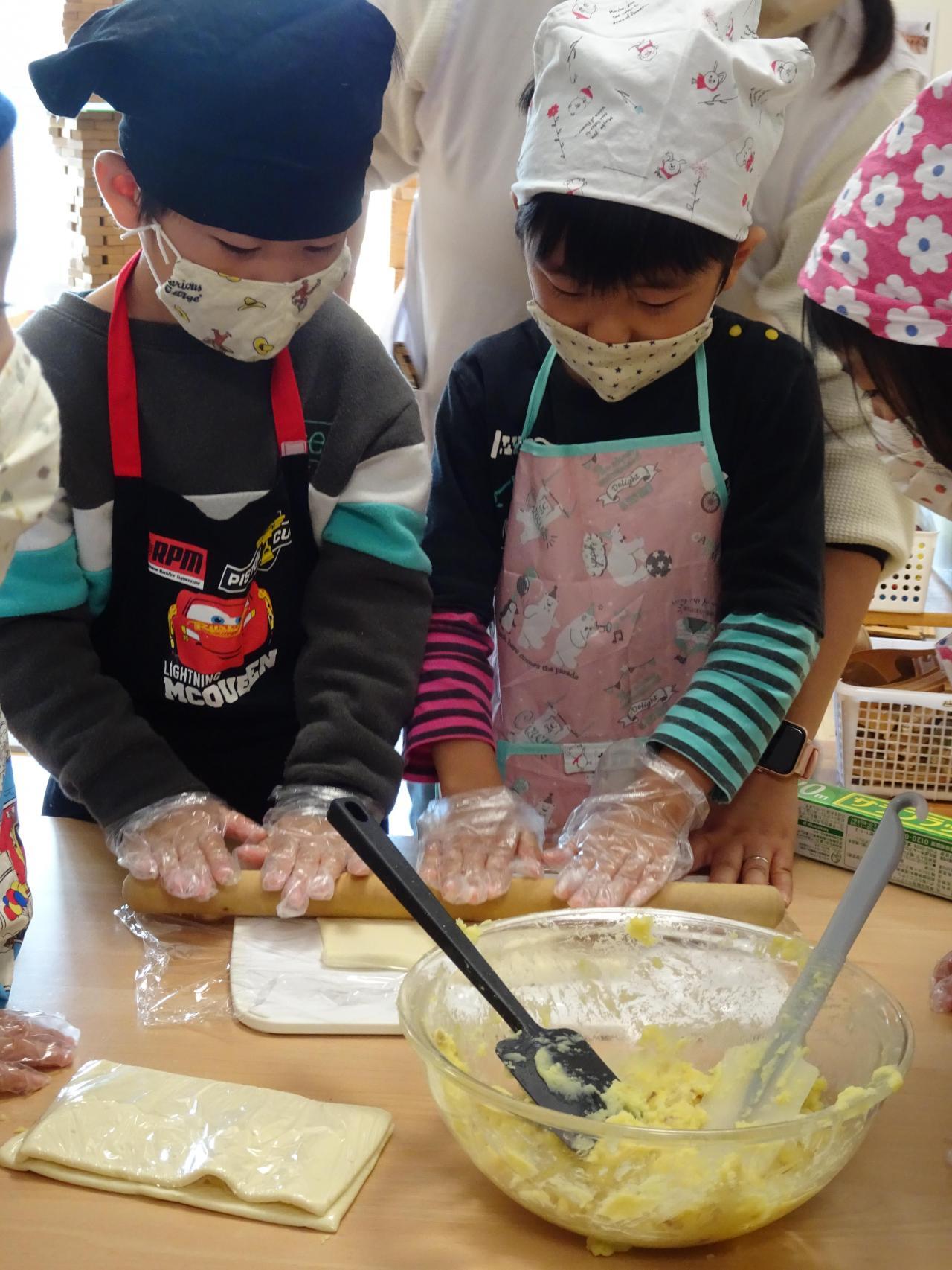 いよいよパイシートにさつまいもをいれてくるくるタイムの時間です!生地を麺棒で伸ばし「あ!粘土みたい!!」と興味津々でした。