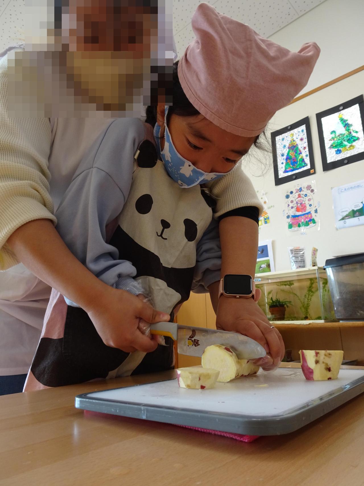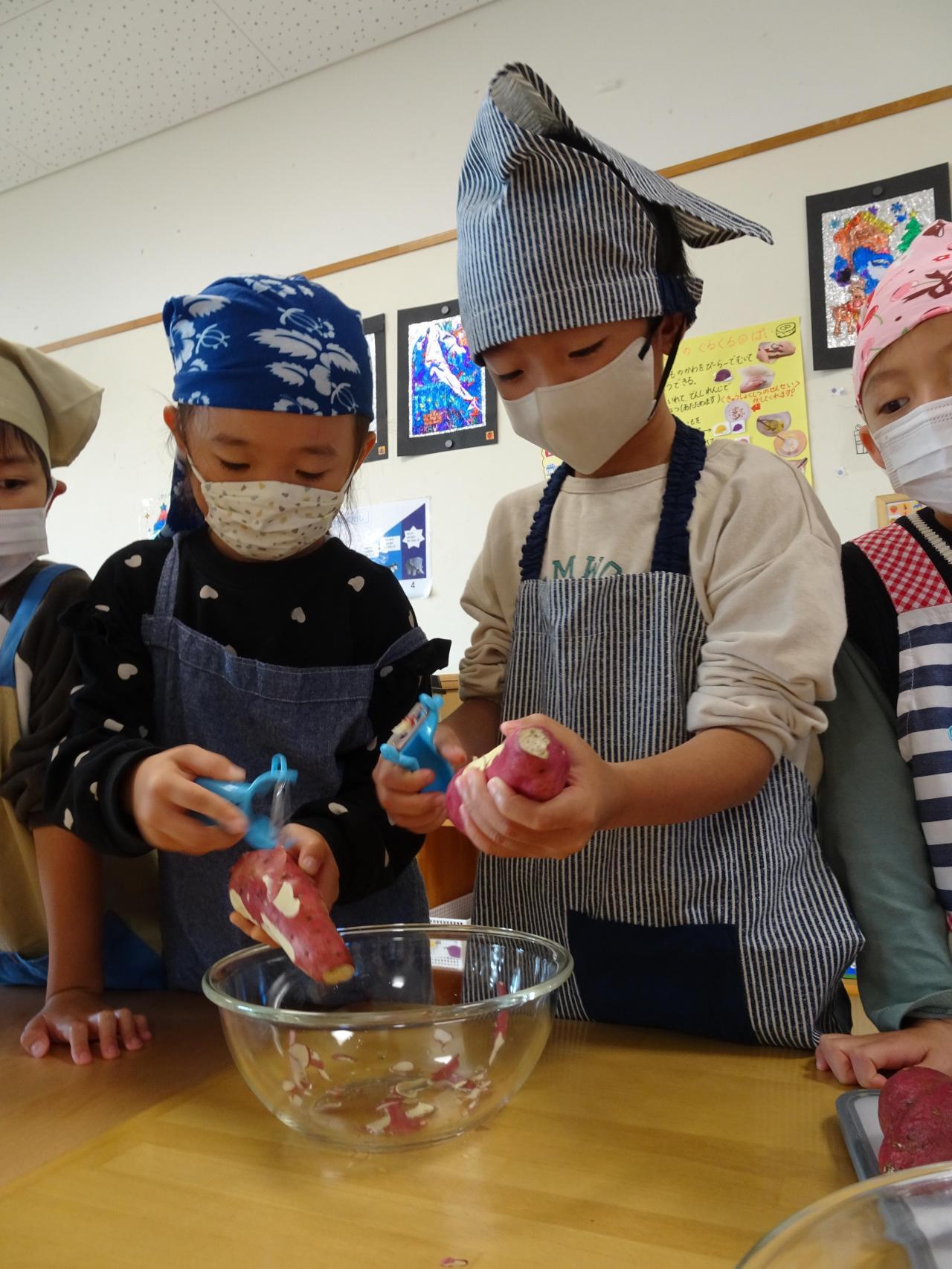 さあ、クッキングの始まりです✨年長さんがさつまいもを洗い、ピーラーで皮を剥いたり、包丁を使って小さくしましたよ!