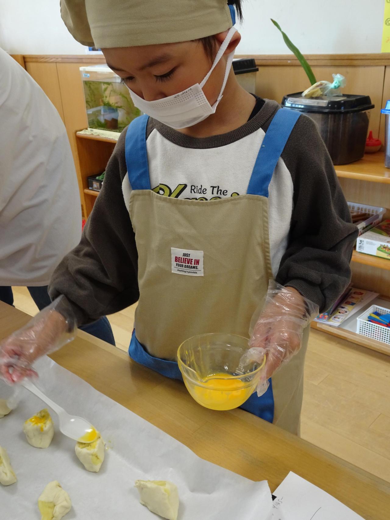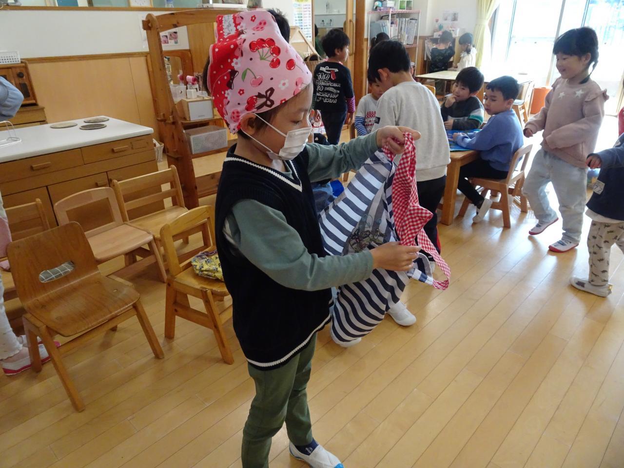 エプロンをつける時はみんなで助け合い後ろの紐を結んであげたり、三角巾をかぶせてあげたりと協力して準備をしていました。