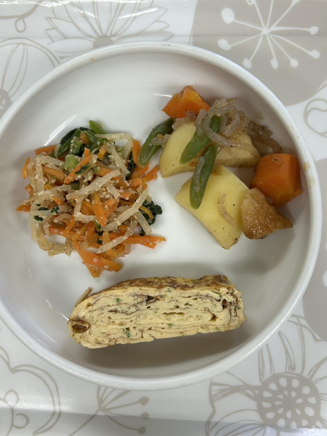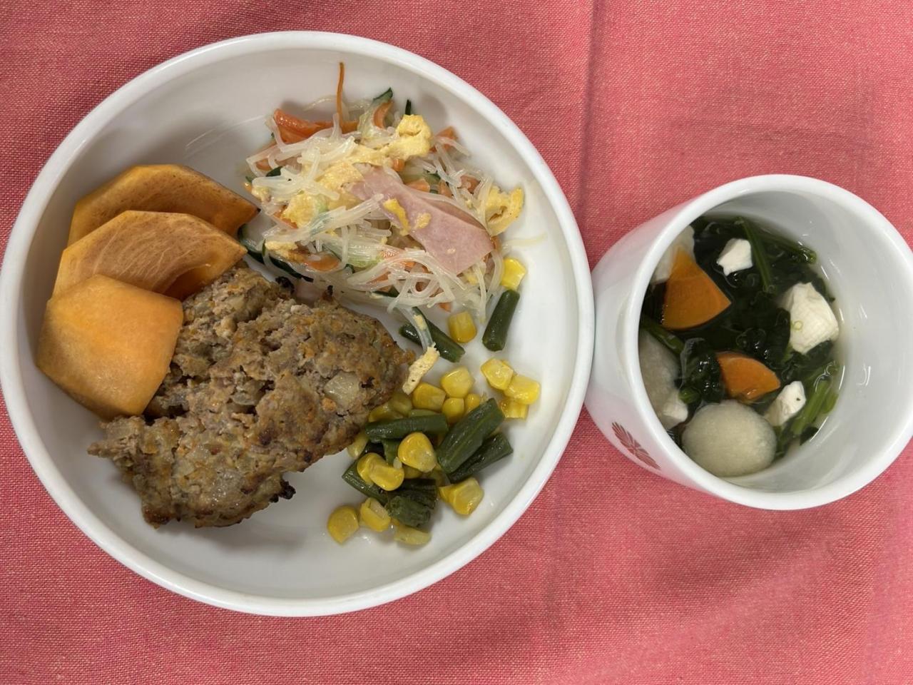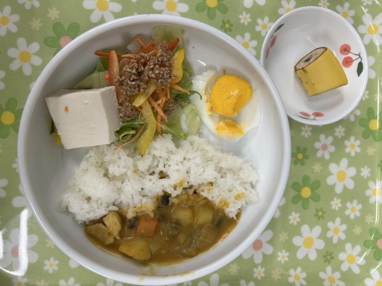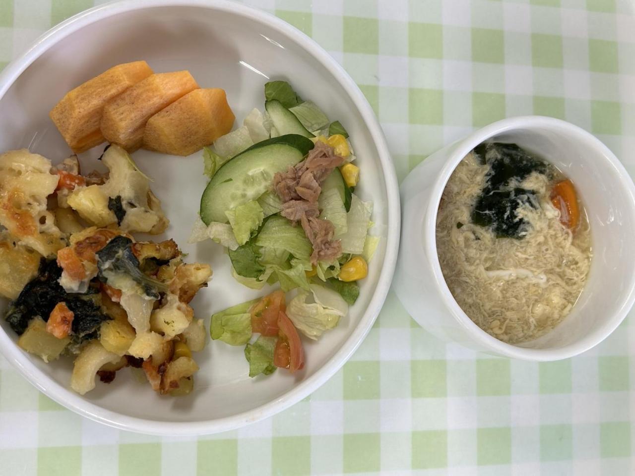 「グラタン」には、年長さんが収穫したさつま芋を使っています。果物はいただいた柿です。