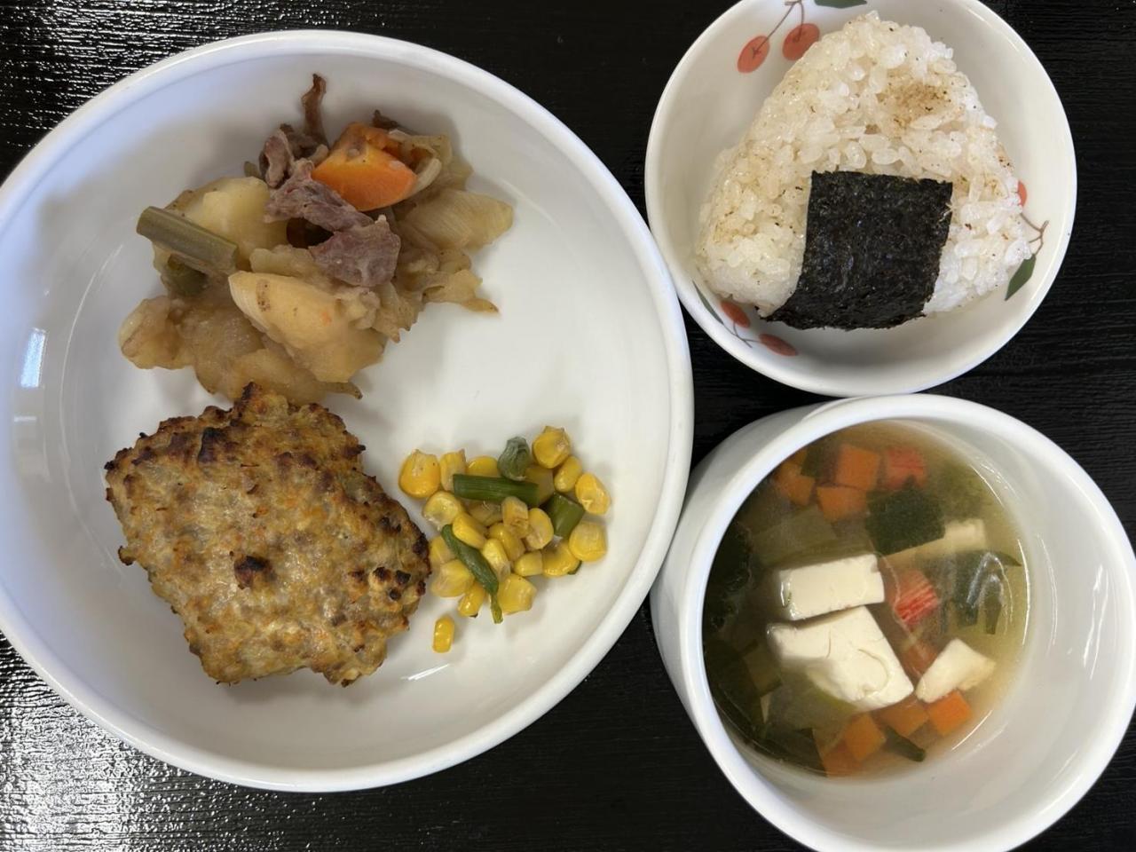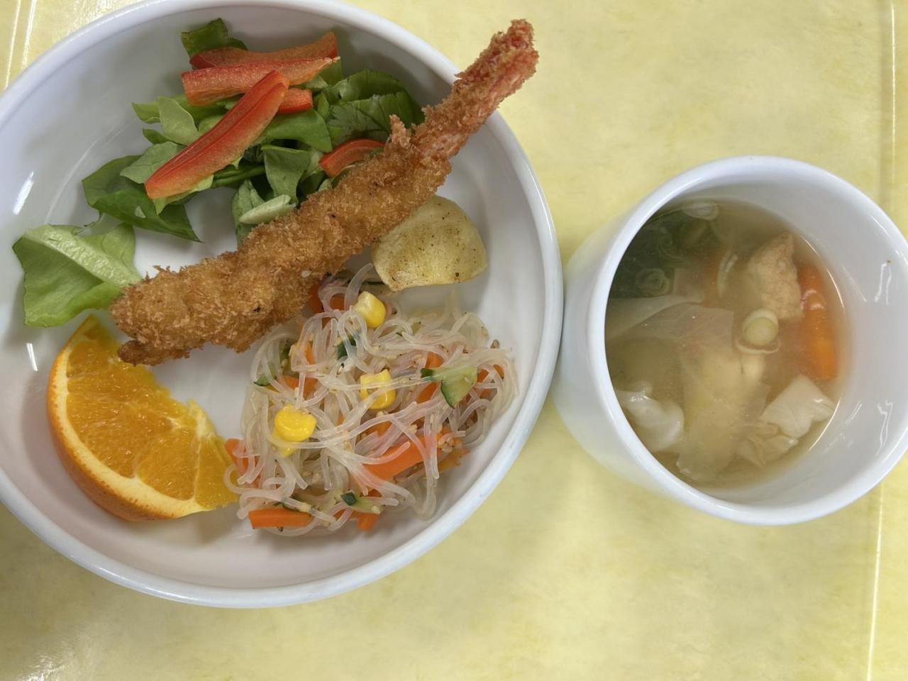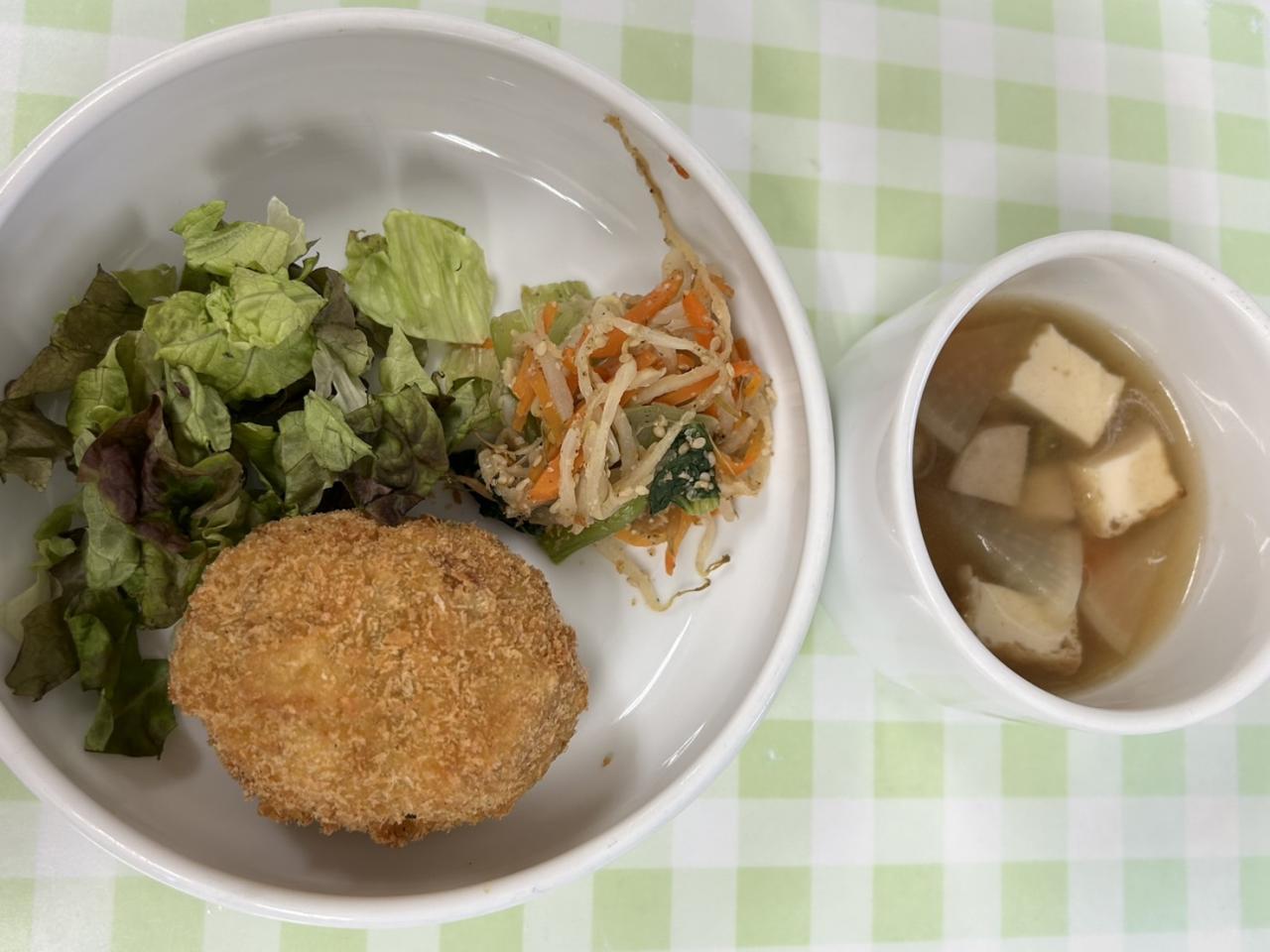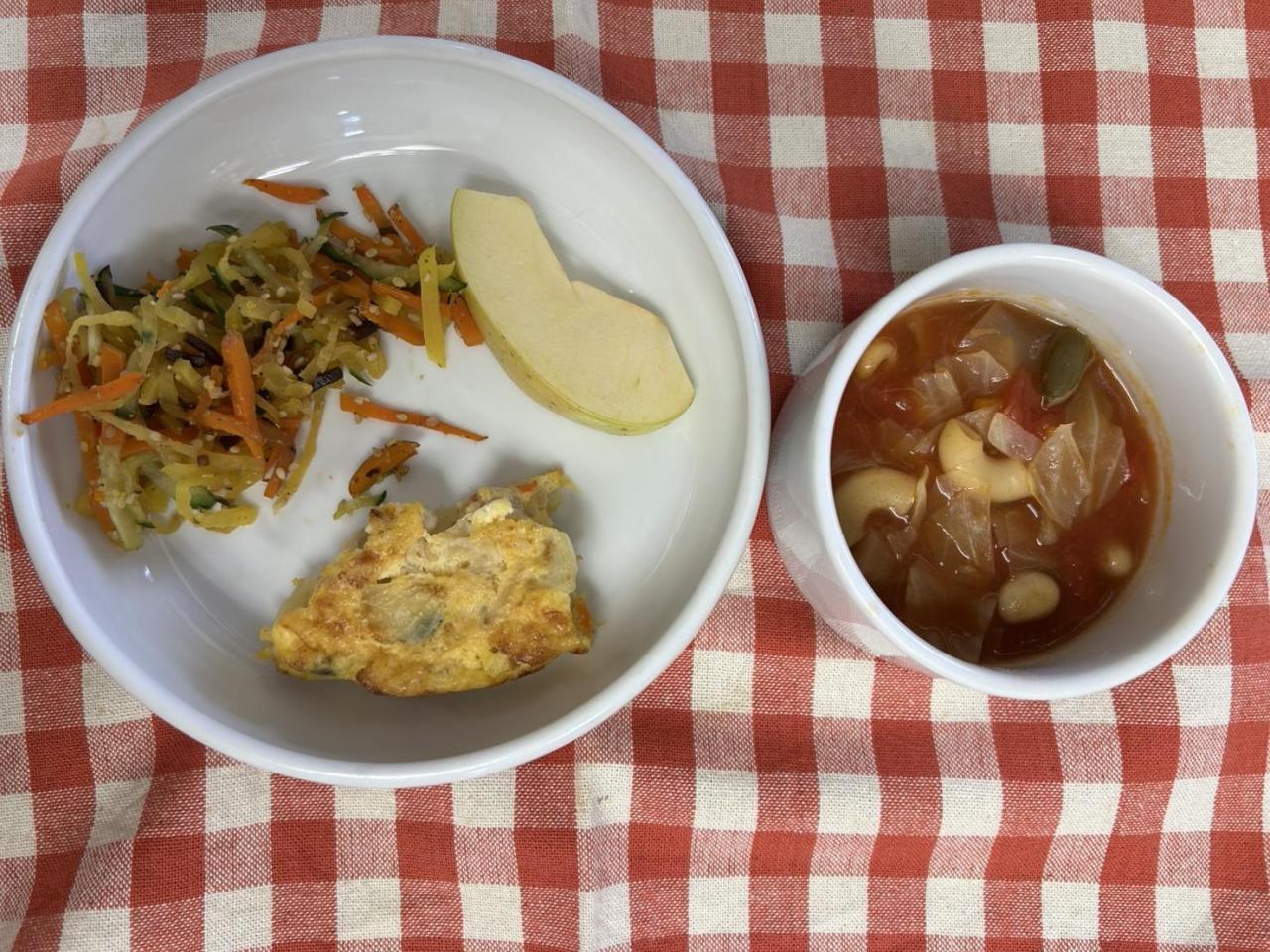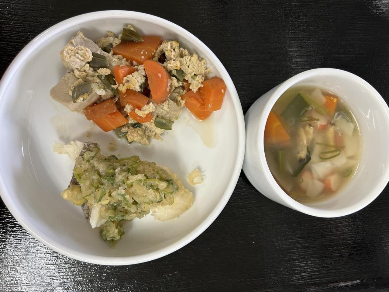 「グラタン」には、年長さんが収穫したさつま芋を使っています。果物はいただいた柿です。