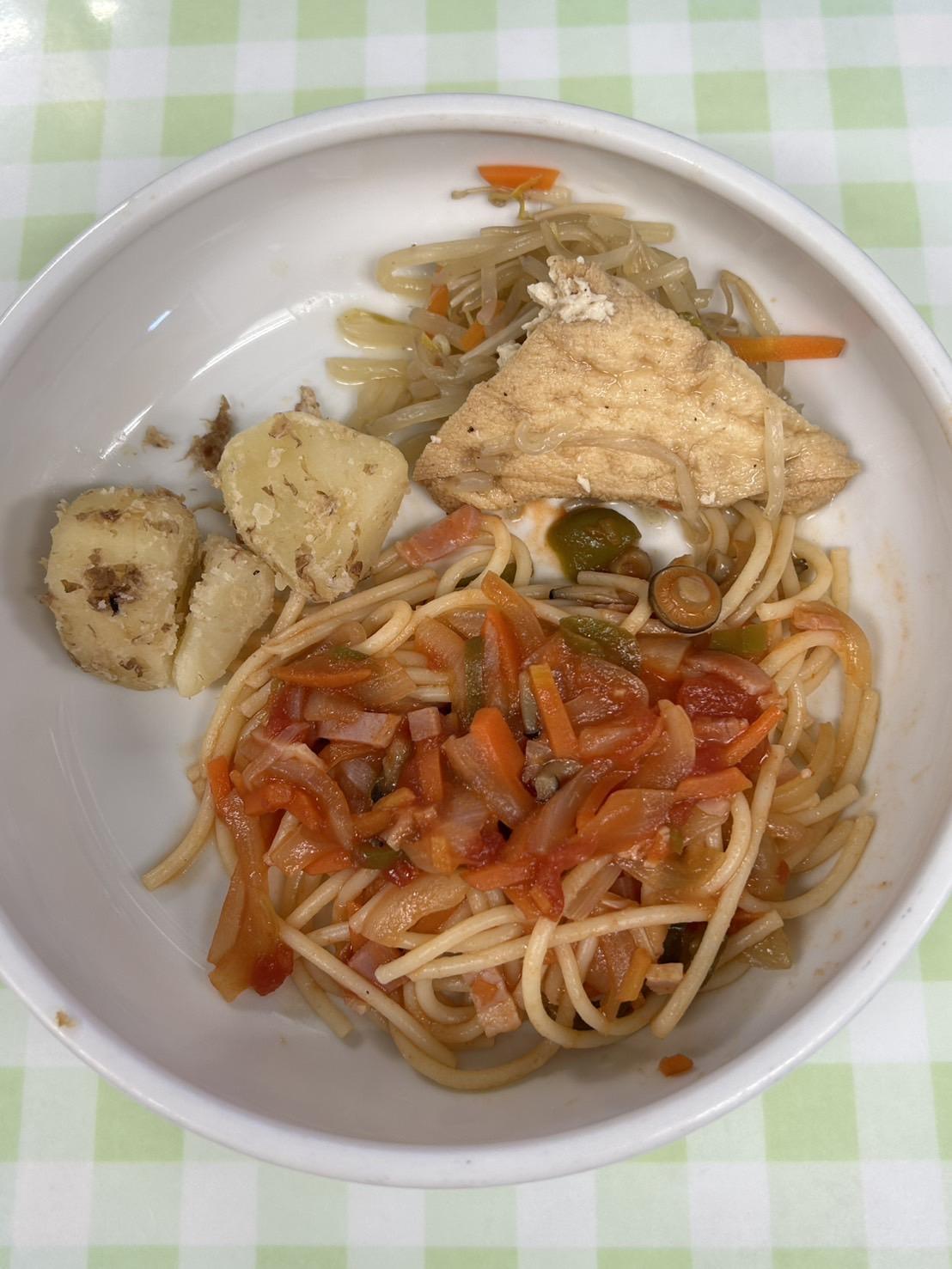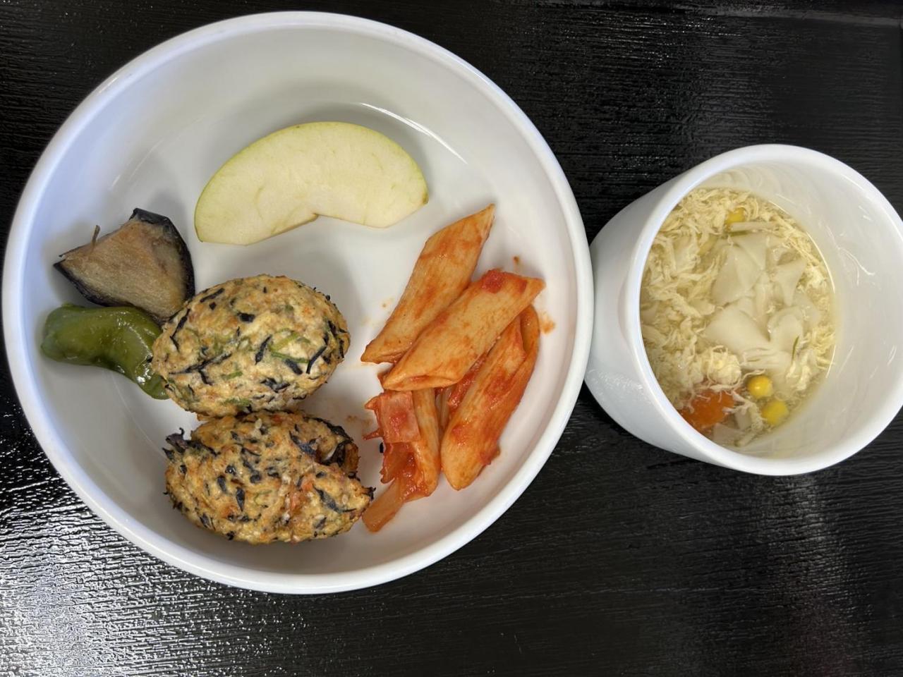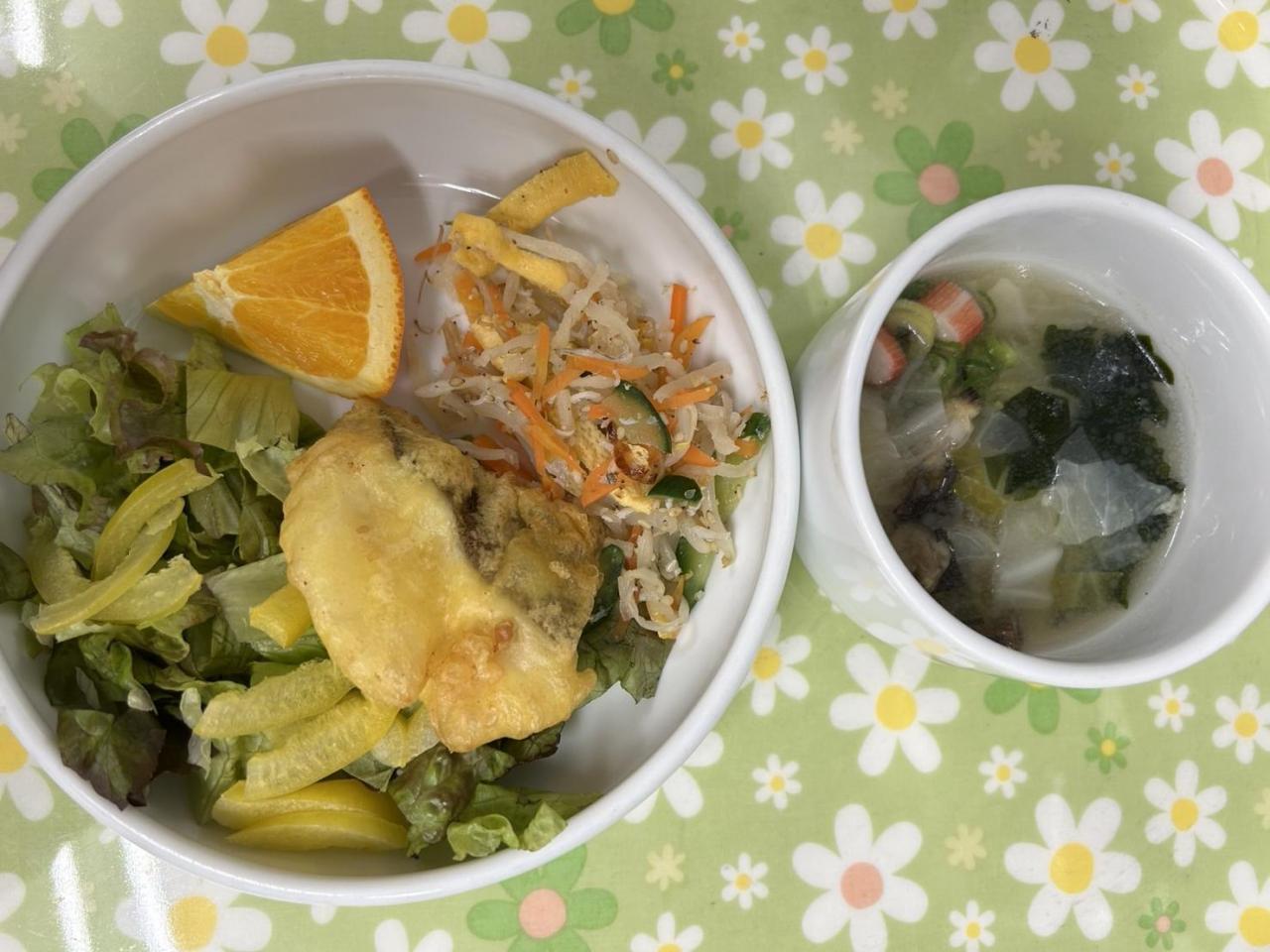 がんもどきの添えに、園庭で収穫したピーマンとなすの素揚げを付けています。