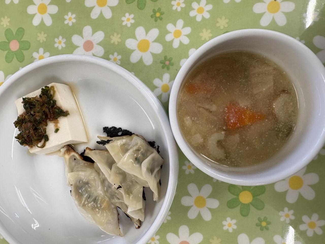 30日は、ふじ組でさつき組と一緒に実演給食を行いました。食材を触ったり、匂ってみたり、調理しながら説明をしたり・・・。熱々の餃子は美味しかったかな?😋