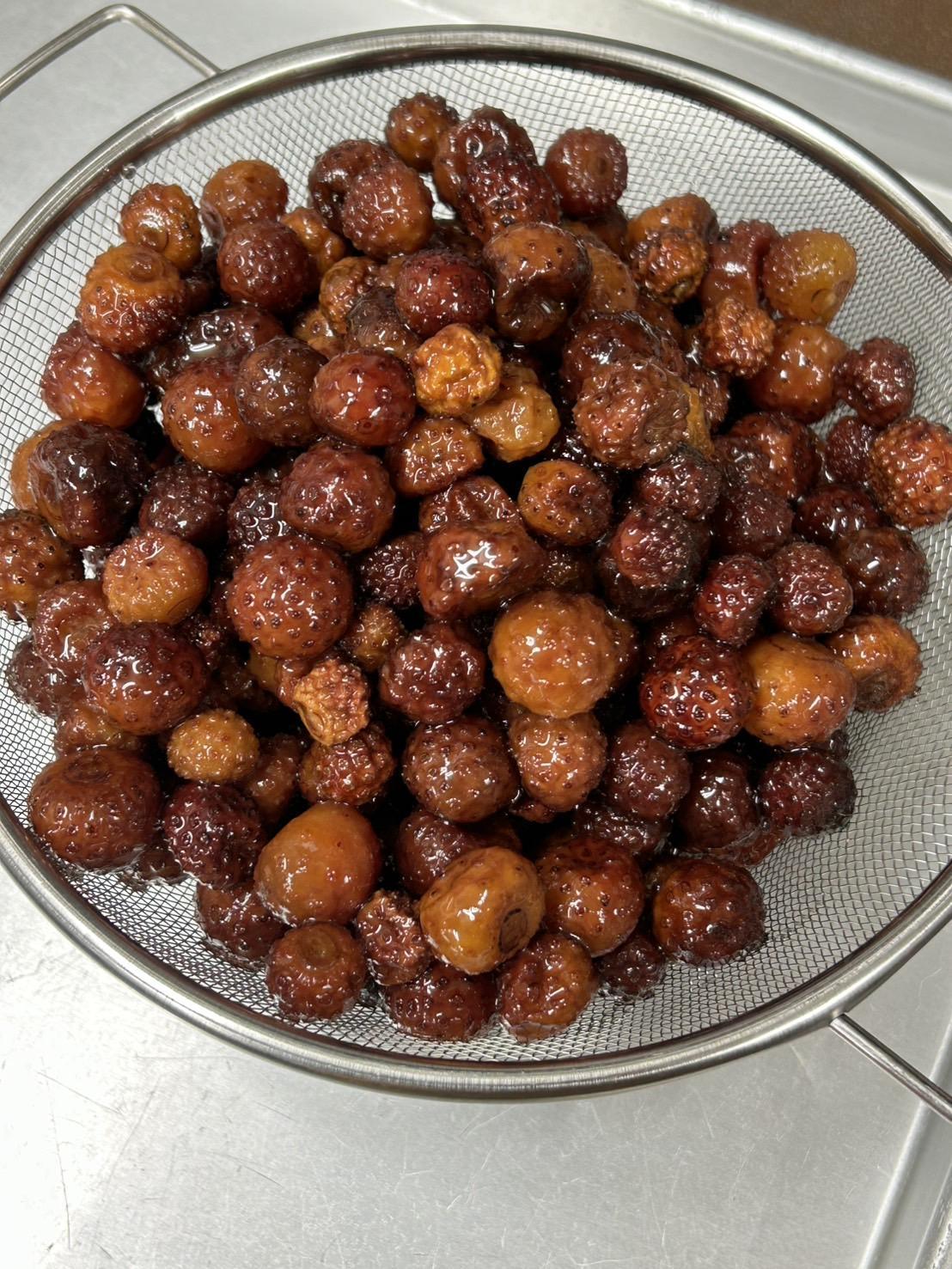 砂糖漬けのヤマボウシの瓶を給食室前に置いていましたが、シロップが完成しましたので、おやつに使用しました。