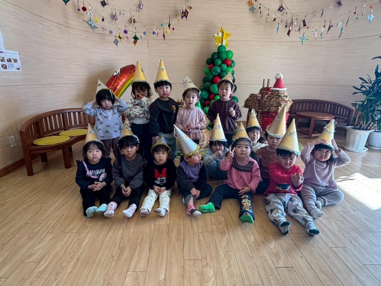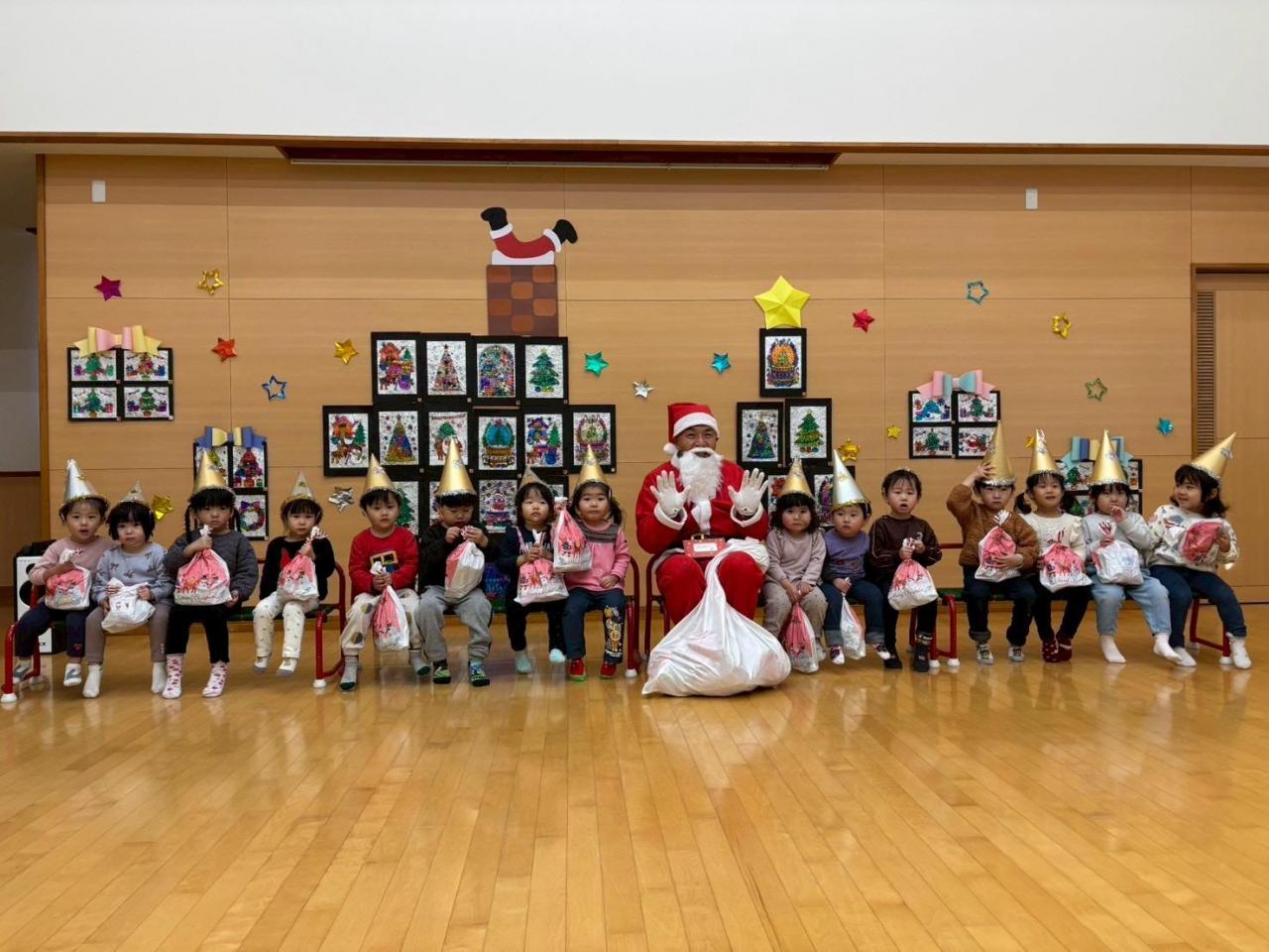 遊戯室に向かう前からクリスマスの音楽が流れていて「なんか音聞こえるで~!」「サンタさんもう来たんちゃう⁉」とワクワクが止まらない子どもたち😆 パーティー帽子を被って準備万端です❣