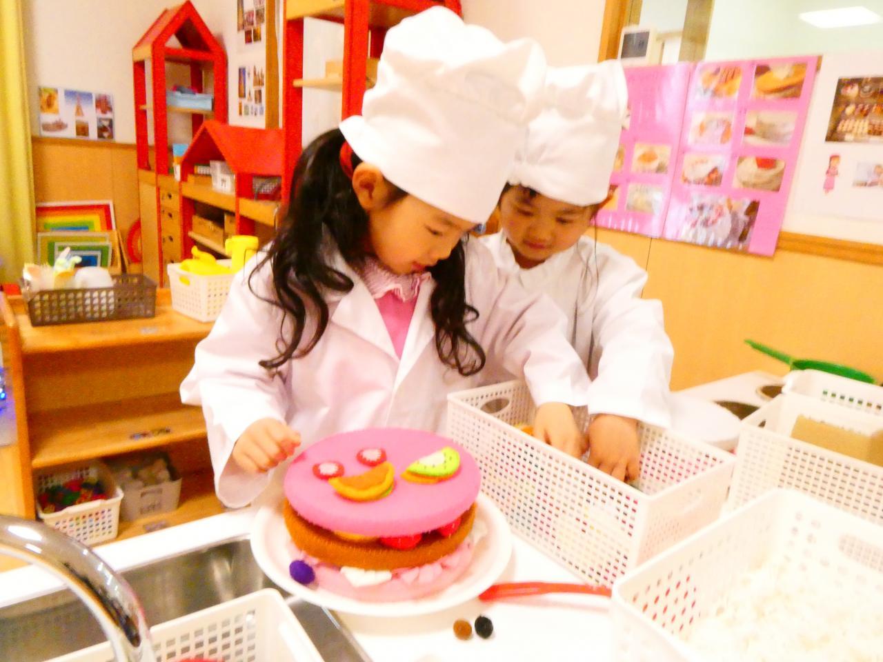 お部屋ではケーキ屋さんも始まり、生地に果物やクリームをトッピングしてカラフルなケーキを作って遊んでいます🎂