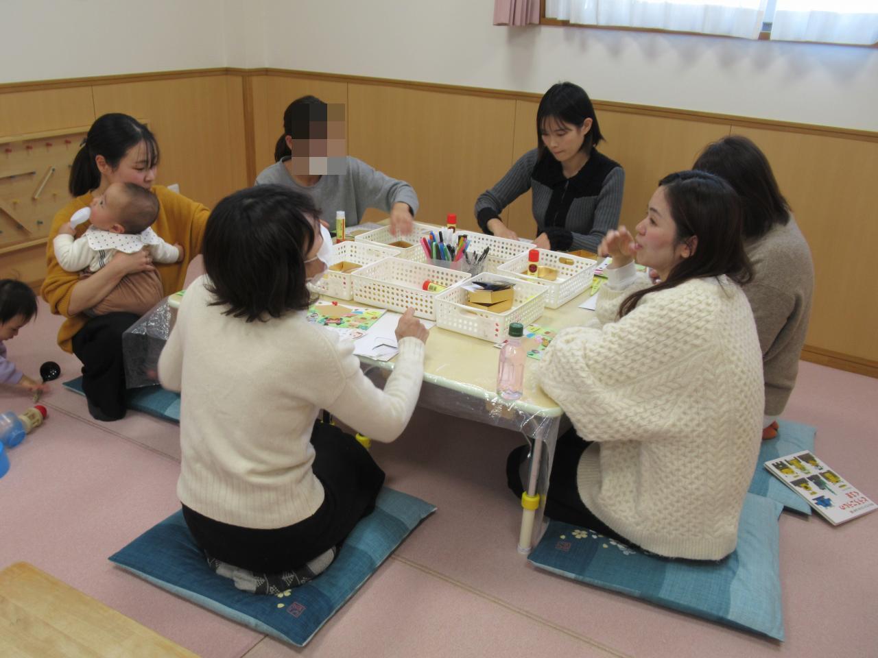ママたちは製作しながら子育てトークで盛り上がり…😆子どもたちはお気に入りの玩具で楽しく遊んでいました😄