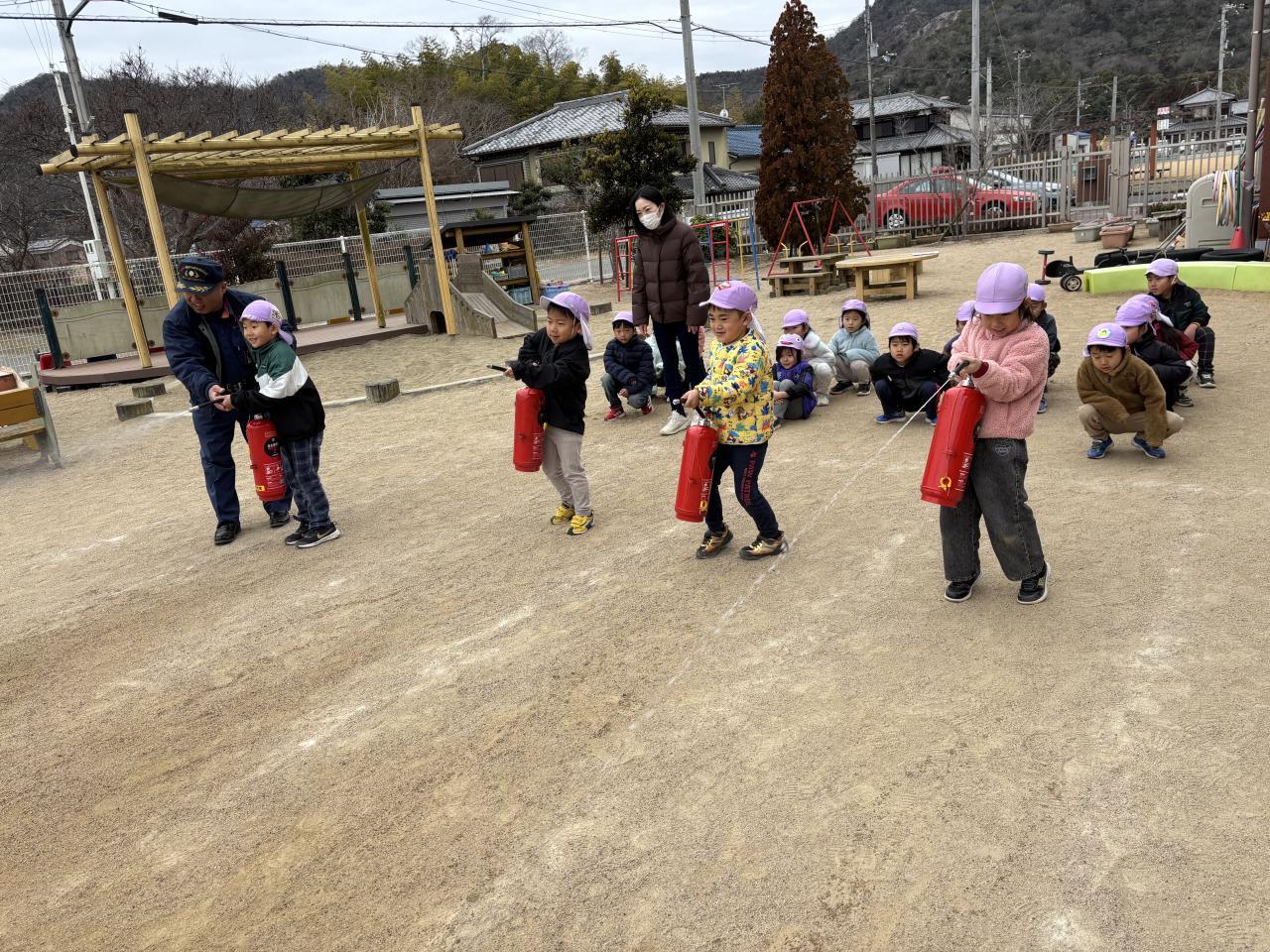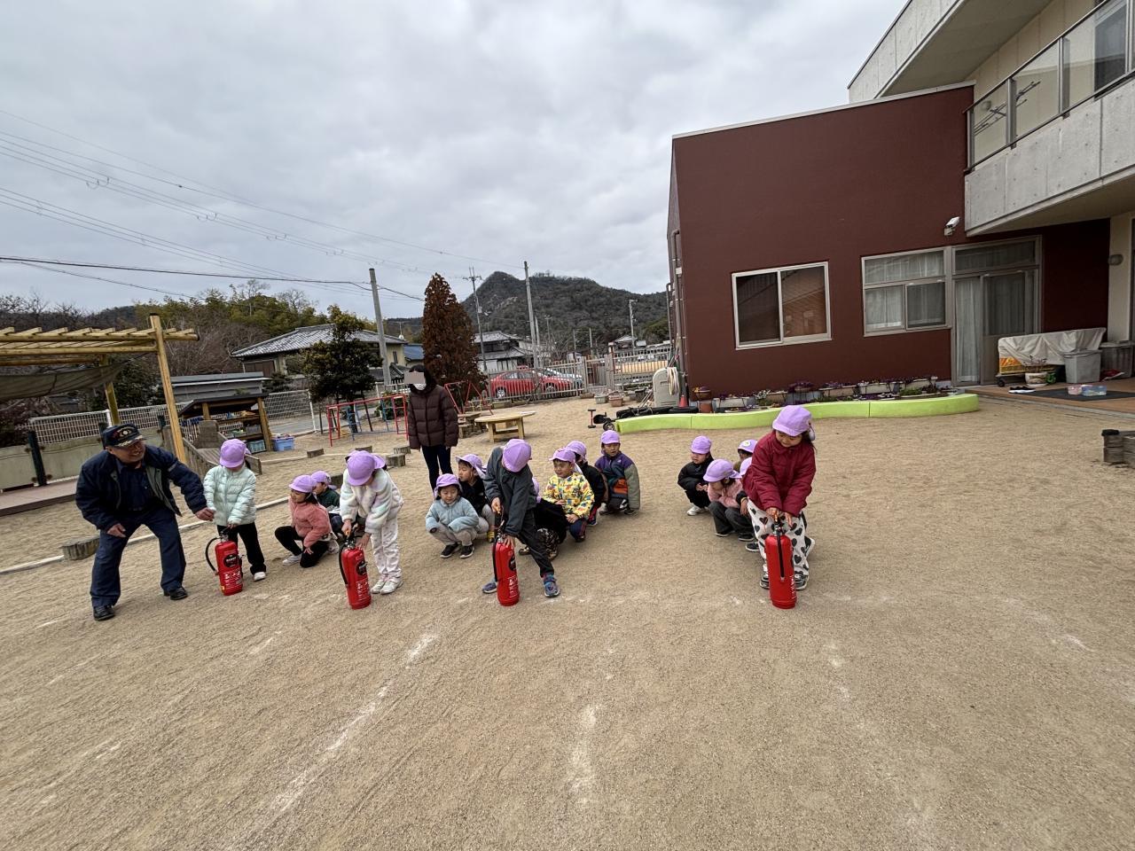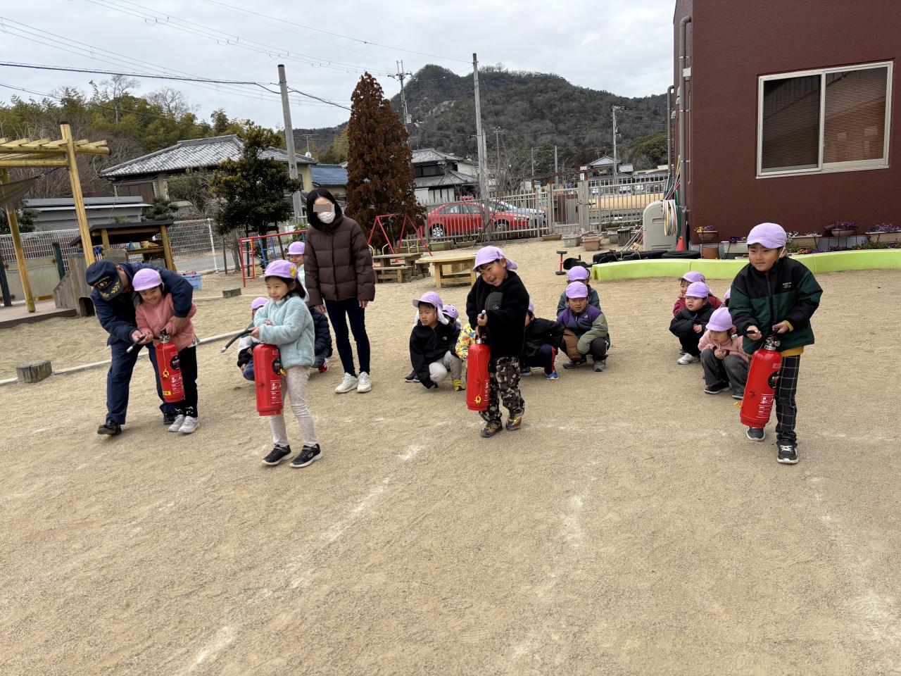 避難訓練の後は、5歳児が参加の消火訓練があり、消火器の使い方の説明を受けましたが、使用手順を知っている子もいて、驚きました😌