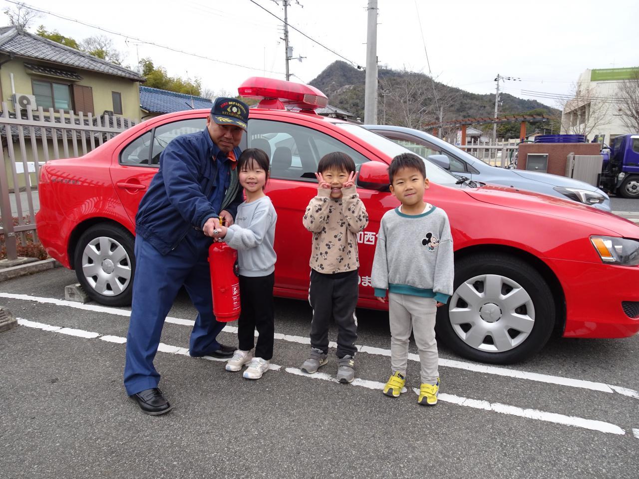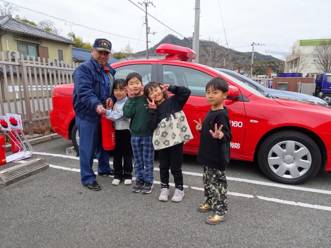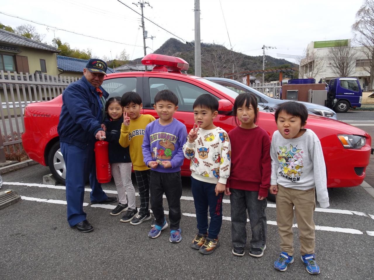 避難訓練の後は、5歳児が参加の消火訓練があり、消火器の使い方の説明を受けましたが、使用手順を知っている子もいて、驚きました😌
