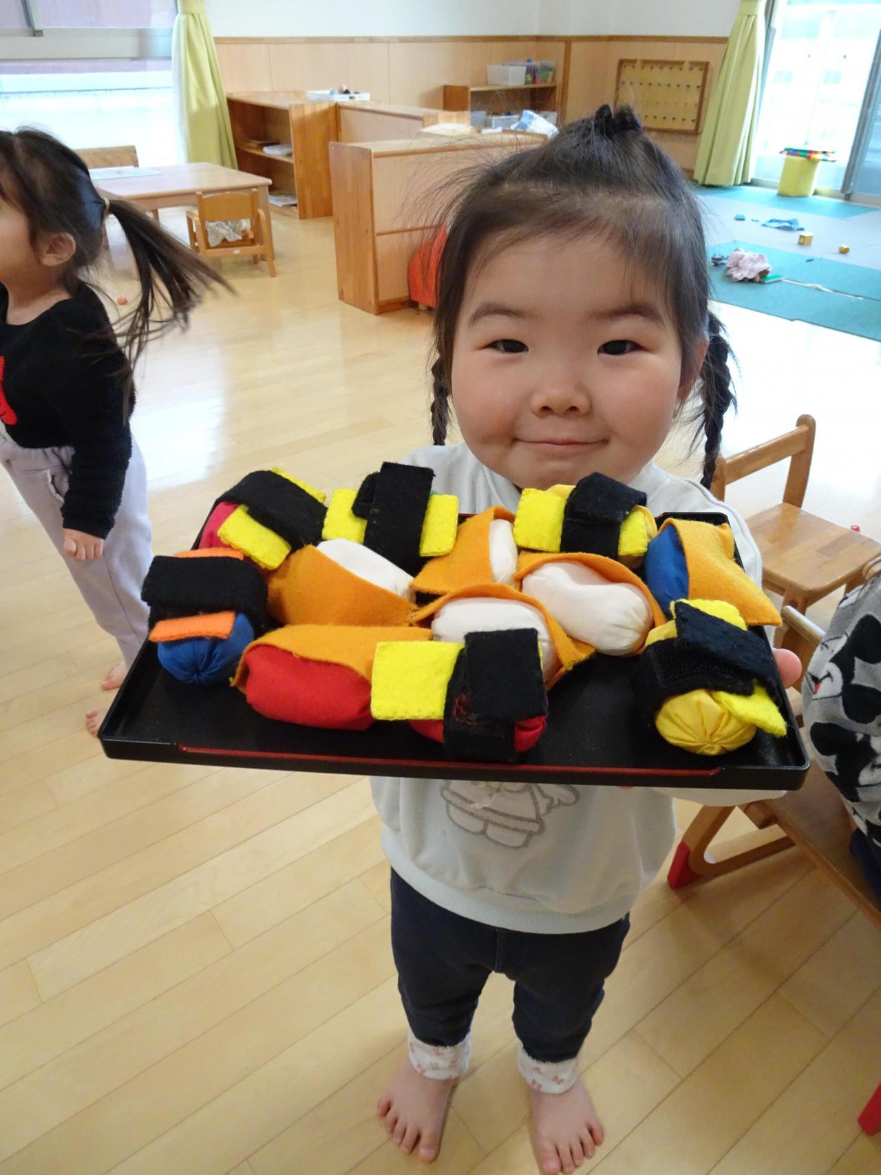 「わさび」や「いくら」などをお手玉などで再現したりして、子どもたちの発想