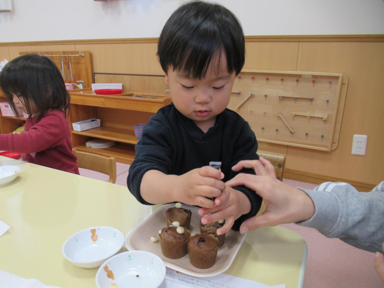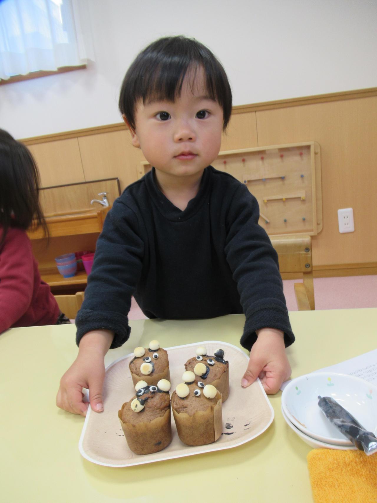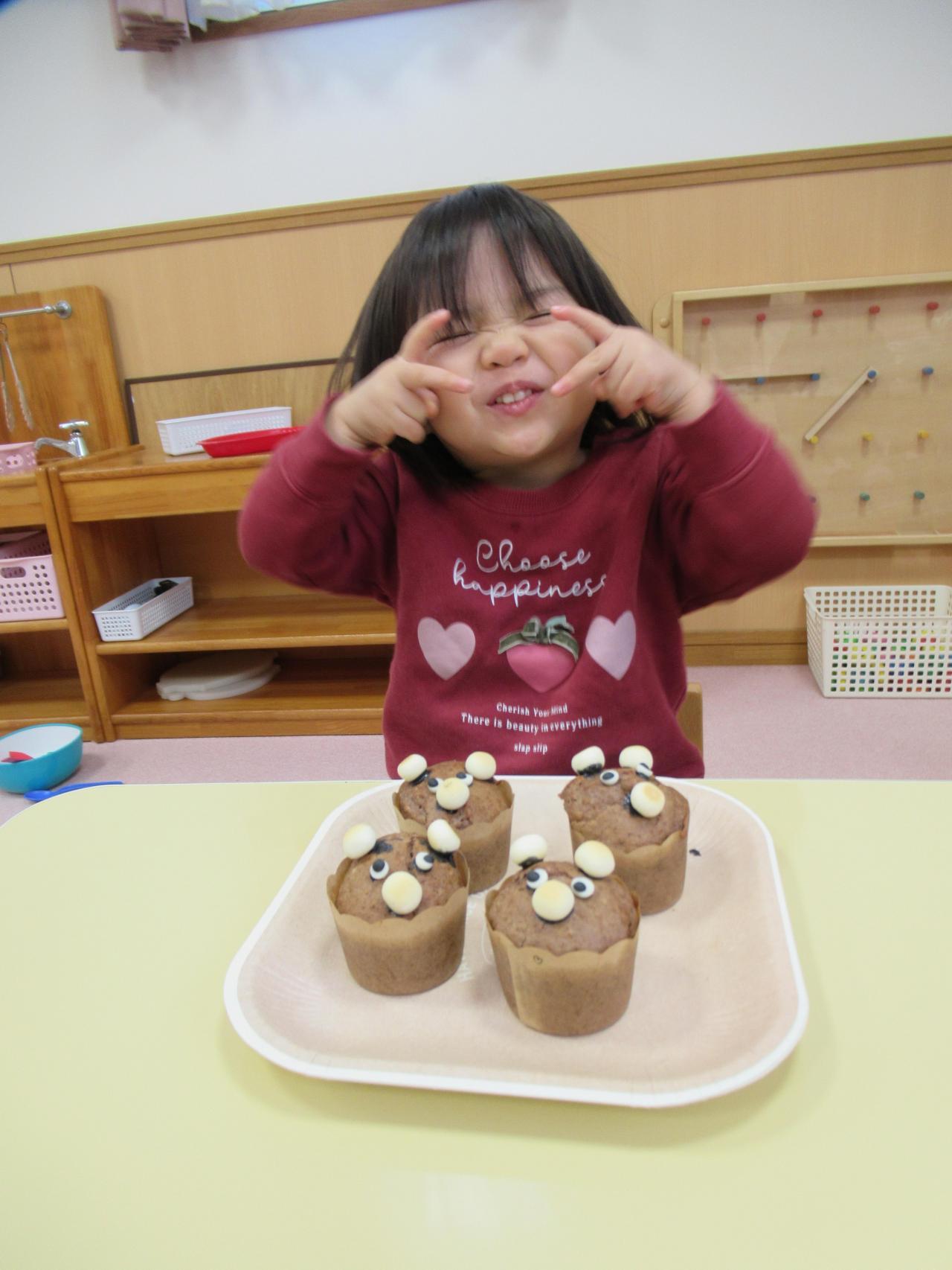 焼きあがったマフィンに卵ぼうろやチョコペンでクマさんに仕上げ、みんなでいただきました💕甘い甘いクマフィン、とっても美味しかったね😌