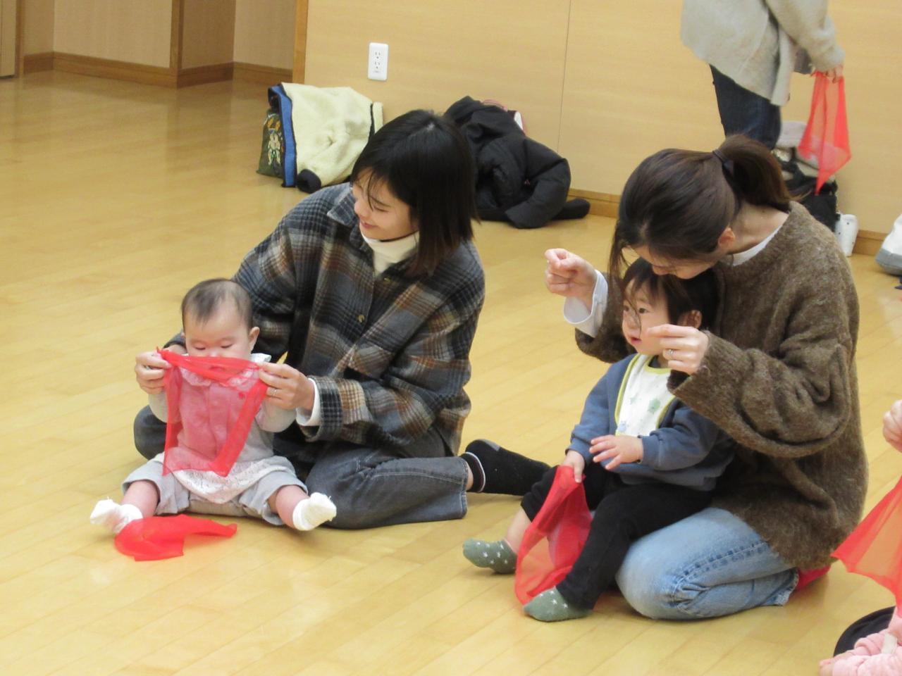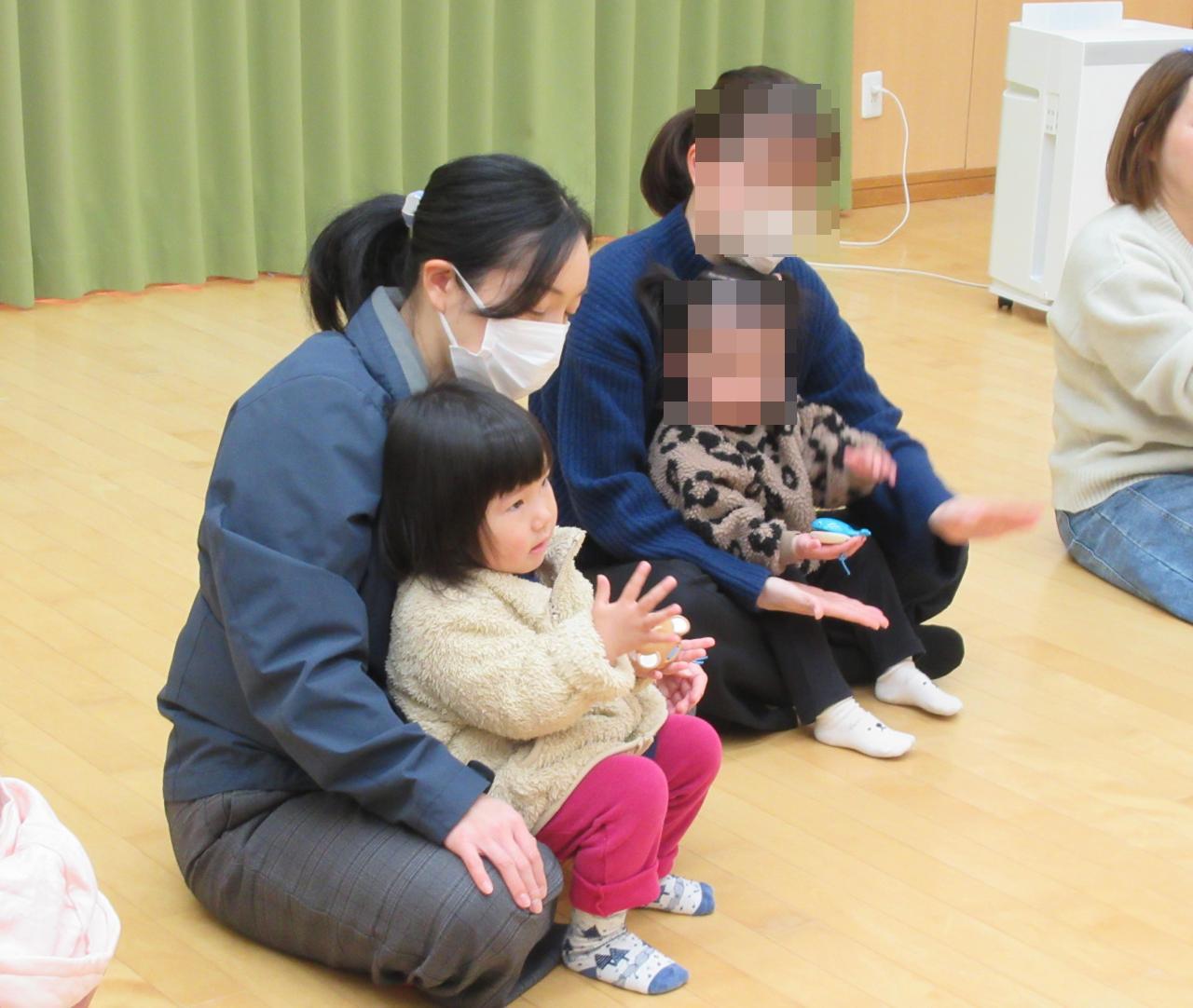 ピアノの音に合わせて歩いたり止まったり、ママと触れあい遊びをしたり😆カスタネットやシフォンスカーフなどの道具も使って、音楽を楽しみました🥰