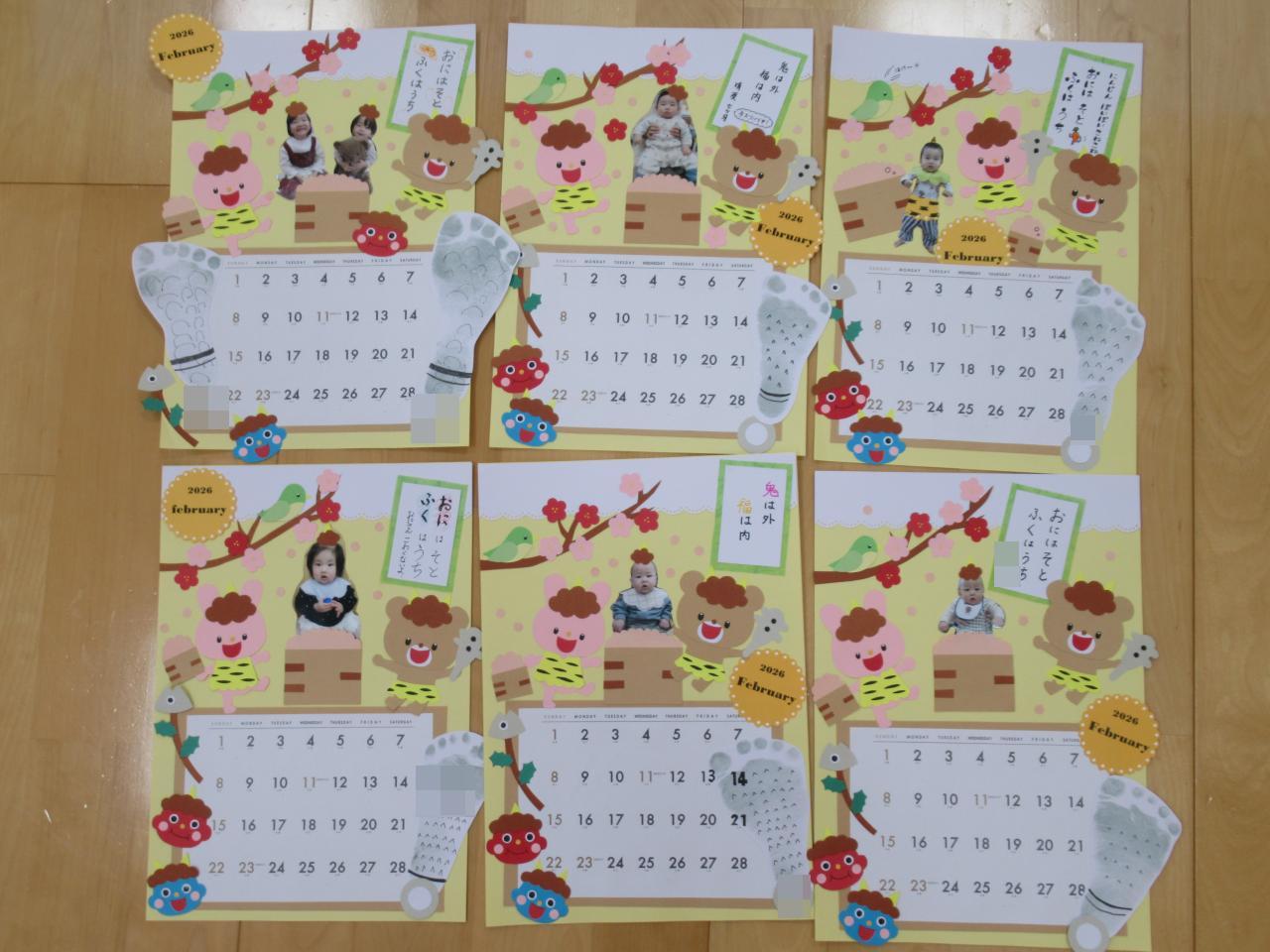 足型つきのカレンダーづくり✨今月の足型アートは節分にちなんで「鬼の金棒」でした😆小さくてかわいい金棒から、大きくて立派な金棒まで✨いろんな金棒がずらり😆