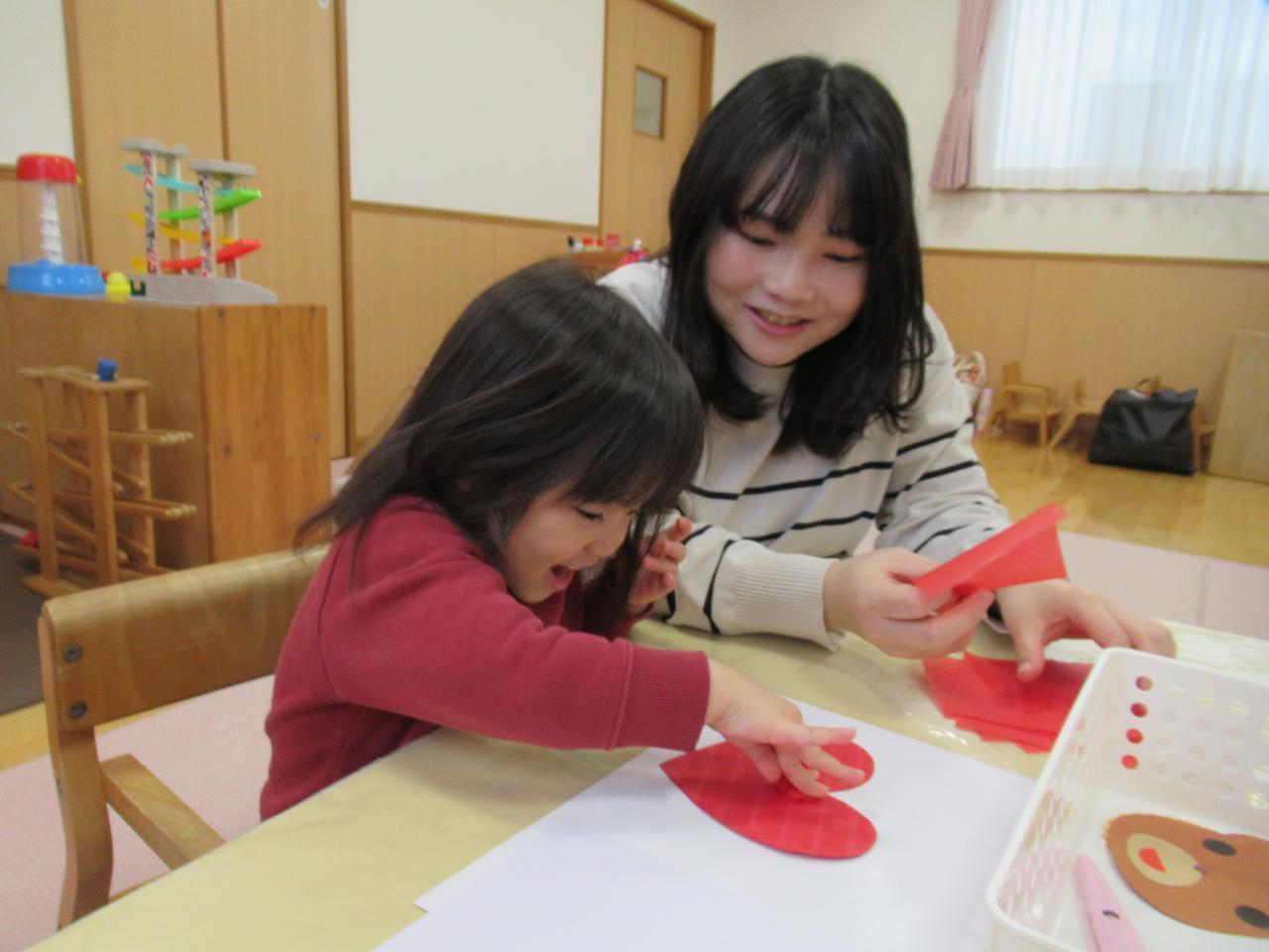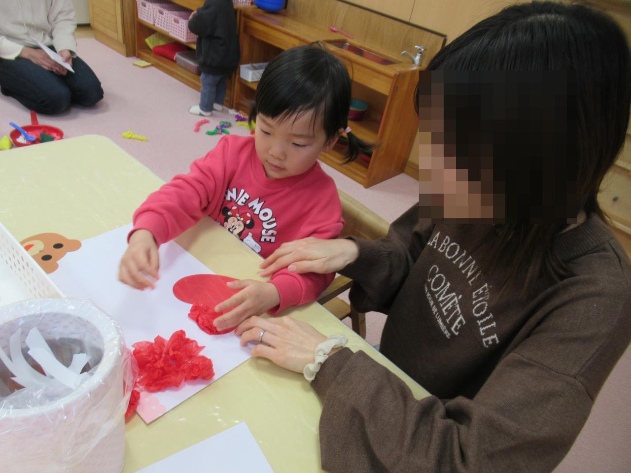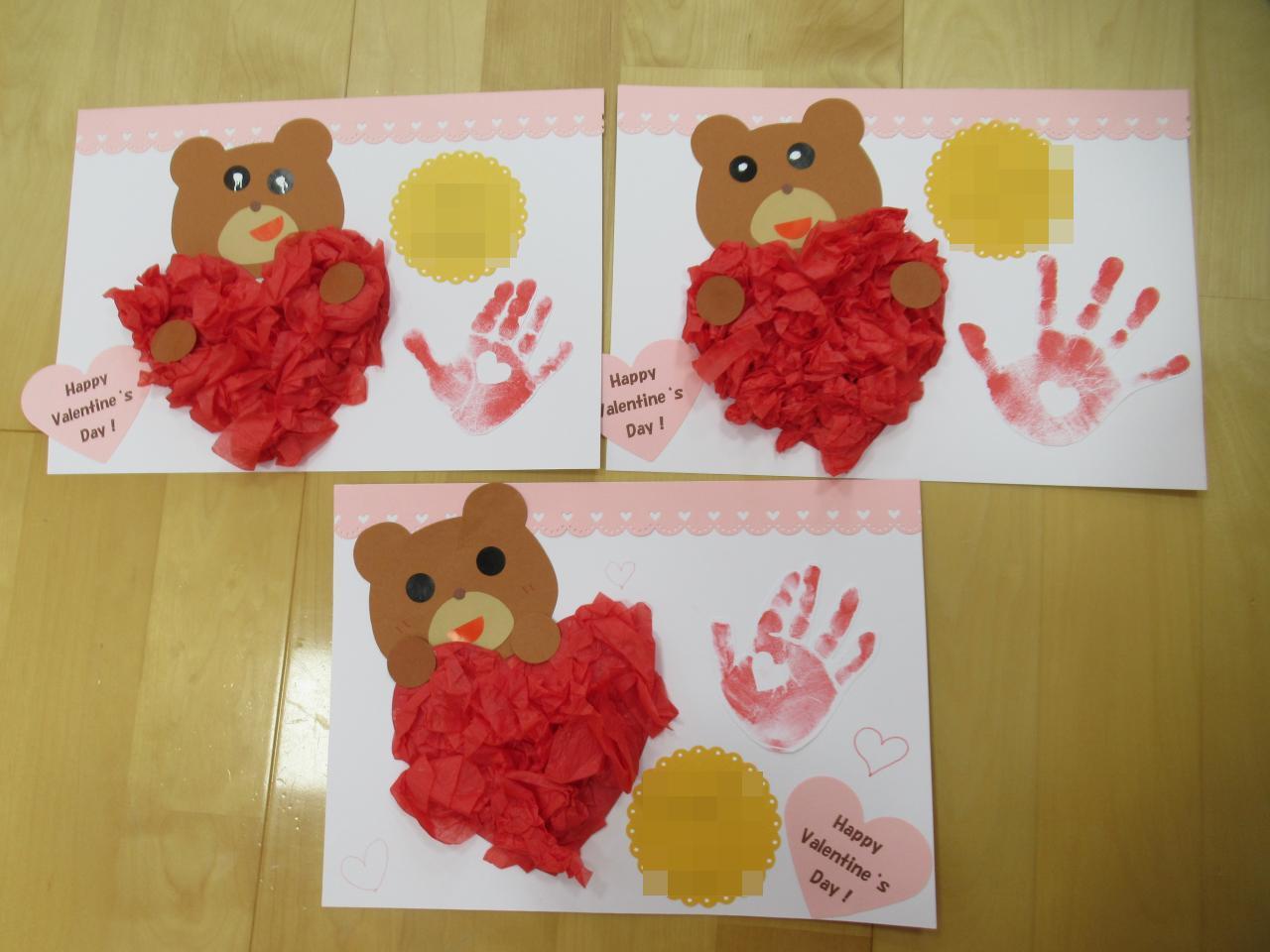 製作はお花紙を使ってバレンタイン製作を楽しみました😄お花紙を丸めて貼って、手形もして…たくさん工程がありましたが、みんな頑張りました😆