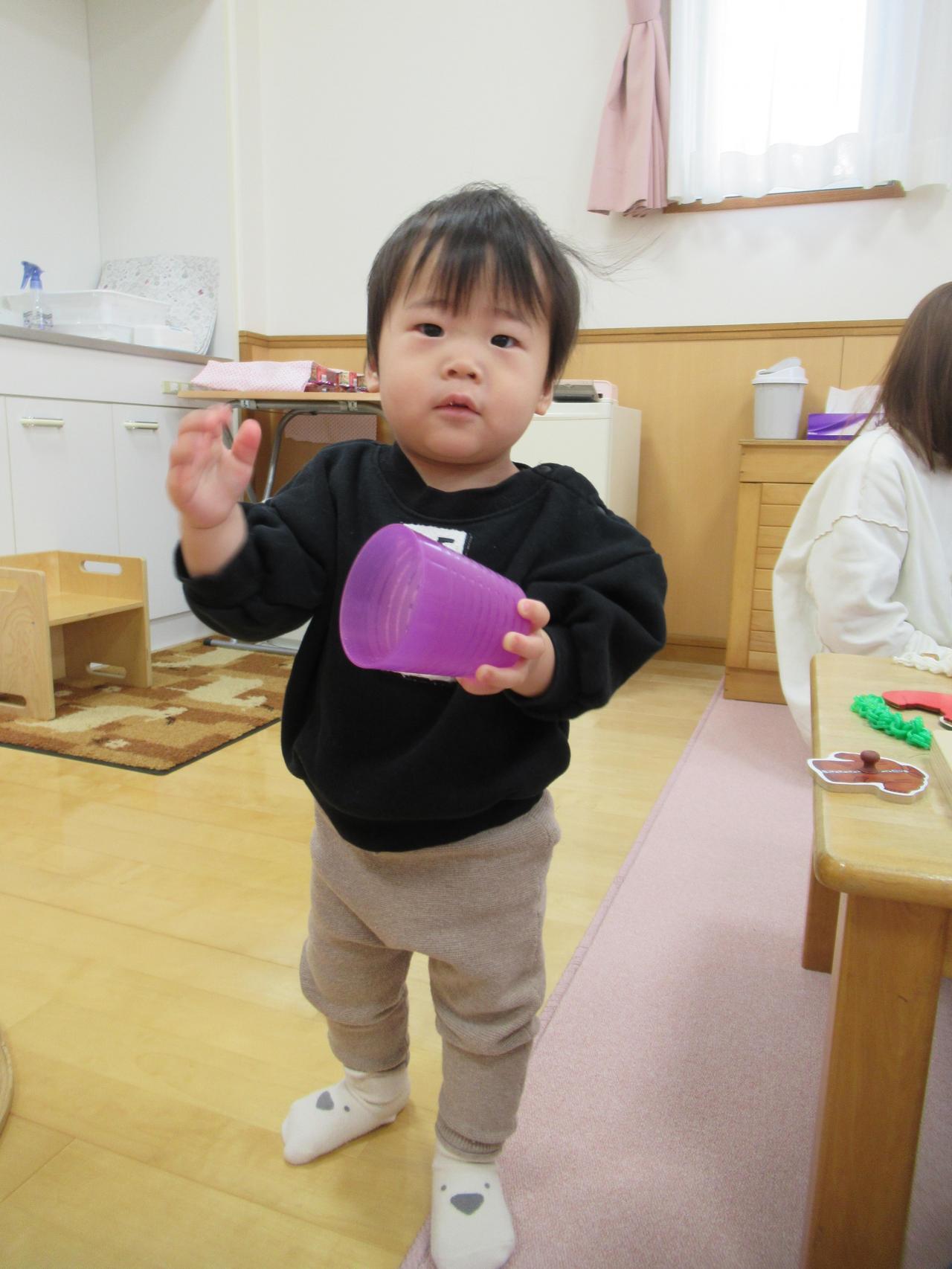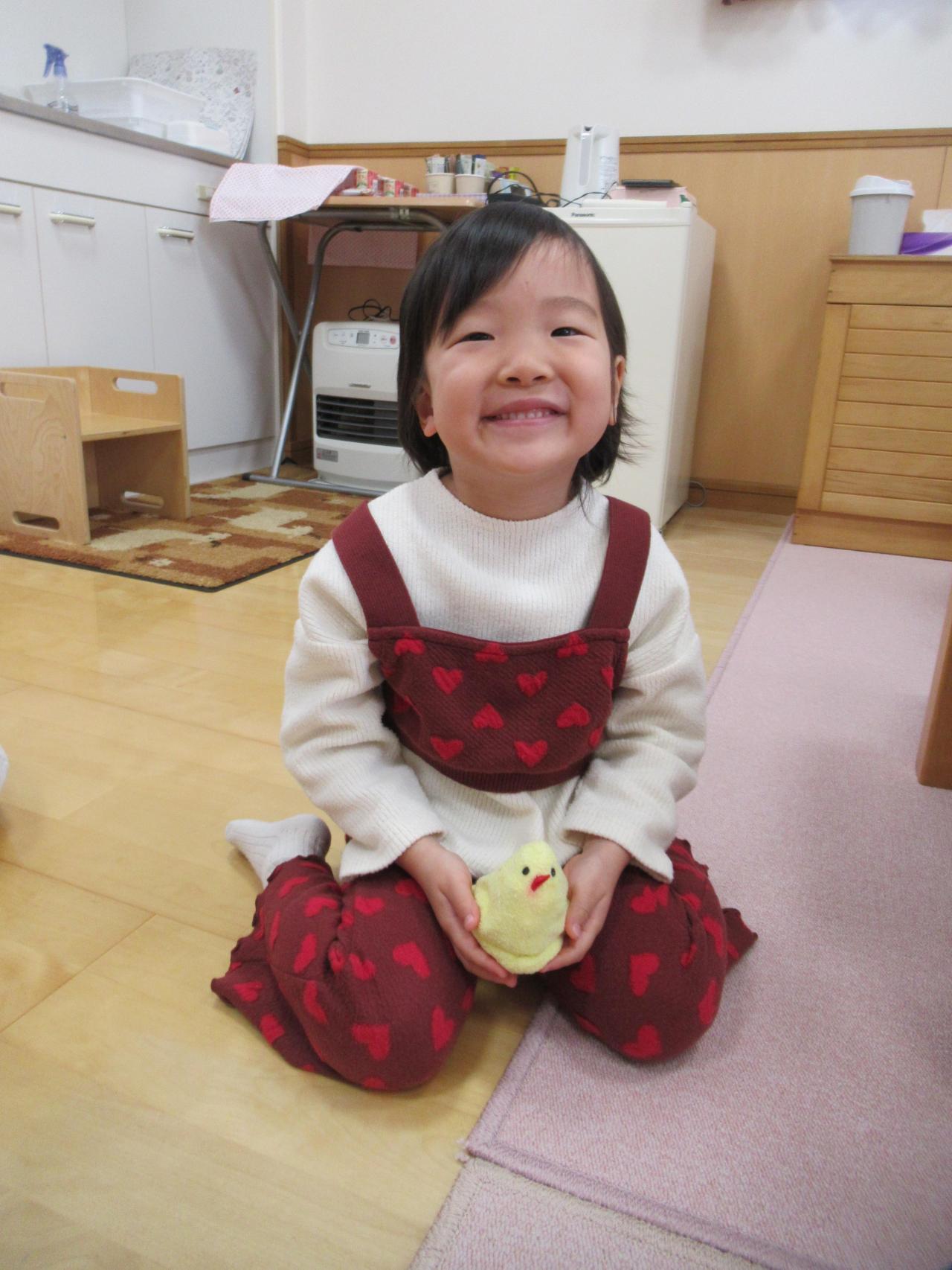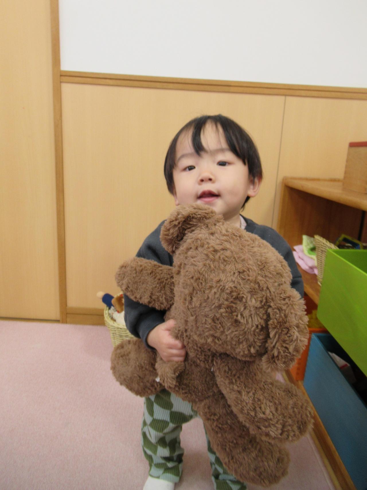 絵本の前に、わらべうた「まがんこ」と「ねずみねずみどこいきゃ」を歌いました♪大好きなママにおててをさすってもらうと、手も心もほっこり😌コチョコチョされたときには体をねじって大笑い😆楽しかったね🥰