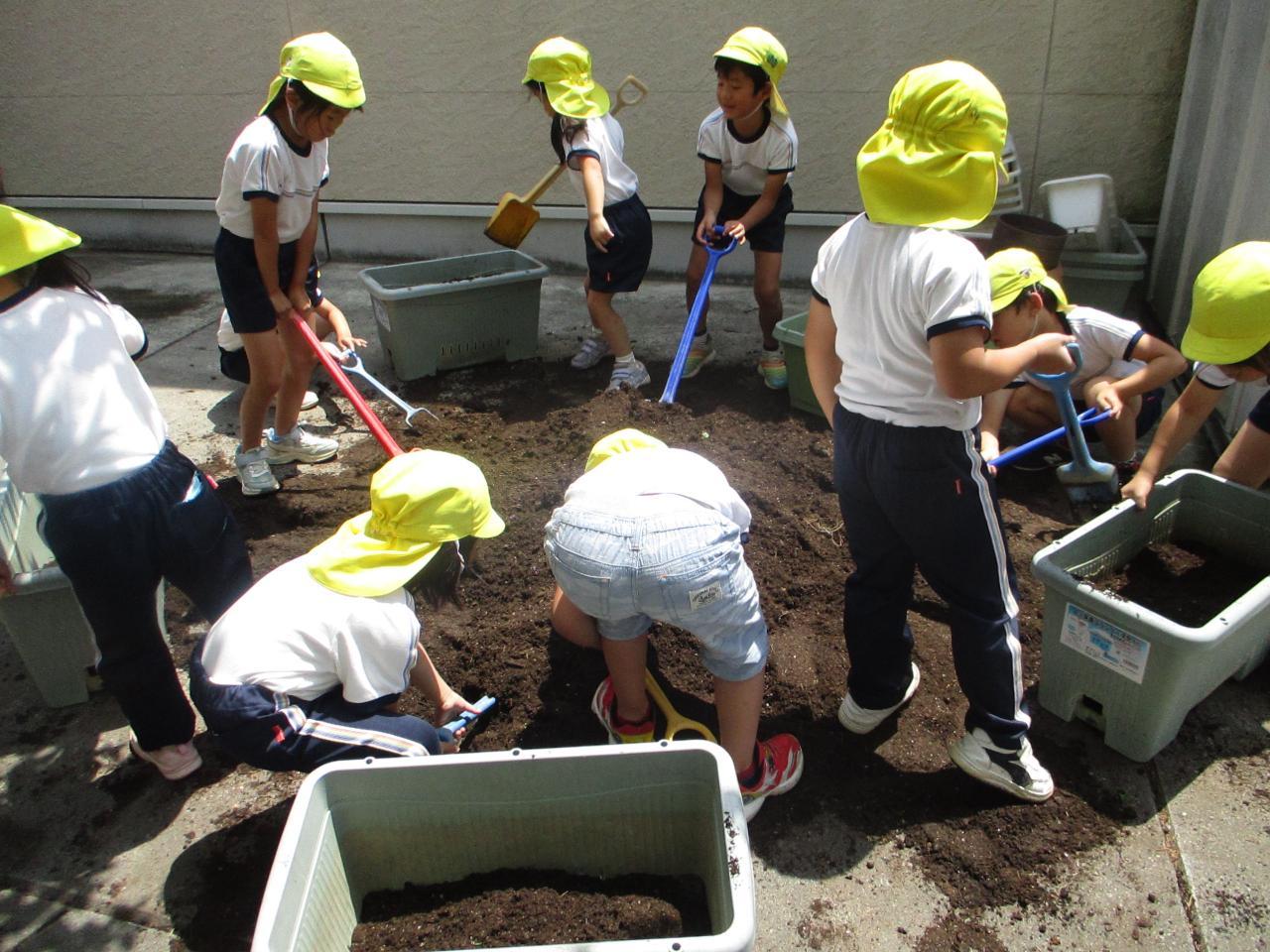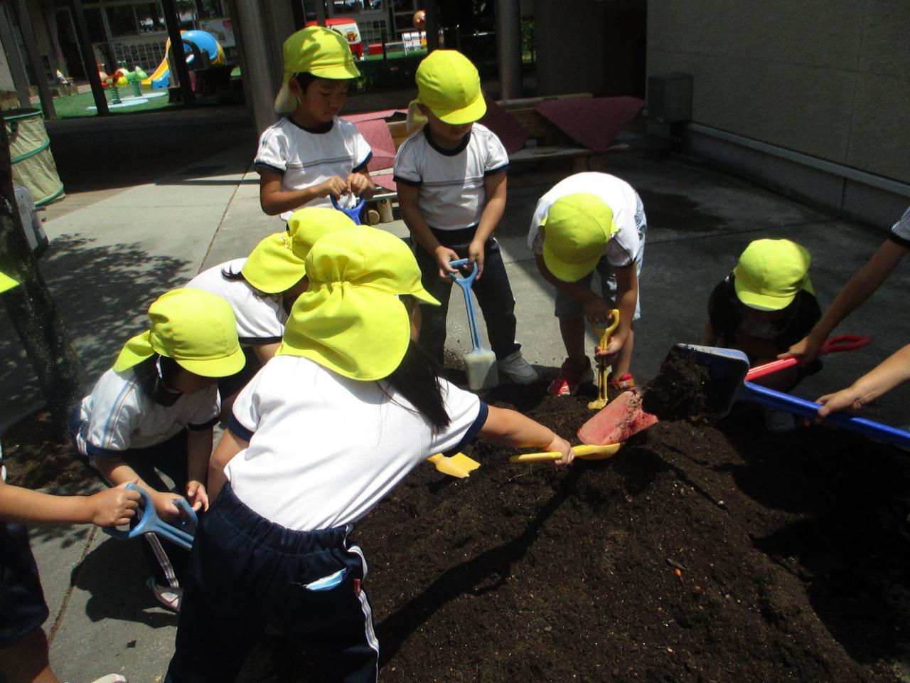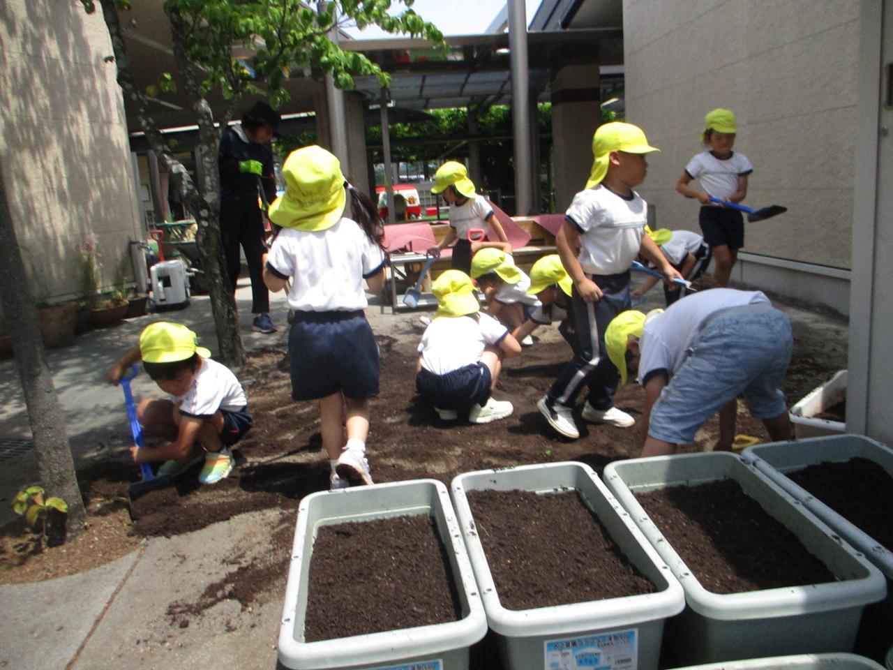 プランターの土作りのお手伝い中にネキリムシを見付け、「カボチャの根っこも食べられちゃう・・・?」と心配していたお友達の姿もありました。カボチャ栽培に向けて興味が広がっています!!」・・・さくら組より