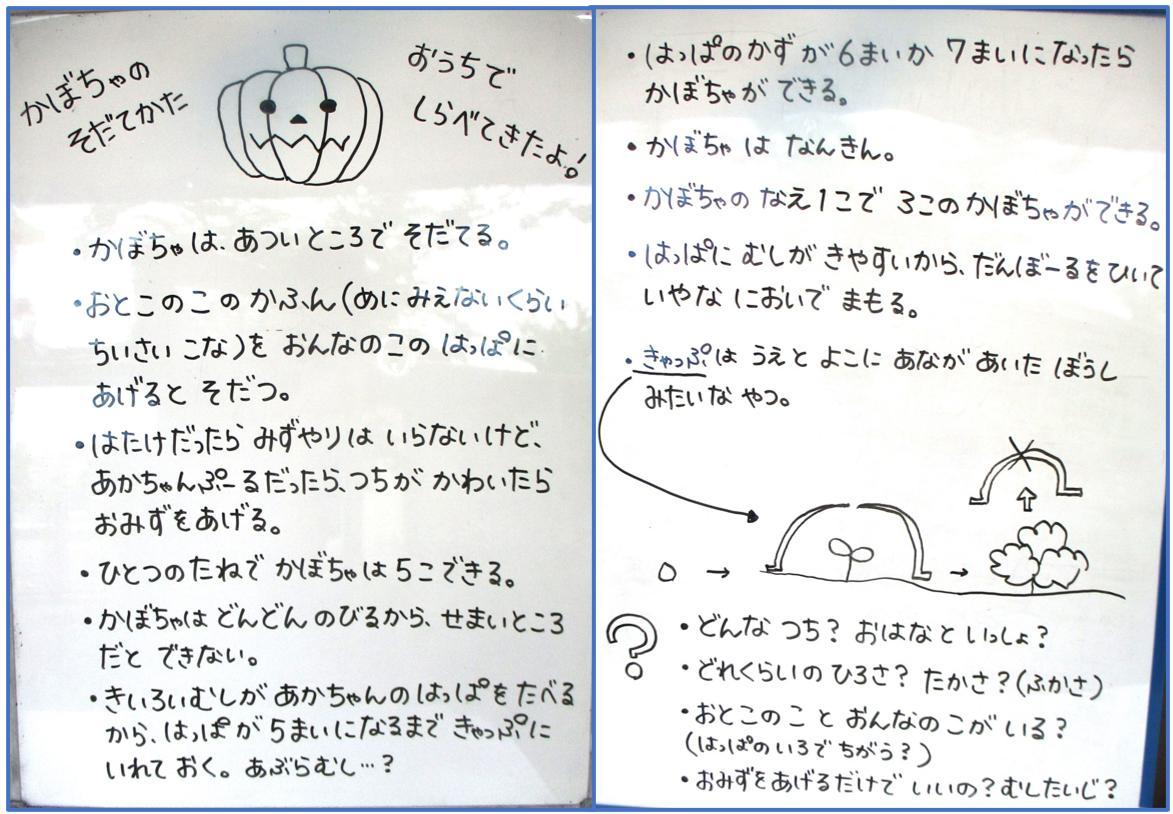 「今、さくら組で話題になっている「夏野菜、何を育てる?」問題! 早速、おじいちゃん、おばあちゃんに尋ねたり、パパやママと調べたりして、カボチャの育て方を発表していたお友達がたくさんいました✨ クラスのボードを見て、協力してくださって嬉しいです💚 ありがとうございます。分からないことは、今度は種苗屋さんで質問する予定です。さあ、どうなっていくのかな・・・?