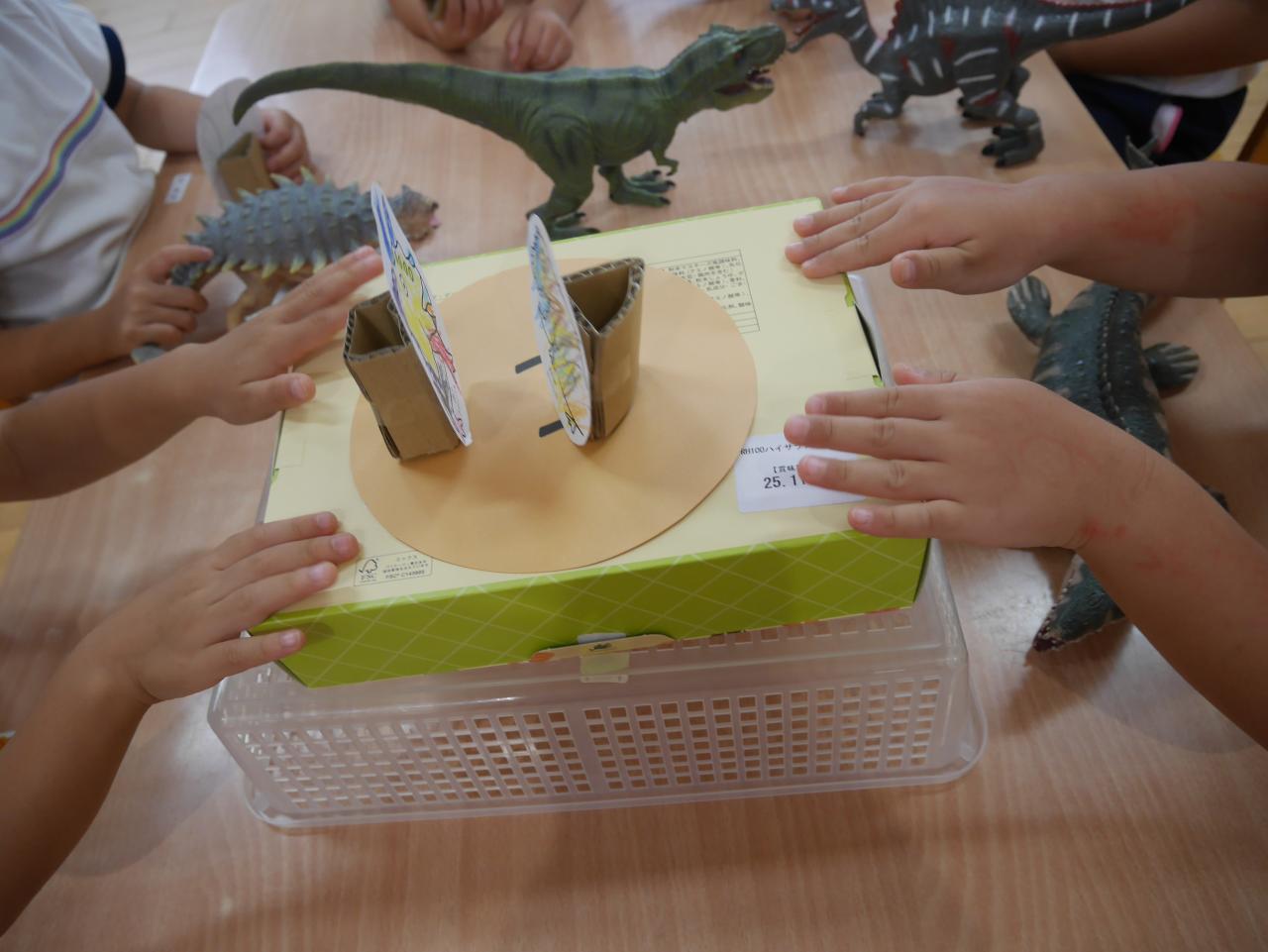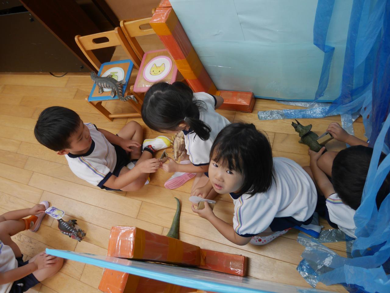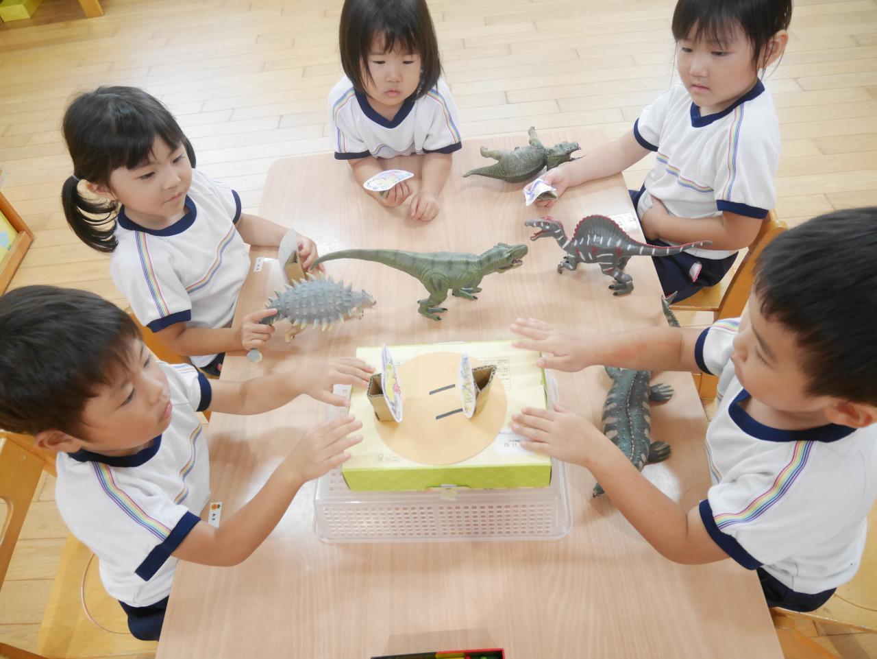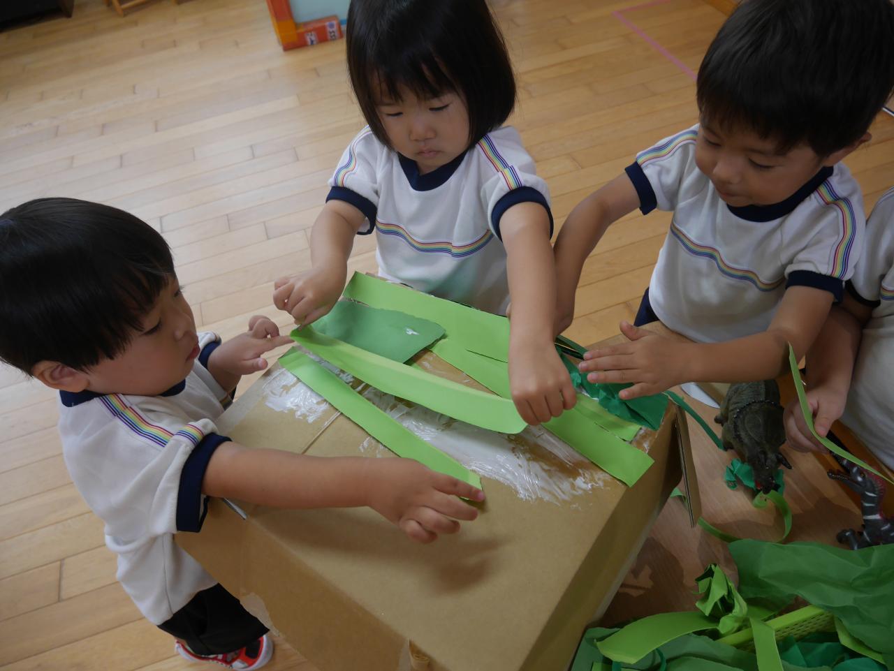 「春からずっと気に入って遊んでいる恐竜。最初は数名や個々で遊んでいたのがクラス全体に広がり、今ではみんな恐竜が大好き💛 ということで、運動会も恐竜をモチーフにしたダンスをすることに♪ ダンスももちろんかわいいのですが、子どもたちからのアイディアでジャングルづくりをしています。「池があるから、水がいる!」「草も作らなアカン」と考え、合間合間で一緒に作ってくれています。また、オリジナル恐竜をつくり、トントンずもうも楽しんでいます。マイ恐竜を水流や草の所で遊ばせてあげたりして、友だちとのかかわりが深まってきています。ぜひ、ゆり組のひと味違ったダンスをお楽しみに💚 また、経過もお伝えしますね😀」・・・ゆり組より