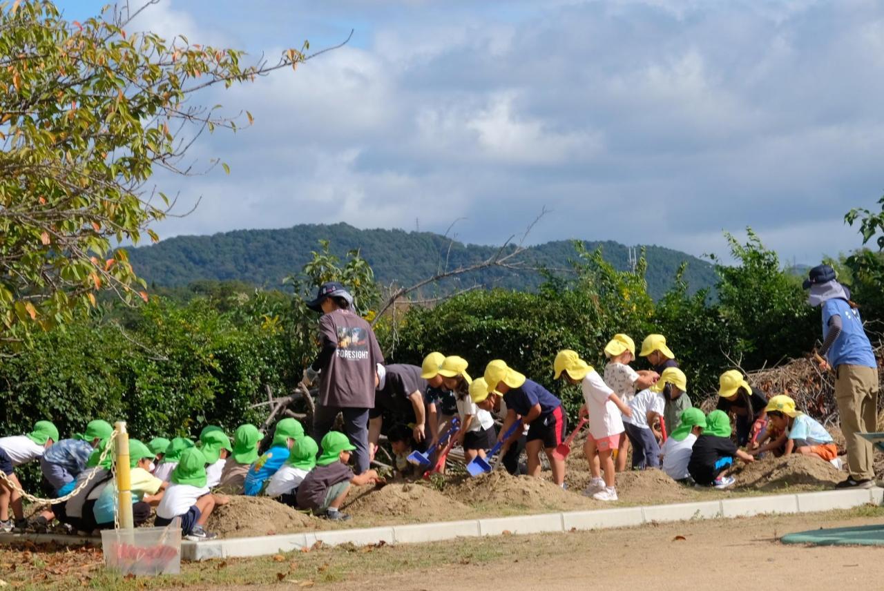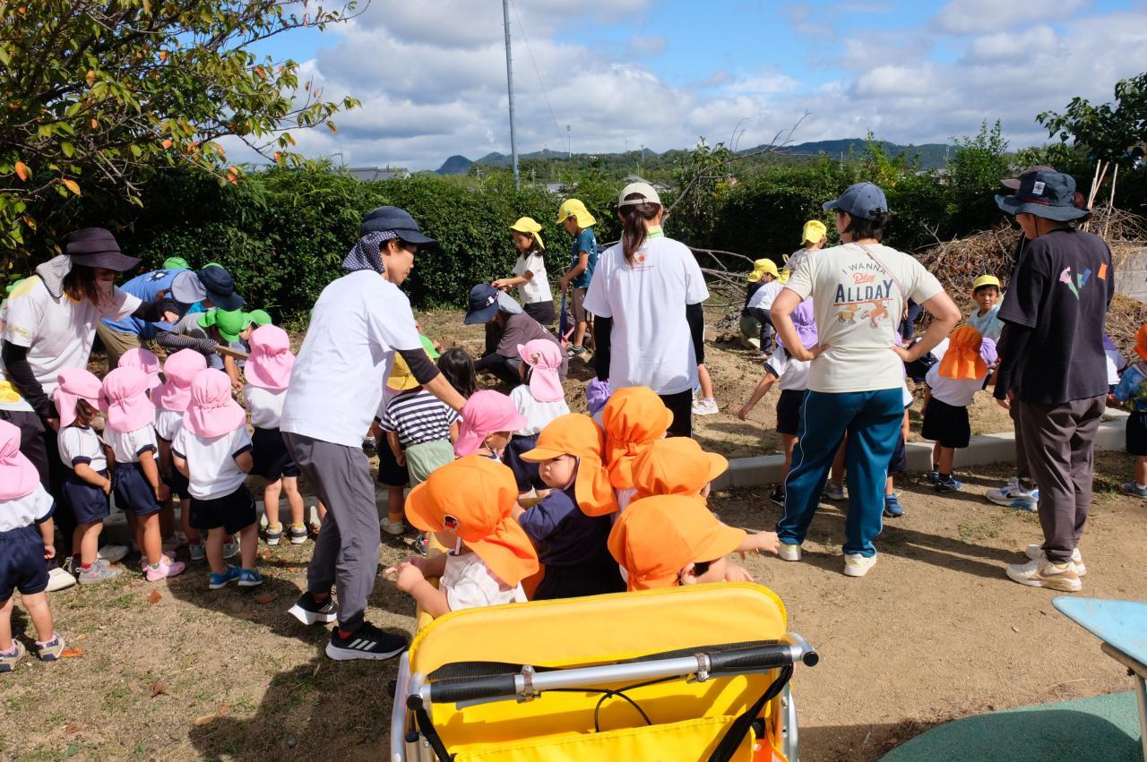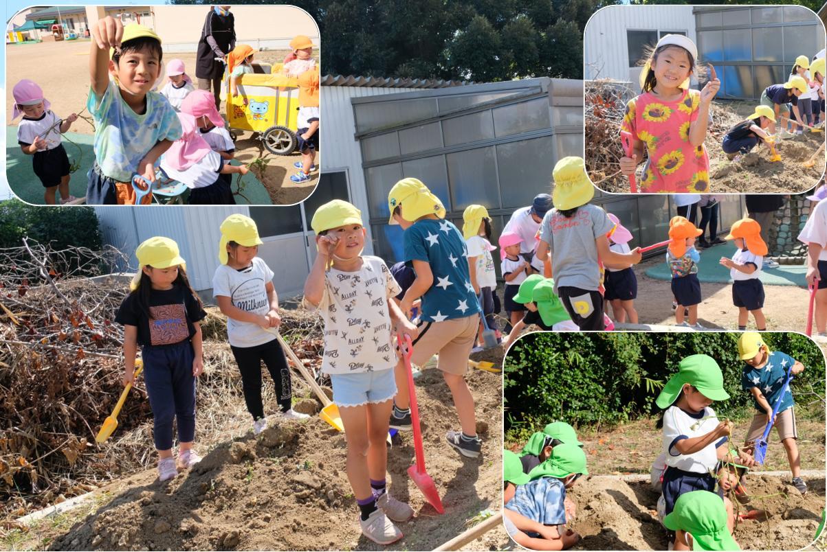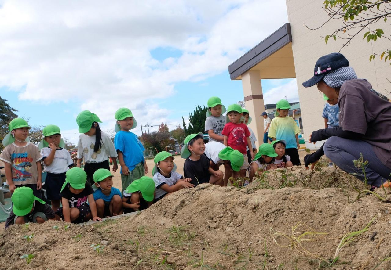 6月6日に植えたさつまいも。夏を乗り越え?いよいよ収穫の秋となりました。昨日、みんなの応援の中、ひまわり組とさくら組が畑を掘ったのですが・・・さつまいもと言えるものは一つも見つかりませんでした。残念・・・😫 栽培の専門家に聞くと、「さつまいもは植付のときお水をかけますが、その後は雨に任せて水をやる必要はなかったのです。でも、このところの夏はそれではさつまいもが育たなくなりました。水をやりながら育てることが必要になったようです。でも、やりすぎると根腐れを起こすので、そこが難しいところです。」ということでした。来年、みんなでがんばりたいと思います。