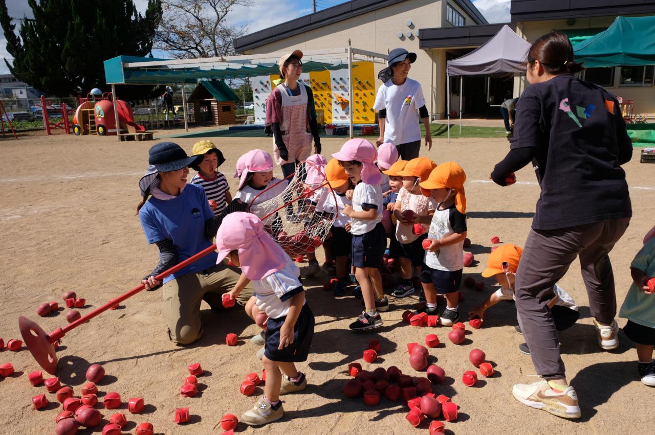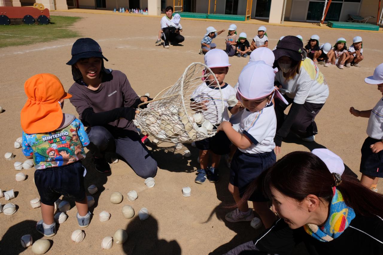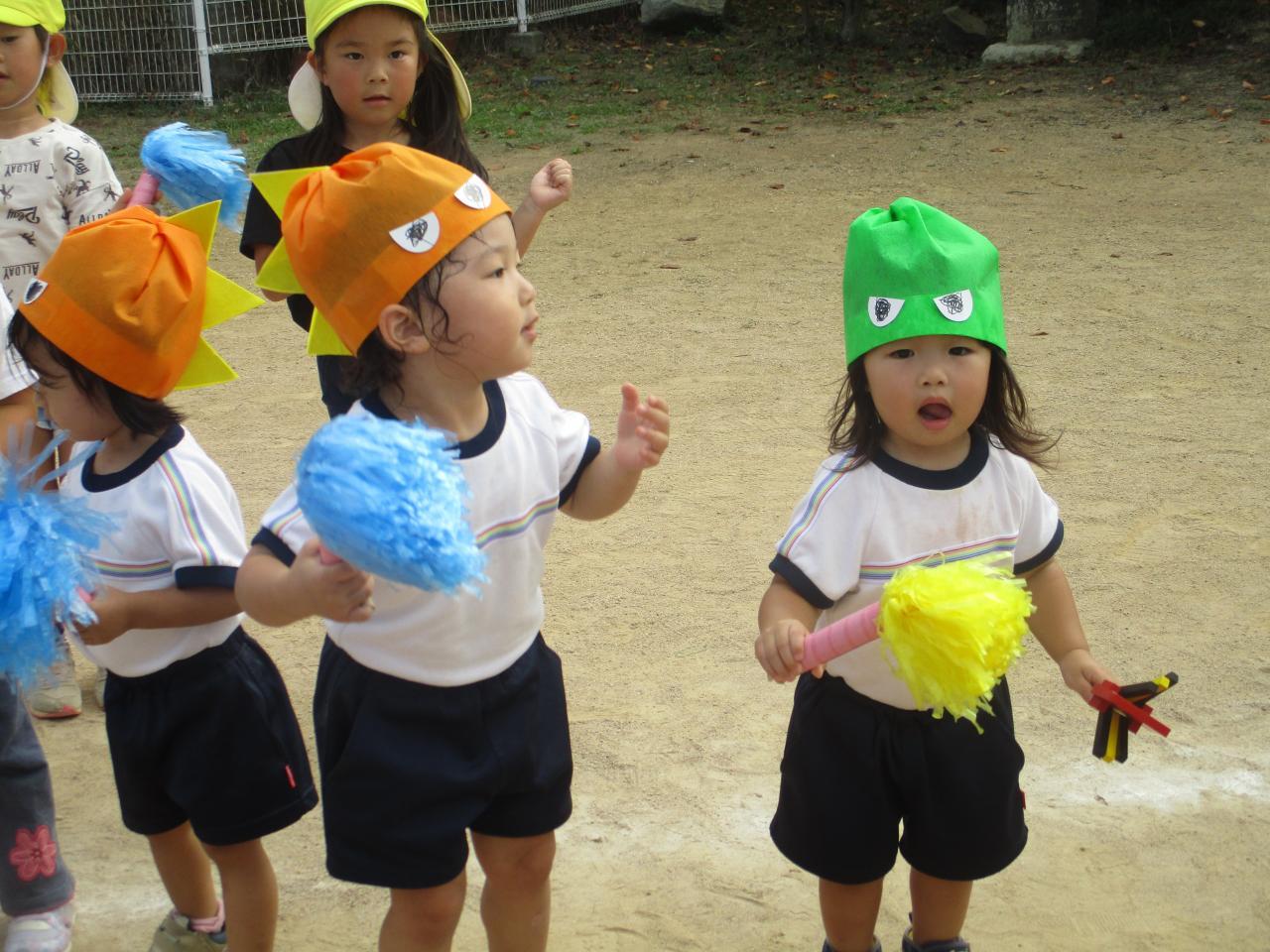 「育児園みんなで運動会ごっこ。いろいろなクラスの衣装を身につけ、いろいろなクラスのダンスをしたり、玉入れに参加させてもらったりして、これまでの練習とは違う特別な雰囲気を2歳児さんなりに感じていた様子でした💚 お兄さん・お姉さんの種目で特に上手だったのは、3歳児さんの恐竜ダンス♪ 「ガオー!」」と、ノリノリでなりきていました! 同じ時を楽しんで何か芽生えたのか、その後の外遊びではいつもより他のクラスとの関わりが多かったような・・・💛