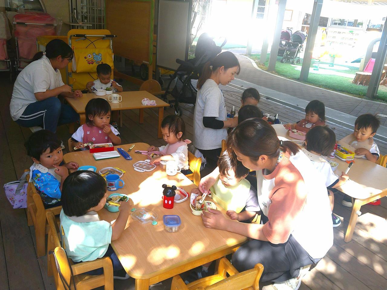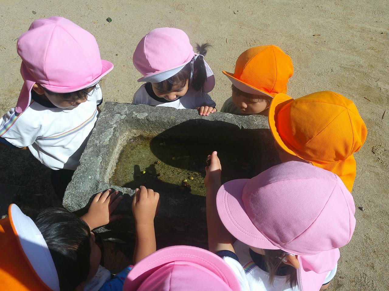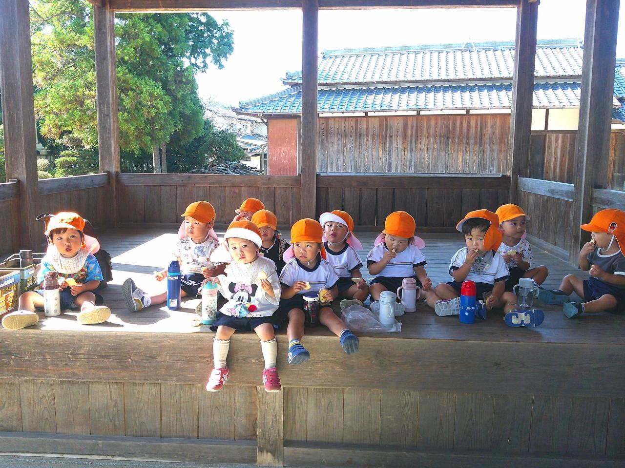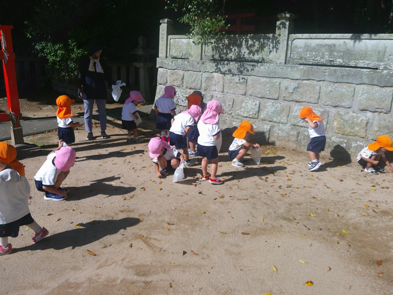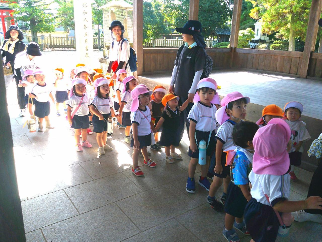 「遠足日和の中、すみれ組のお友だちと一緒に高岡稲荷神社へLet’go💨 今までにない長距離でしたが、なんと、行き帰り共にすみれ組さんにリードしてもらいながら、しっかり歩きました~✨ すご~い✨ 神社でお参り後、おやつTime、どんぐり拾い、相撲、探索活動などを楽しんでいる中、どんぐりを拾ったお友だちがどんぐりプールを作っているのを発見!! 数人が集まり、水に沈むどんぐりを面白そうに観察していました! 次々と拾い、ポトンポトンと水の中に落として、どんぐりの様子や水の動きを楽しんでいて、興味津々な子どもたちでした🌟 どんぐりプールかぁ・・・新しい秋の遊びだなぁ☺ ランチタイムはママの手作りお弁当をパクパク💛 ママ、ありがとう💚 楽しい遠足になりました✿」・・・もも1組より