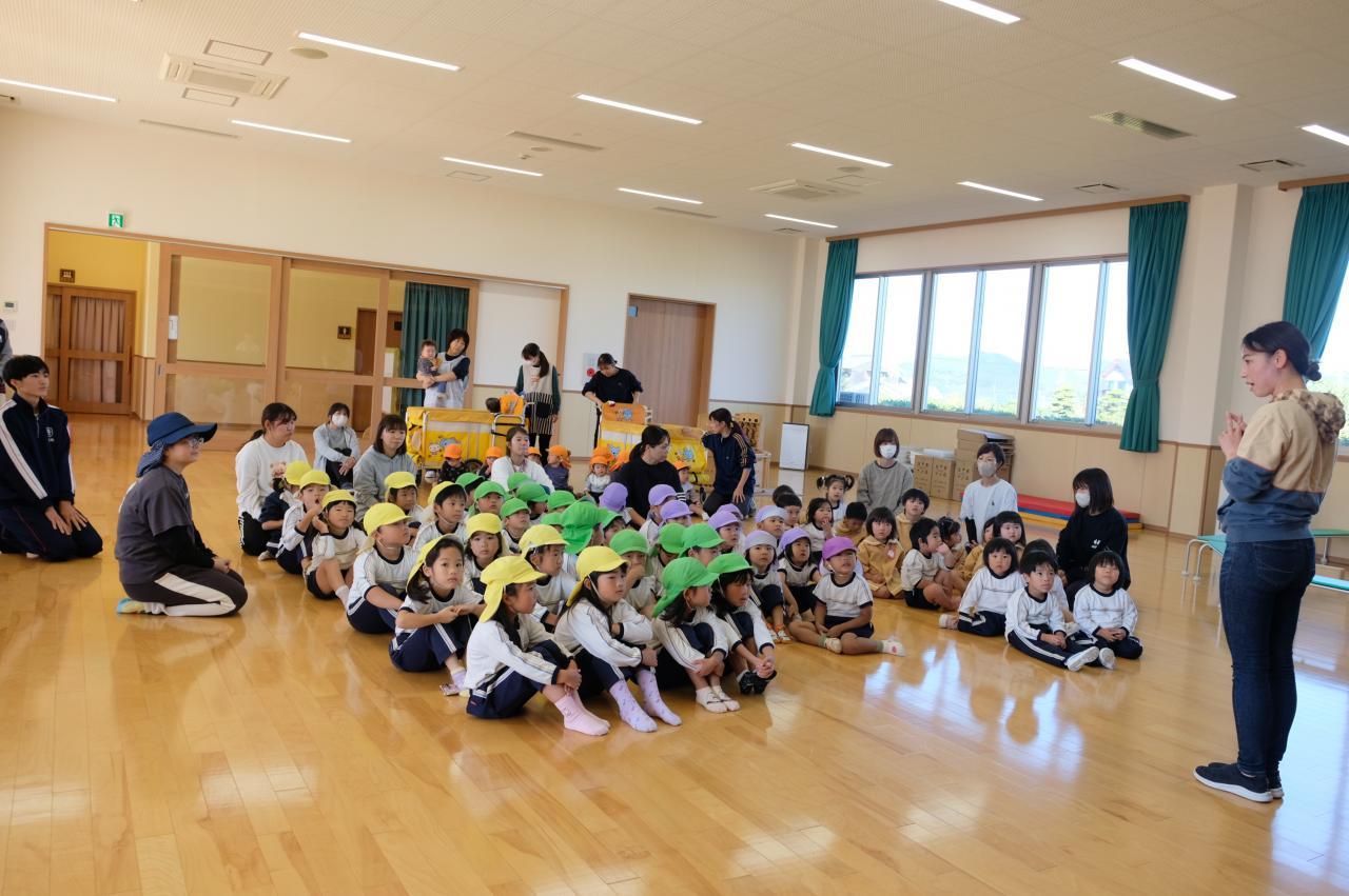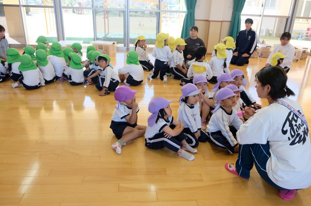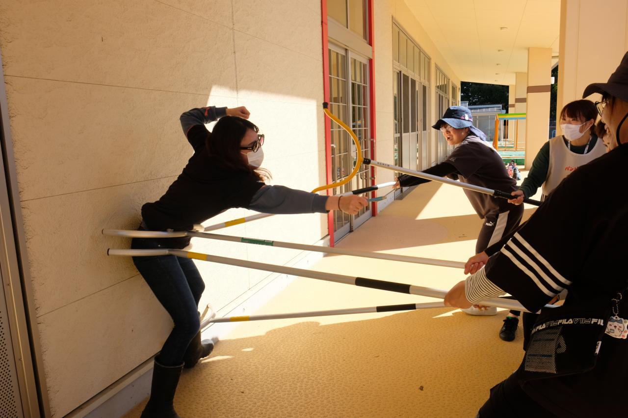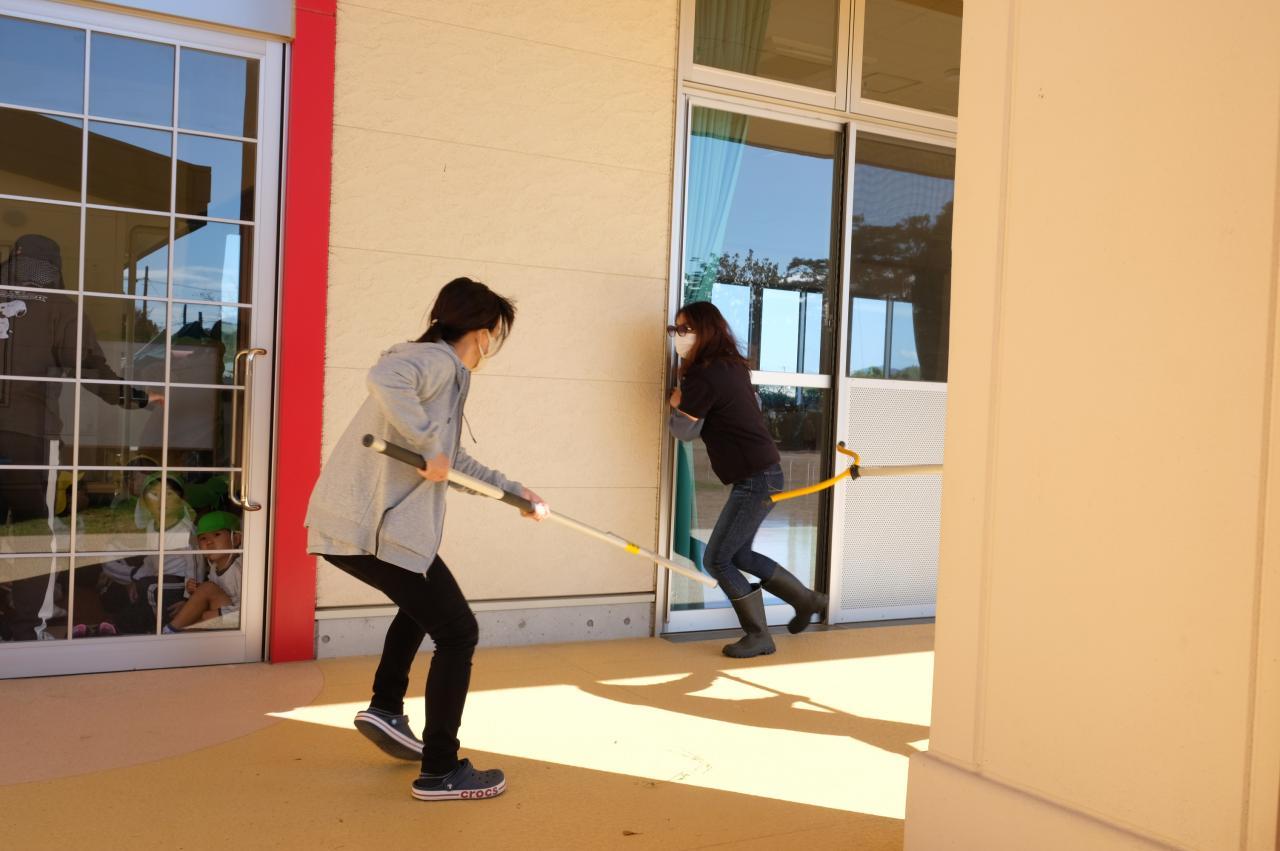 先日、不審者対応の避難訓練を行いました。今回は、園児が運動場で遊んでいるときに不審者がフェンスの外に現れ、その後園内に侵入するという初めての訓練場面にしました。園児は、これまでの訓練を生かし、先生の指示に従って保育室や遊戯室に速やかに避難しました。しかし、園児は不審者か近所の人か見分けがつかないので近づいてしまう、まずは不審者を侵入させないようにすることが大切、保育室以外の部屋に避難した時の対応の仕方、女性だけでの不審者確保はたくさんの人数がいる(「急所を蹴ったらええねん」😫という勇ましい声もかかりましたが・・・)など、たくさんの課題も見つかりました。対応していきます。