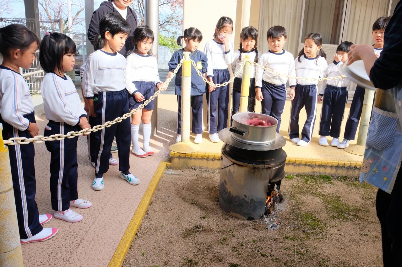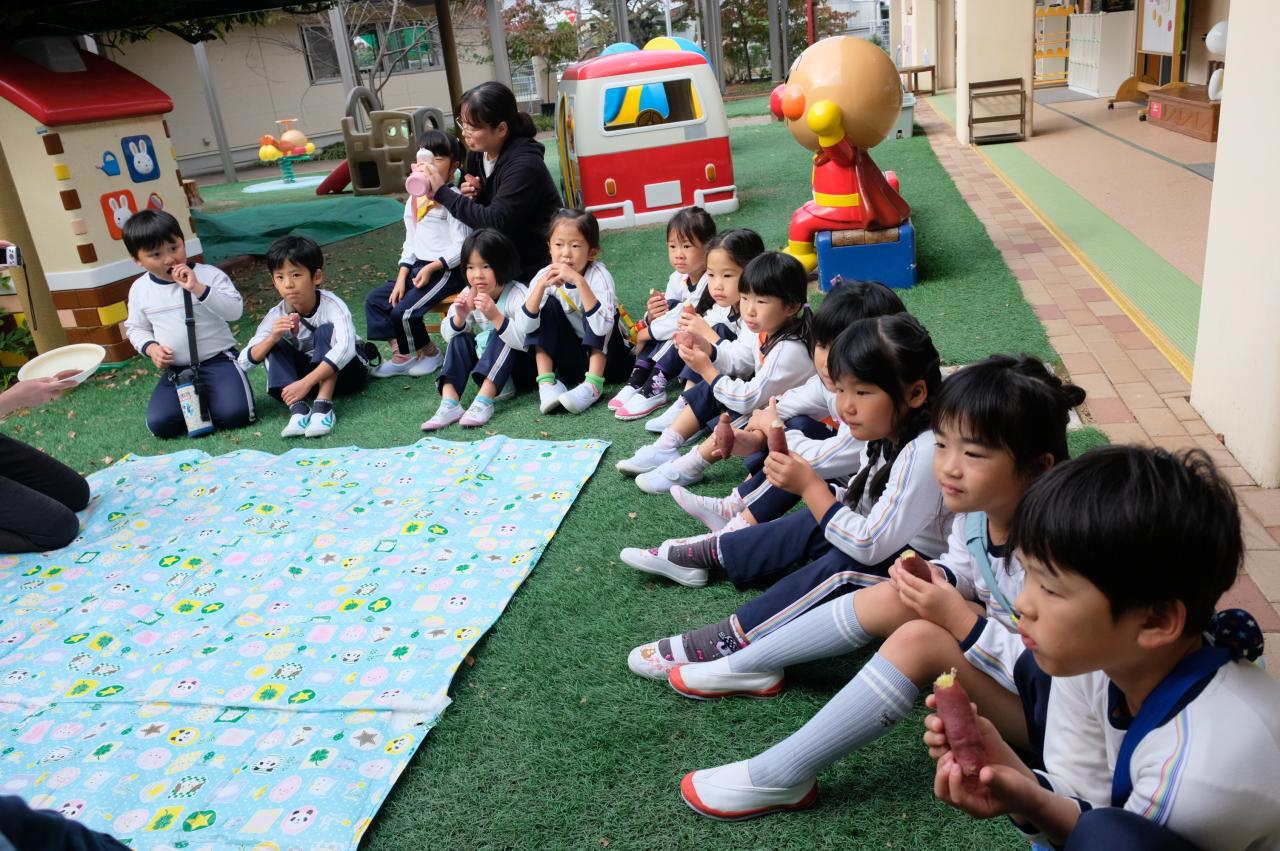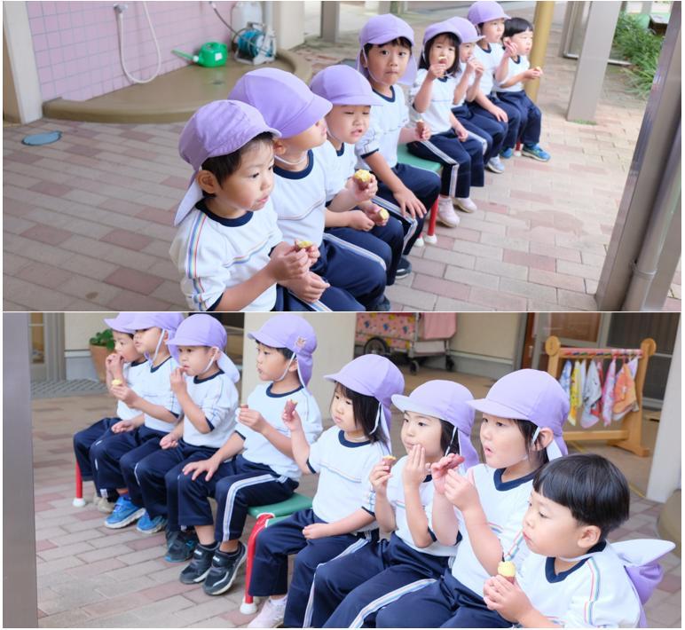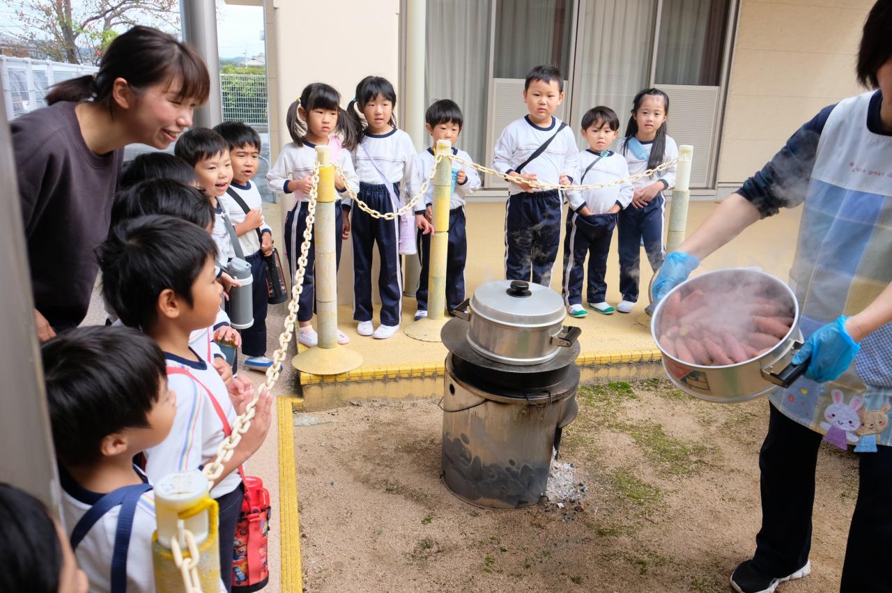 今年は園の畑のさつま芋の育ちがよくなかったので、地域の方がご厚意でくださったさつま芋を使って「ふかし芋会」を開きました。朝早くからさくら組とひまわり組がせっせといもを洗い、薪を焚いてお湯を沸かし、蒸し器を使ってふかし芋を作りました。湯気とともにいい匂いが園庭に広がります。そして、「おいしーー」の声と笑顔が広がりました。食べやすいようにスティック状に切ってもらったふかし芋を見せると、つかみ取って無心に口に押し込む0歳児クラスの子もいました。美味しいものとすぐ分かるのでしょうね。もっともっととせがむ姿が可愛かったです。